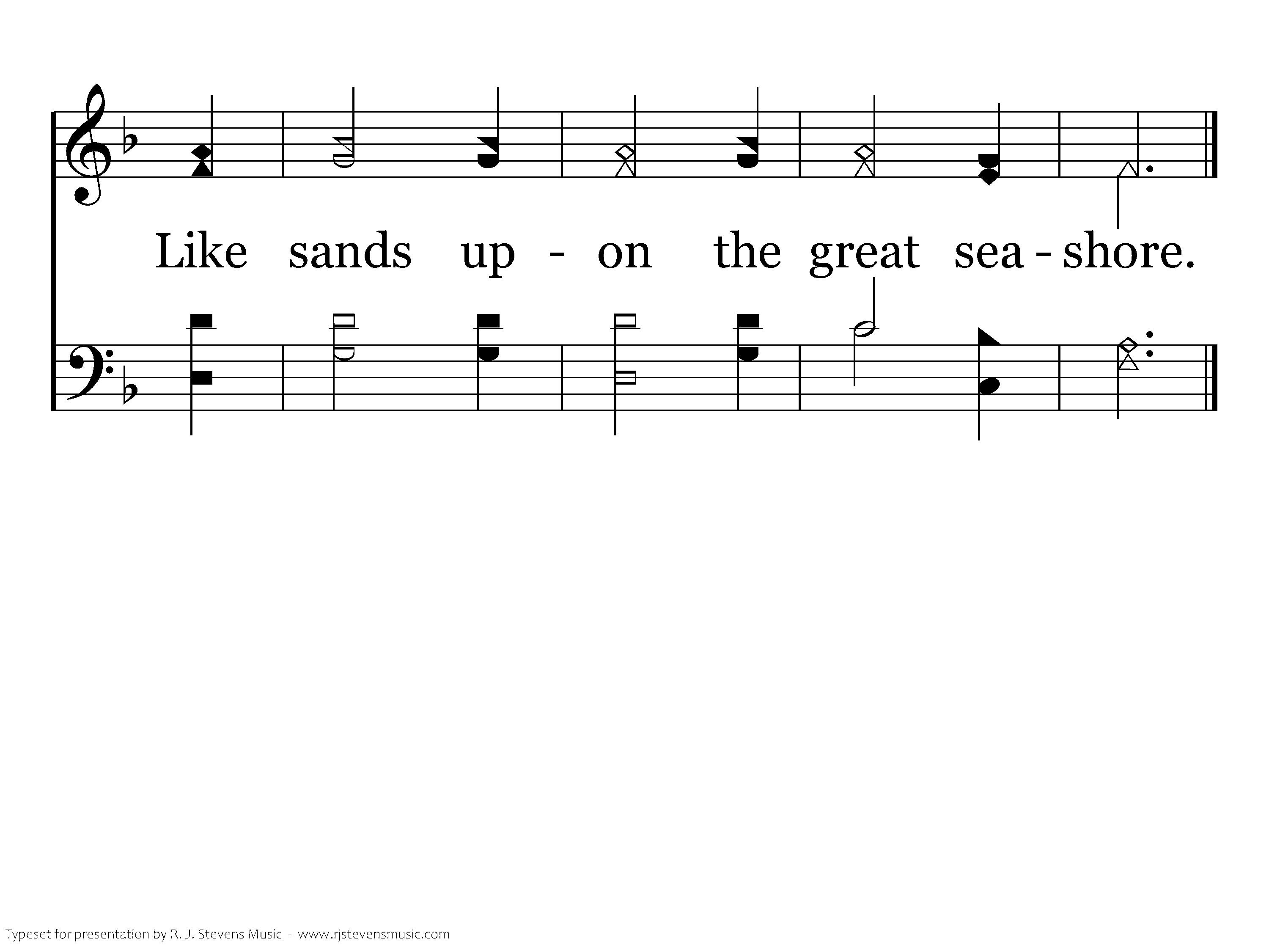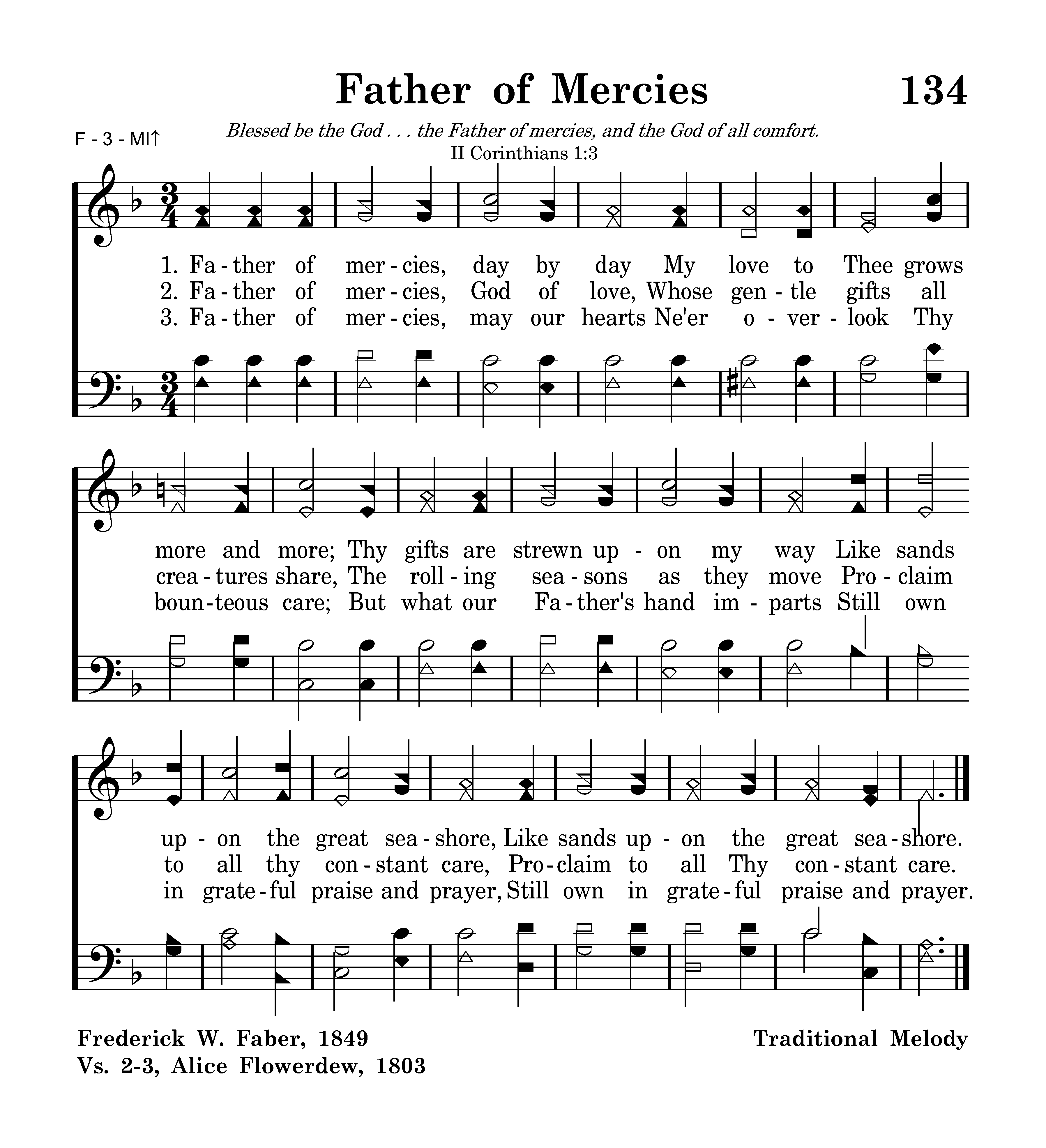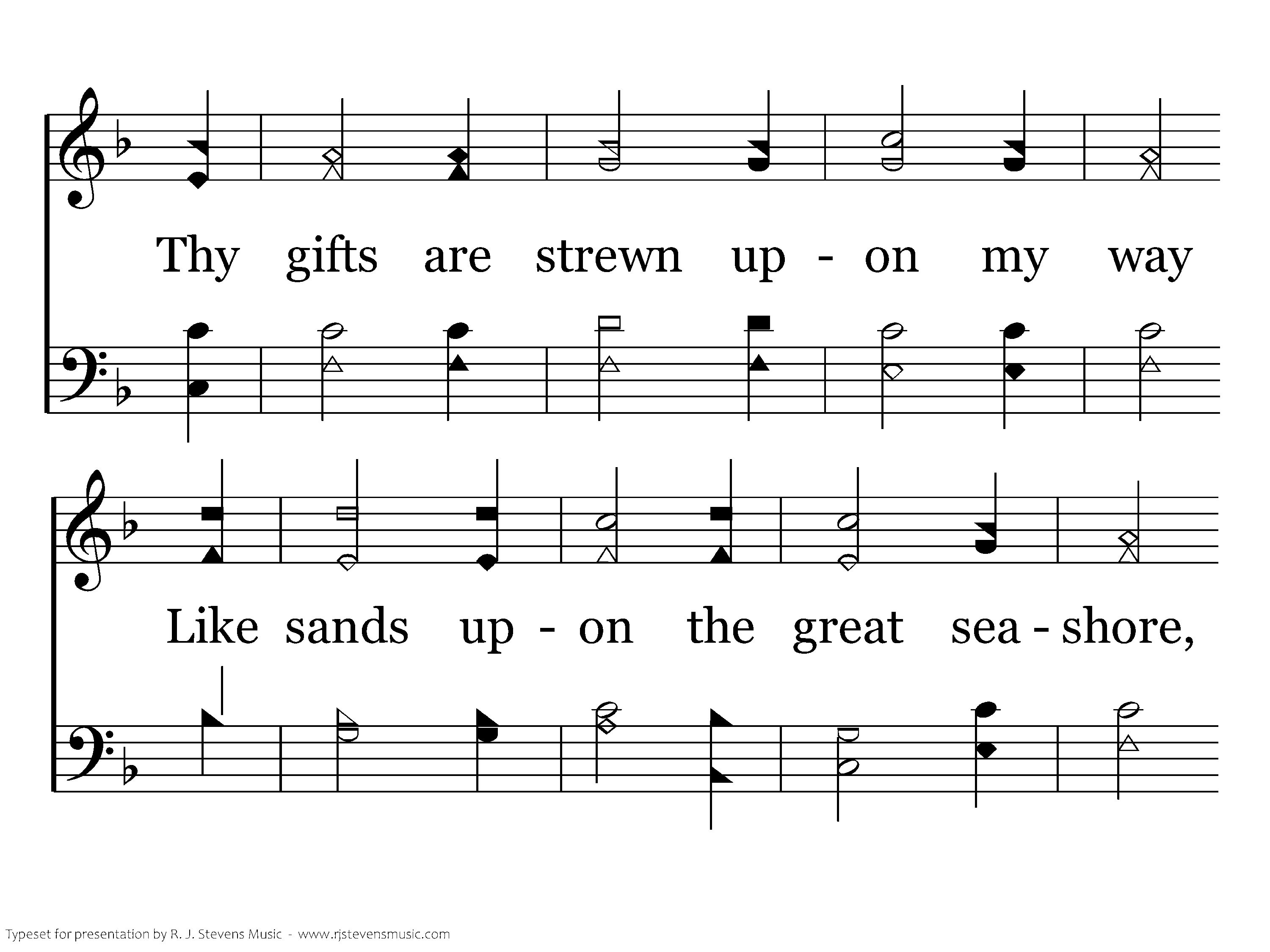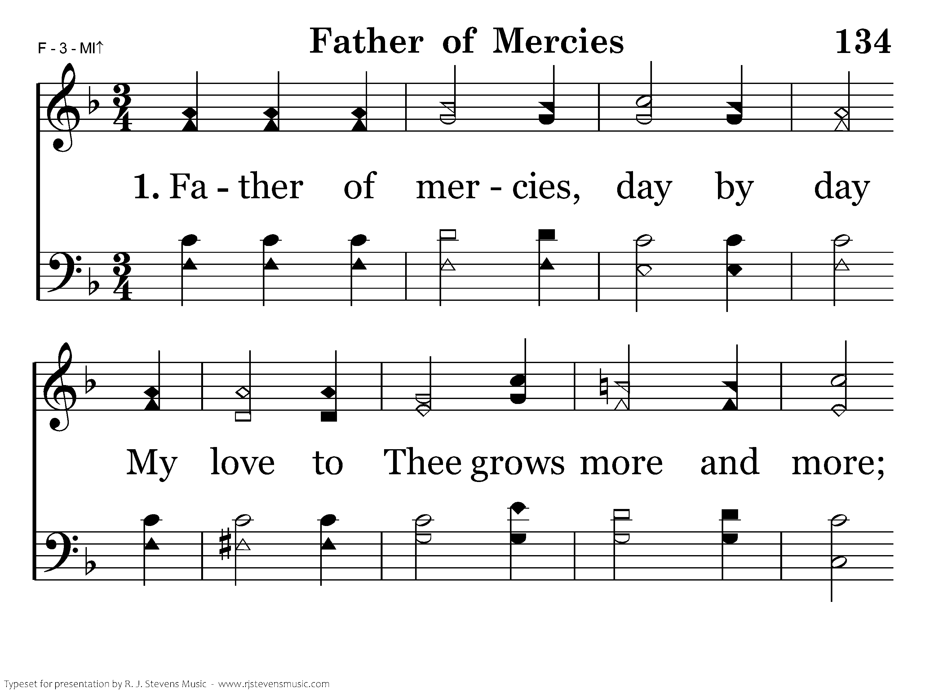Father of mercies, day by day My love to Thee grows more and more; Thy gifts are strewn up my way Like sands upon the great seashore, Like sands upon the great seashore.