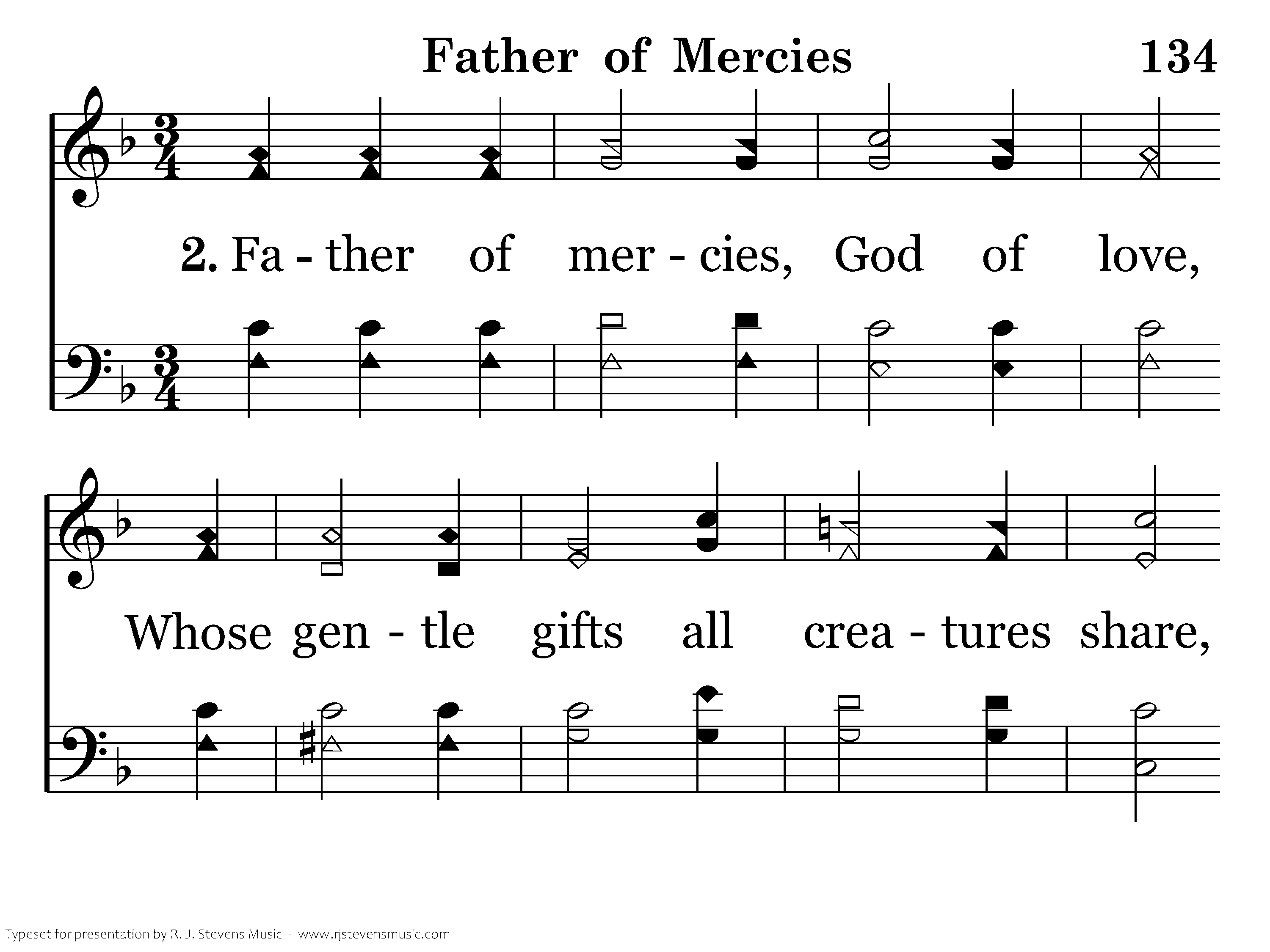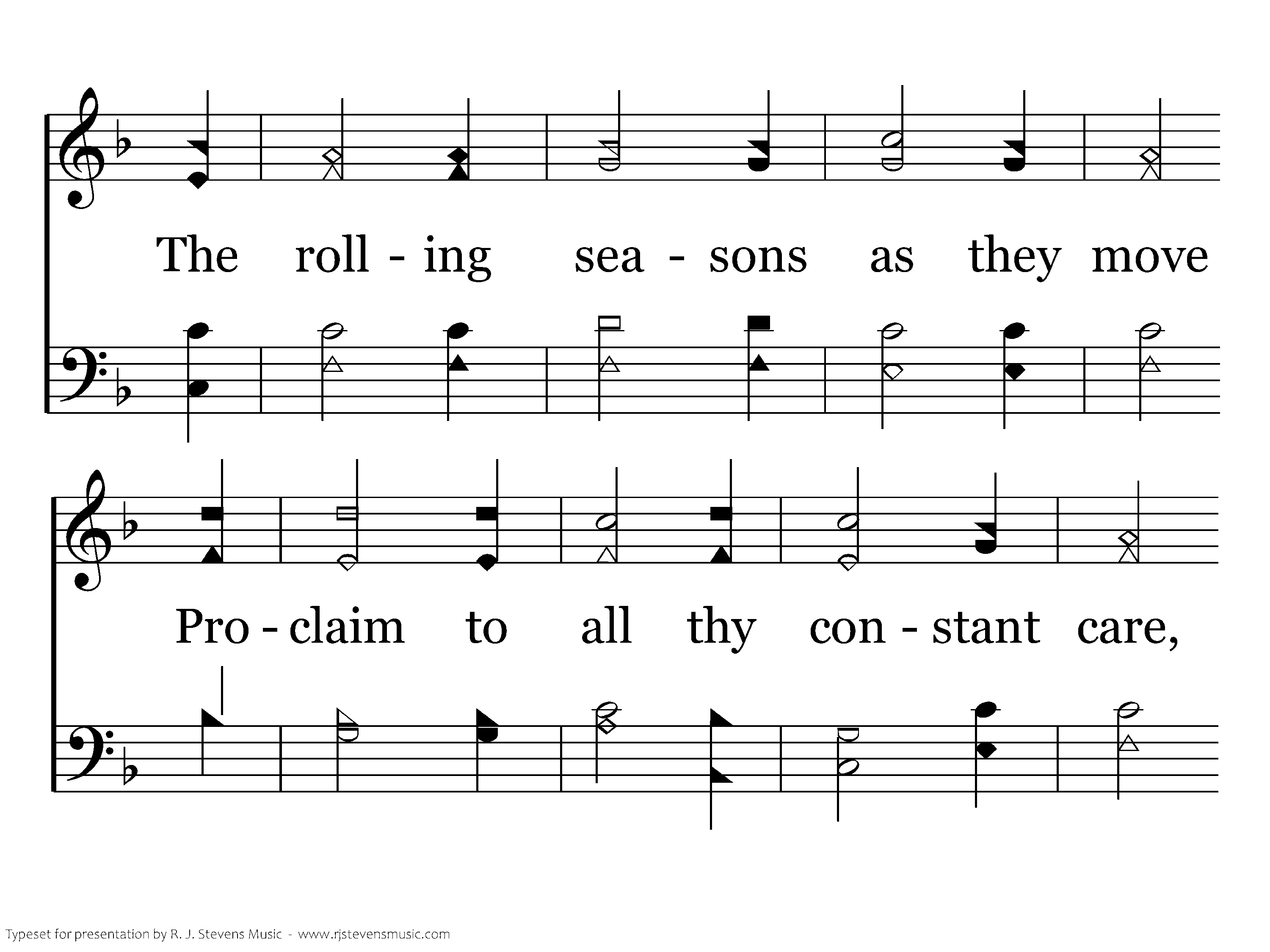 Father of mercies, God of love, Whose gentle gifts all creatures share, The rolling seasons as they move Proclaim to all Thy constant care, Proclaim to all Thy constant care.