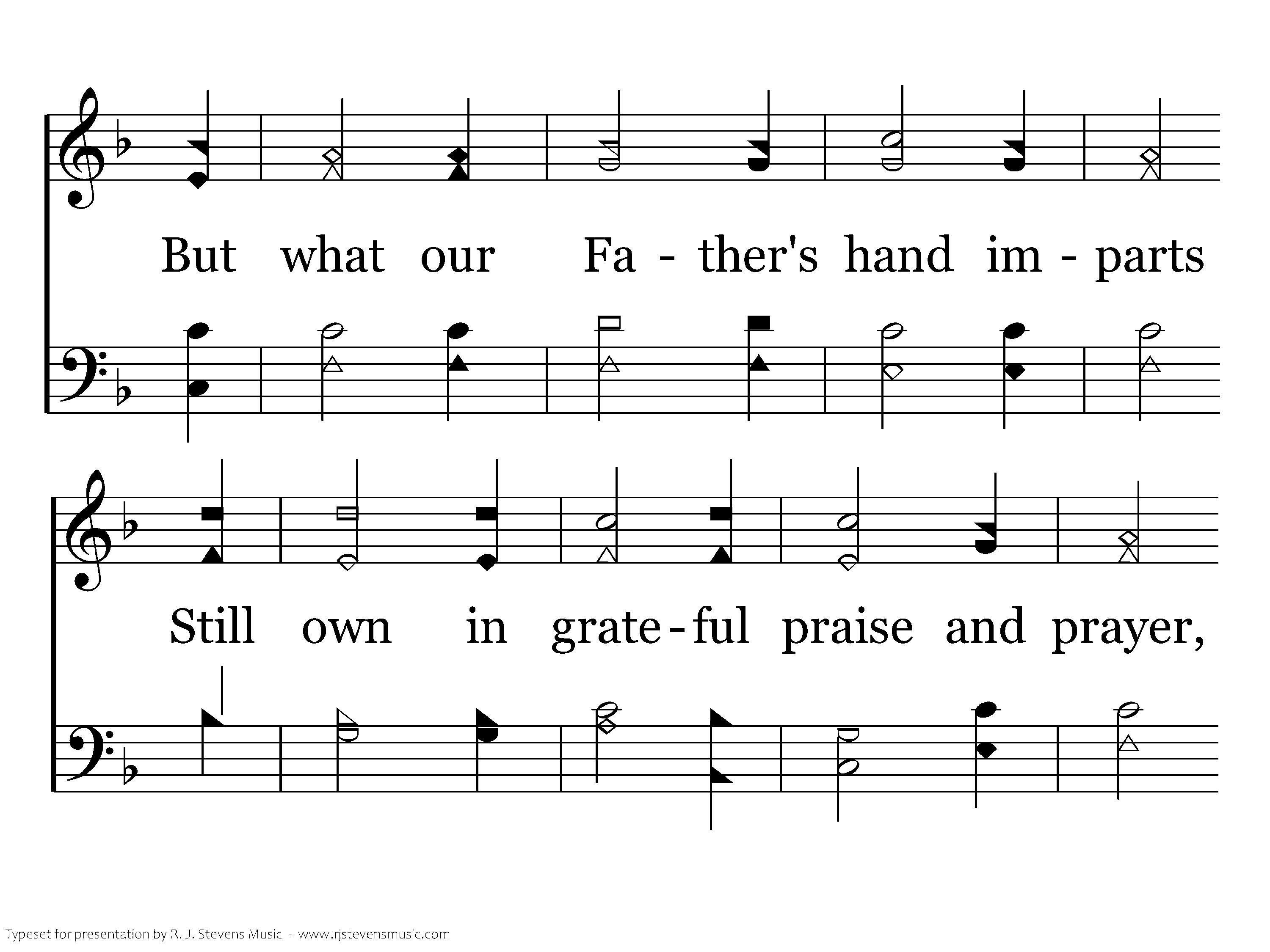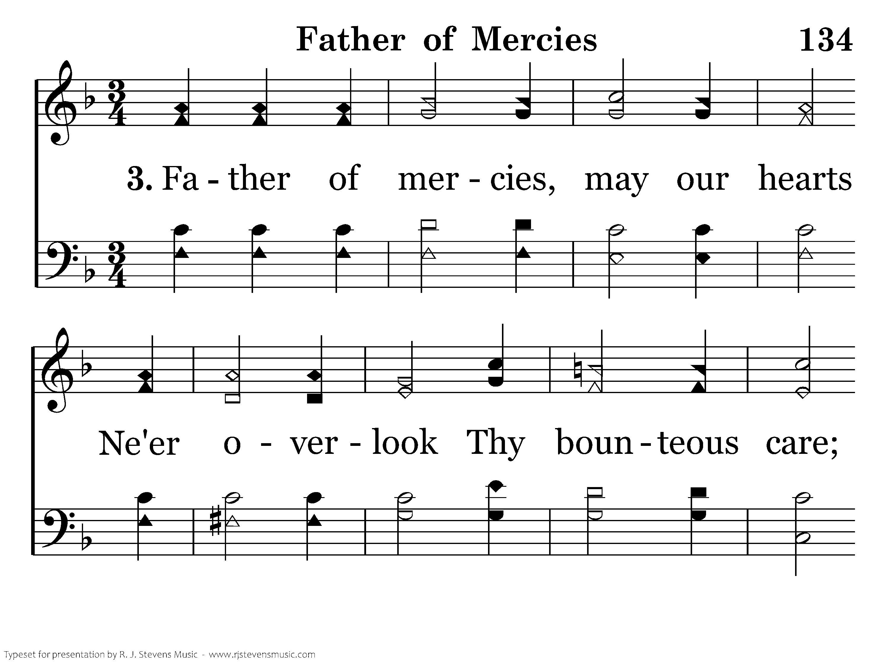 Father of mercies, may our hearts Ne'er overlook Thy bounteous care; But what our Father's hand imparts Still own in grateful praise and prayer, Still own in grateful praise and prayer.
