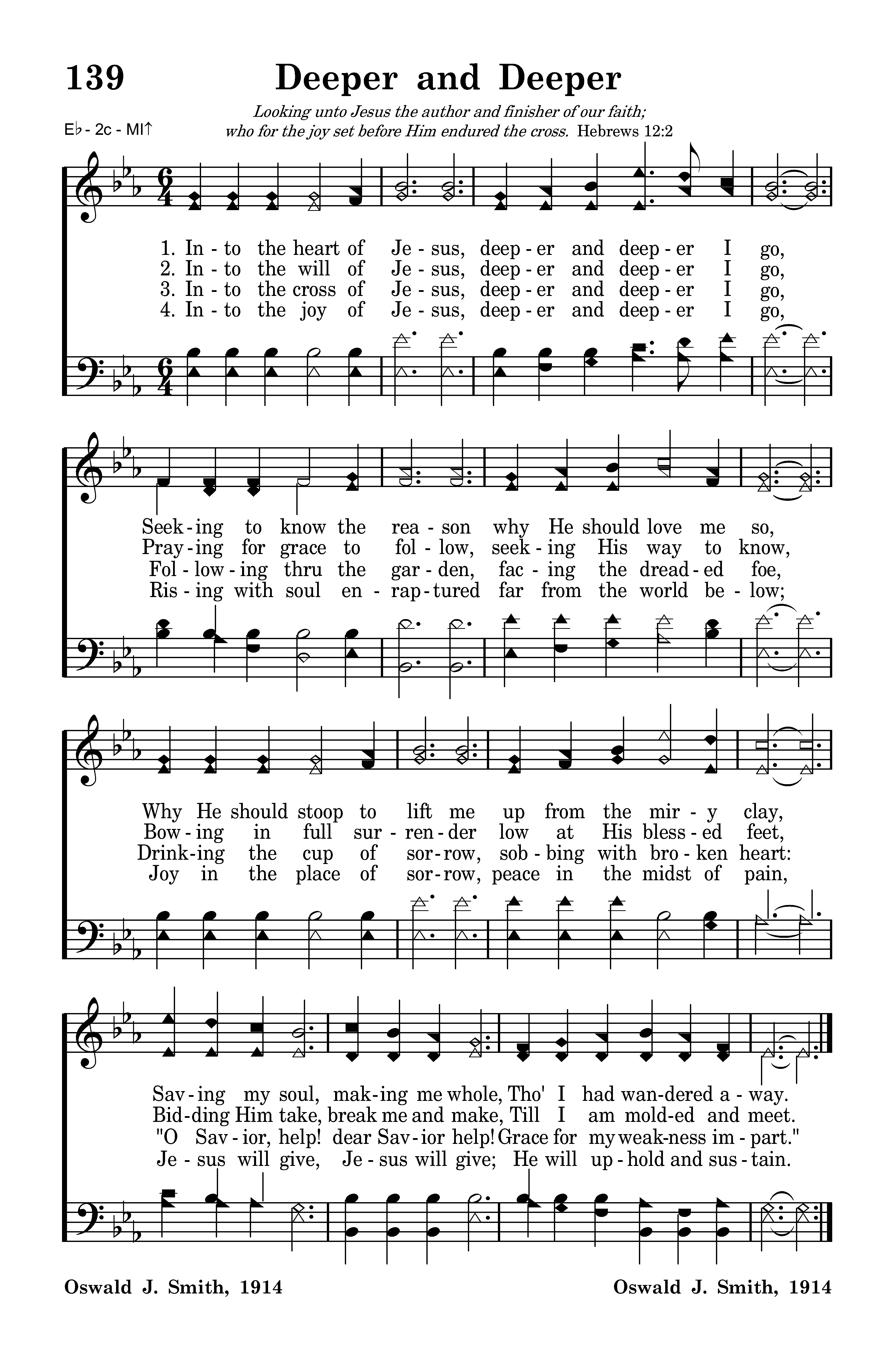Into the heart of Jesus, Deeper and deeper I go, Seeking to know the reason why He should love me so, Why he should stoop to lift me up from the miry clay, Saving my soul, making me whole, Tho I had wandered away.