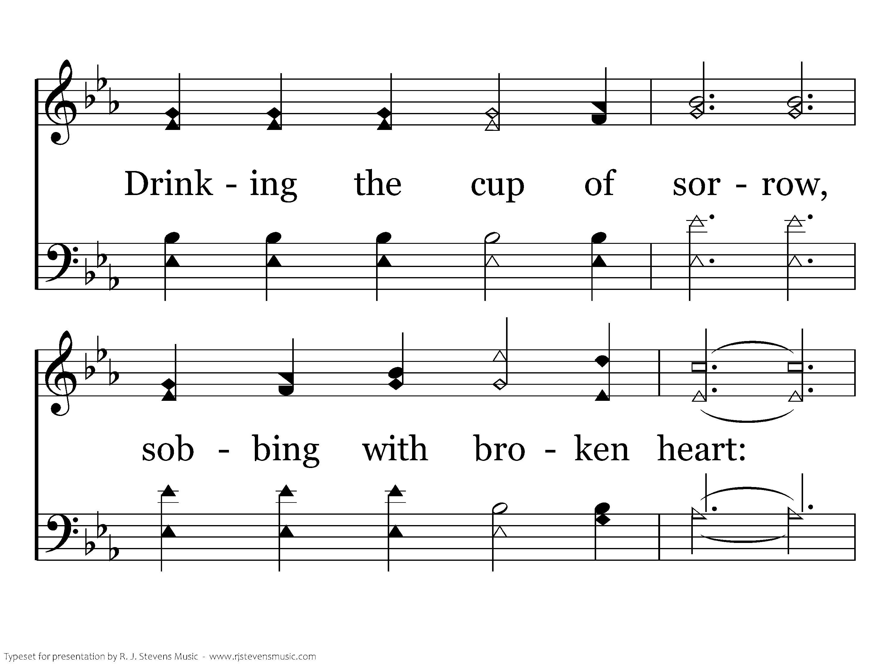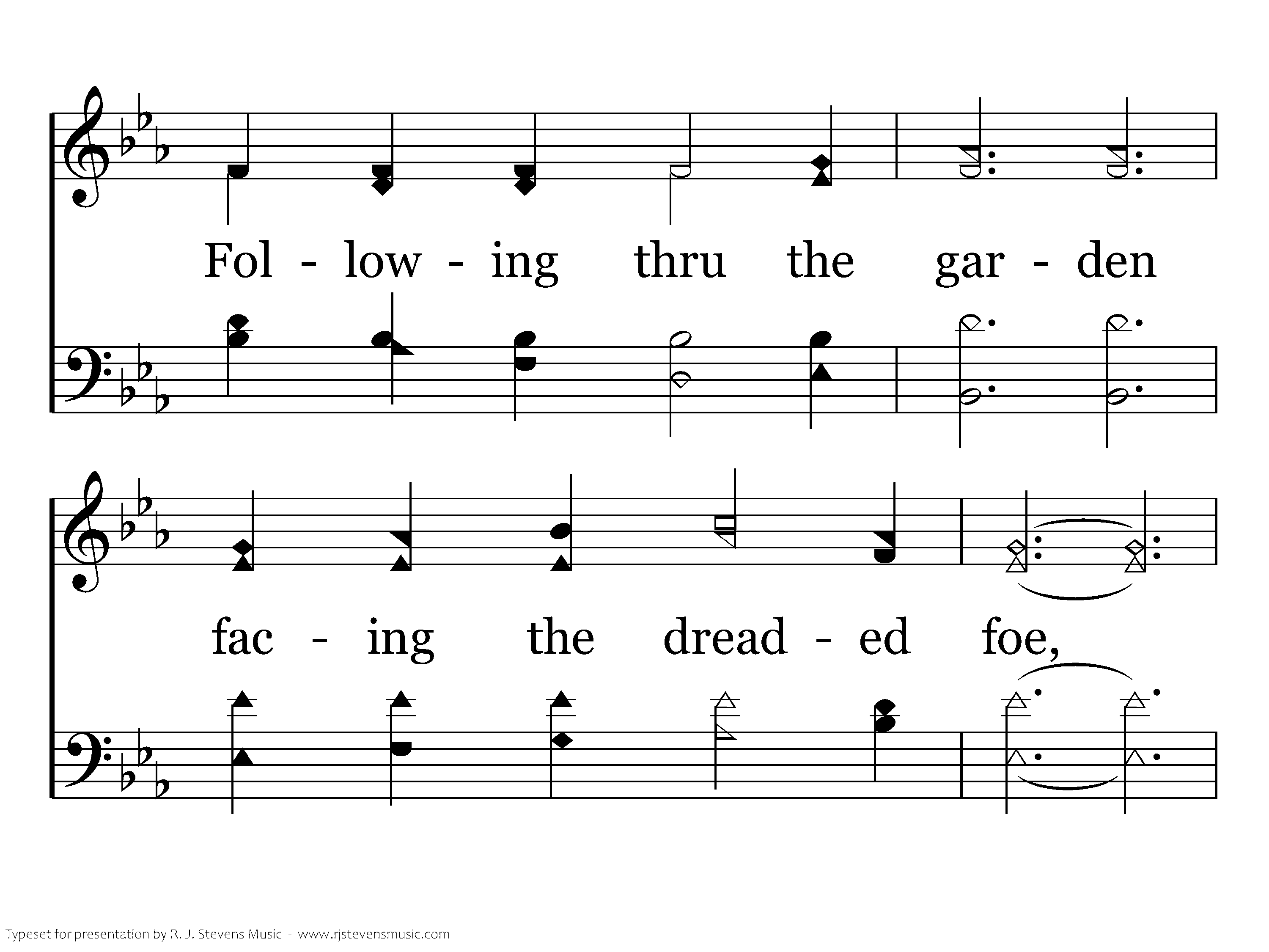 Into the heart of Jesus, Deeper and deeper I go, Following thru the garden facing the dreaded foe, Drinking the cup of sorrow, sobbing with broken heart: "O Savior, help! Dear Savior, help! Grace for my weakness impart."