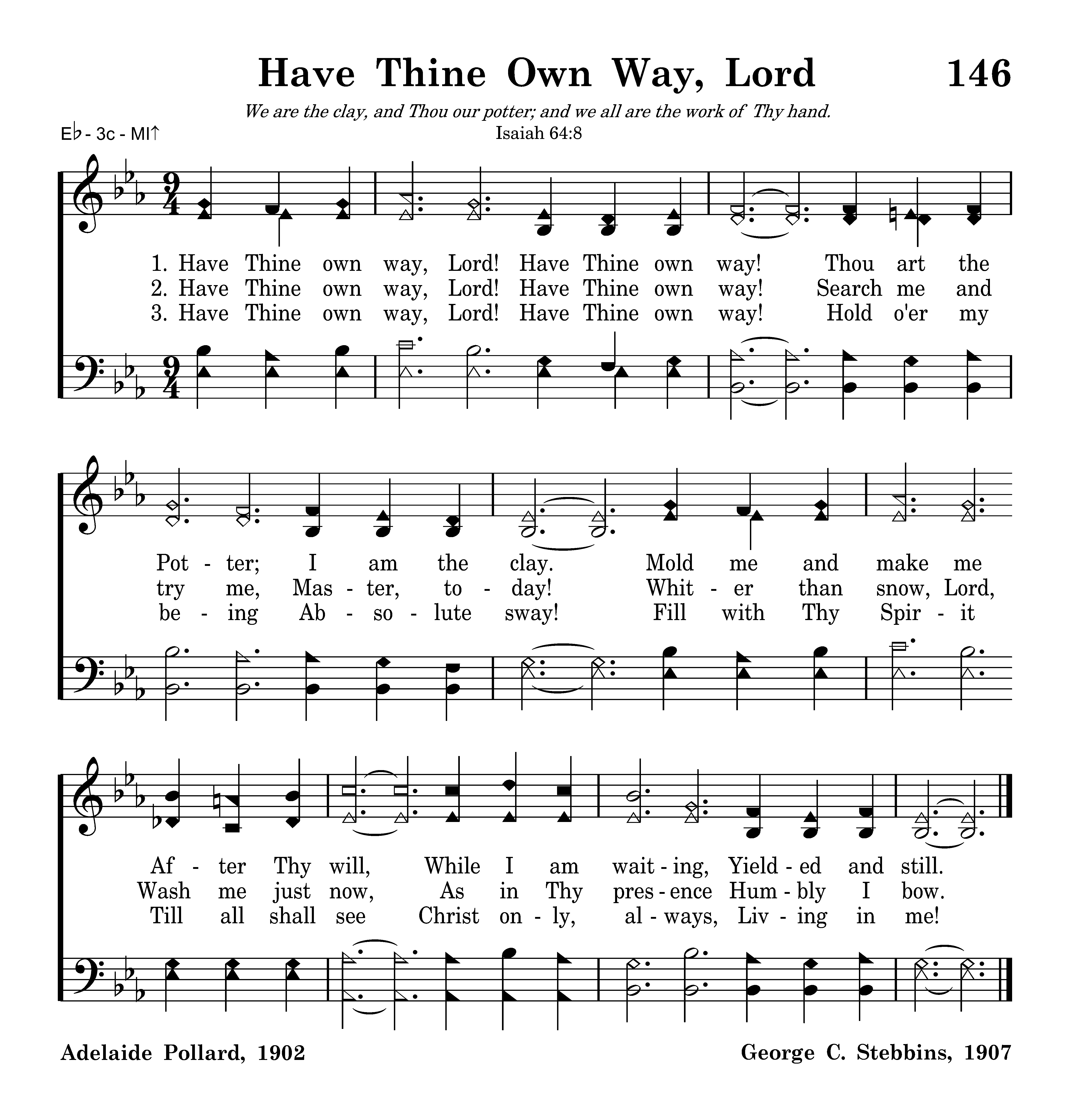 Have thine own way, Lord! Have thine own way! Thou art the potter, I am the clay. Mold me and make me After thy will, While I am waiting, Yielded and still.