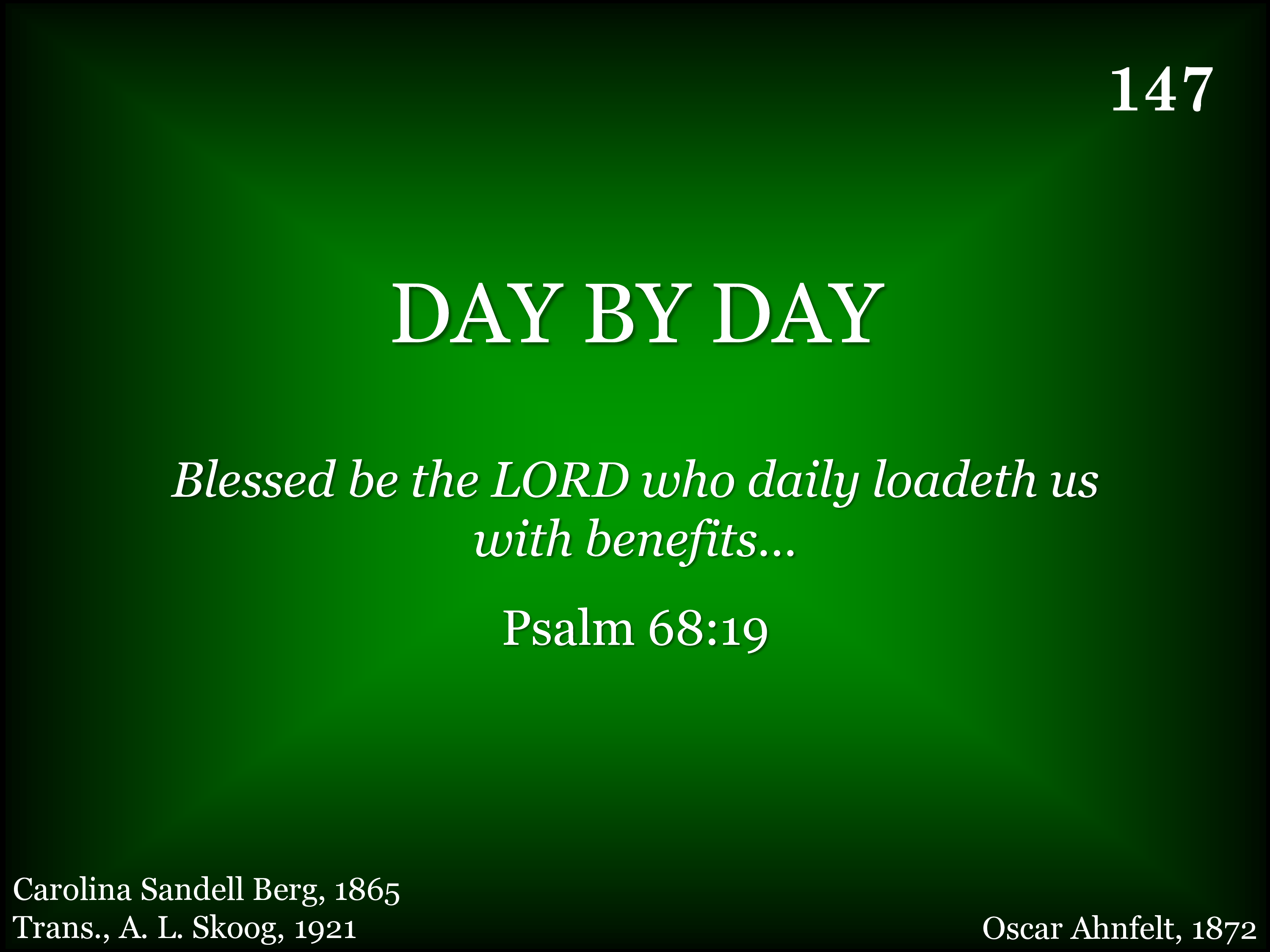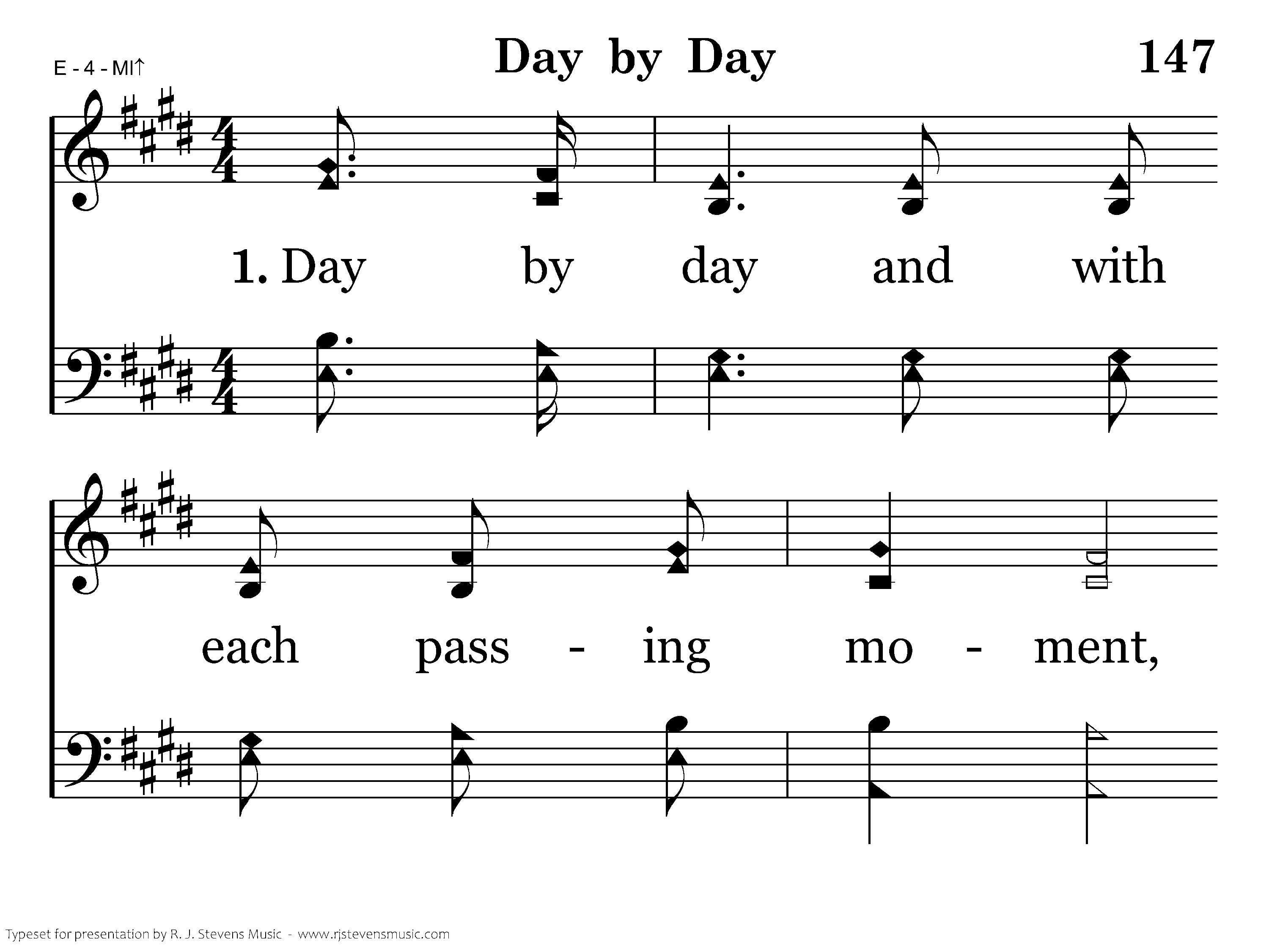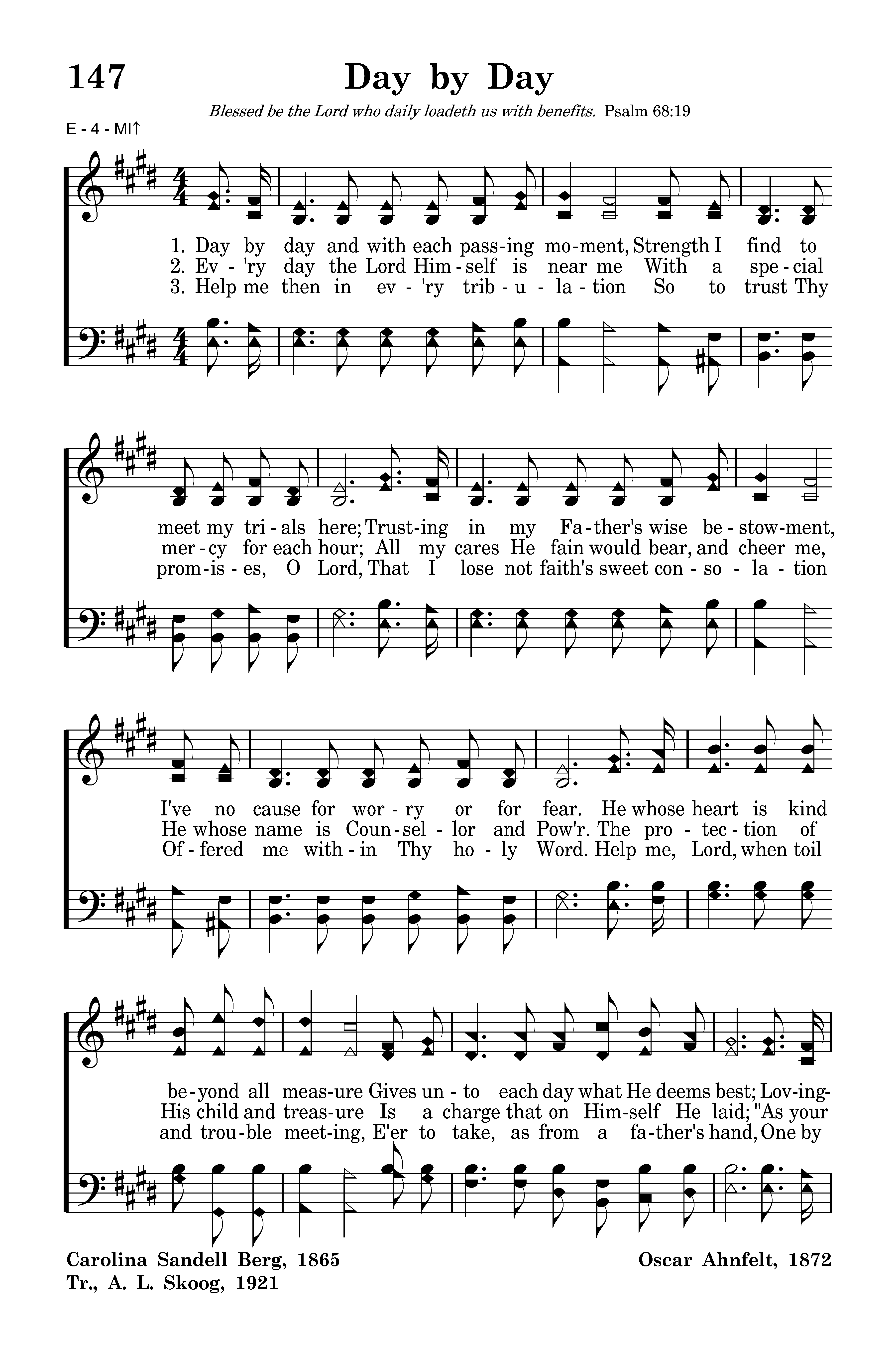 Day by day and with each passing moment, Strength I find to meet my trials here; Trusting in my Father's wise bestowment, I've no cause for worry or for fear. He, whose heart is kind beyond all measure Gives unto each day what he deems best. Lovingly, it's part of pain and pleasure, Mingling toil and peace and rest.