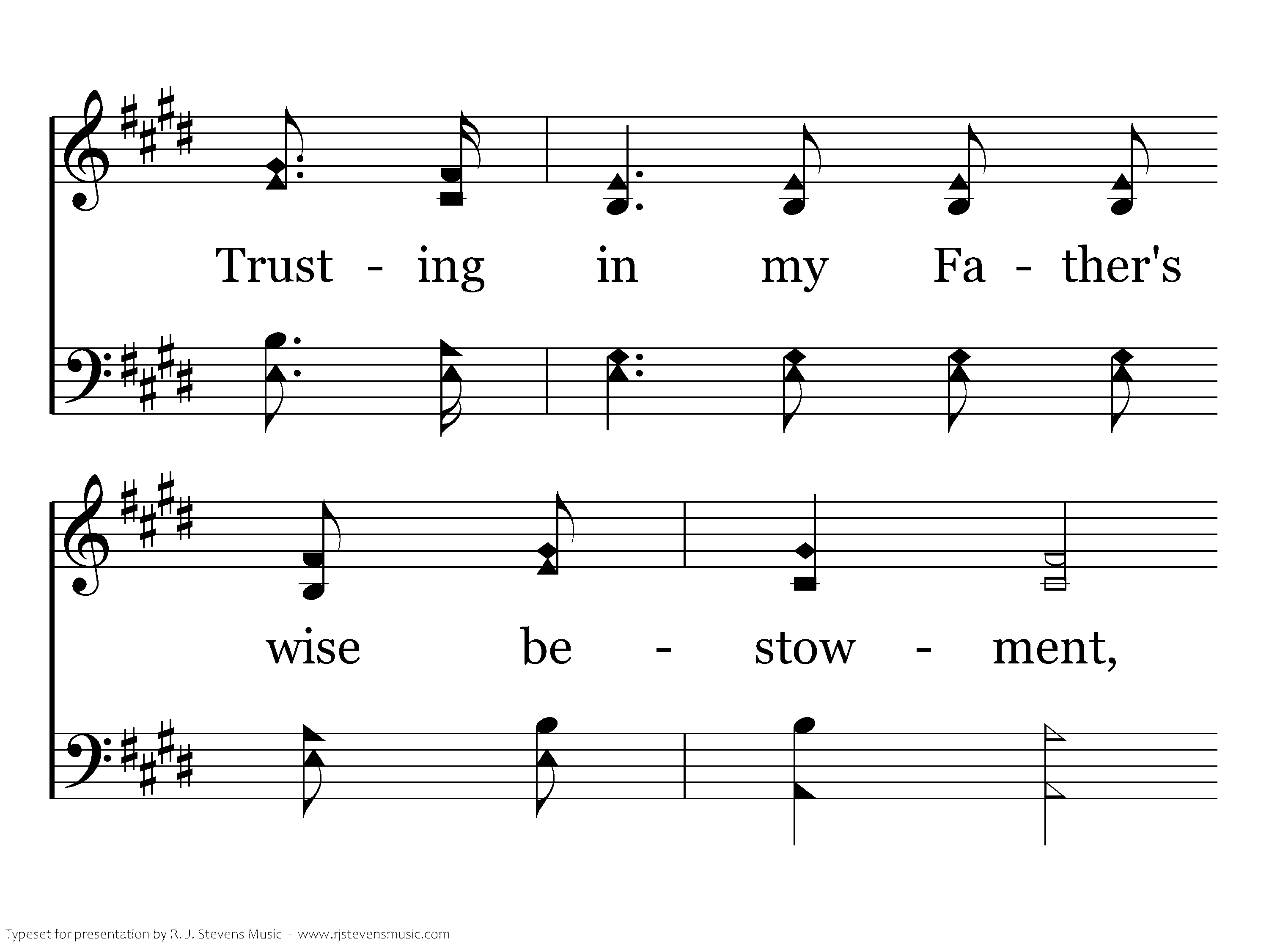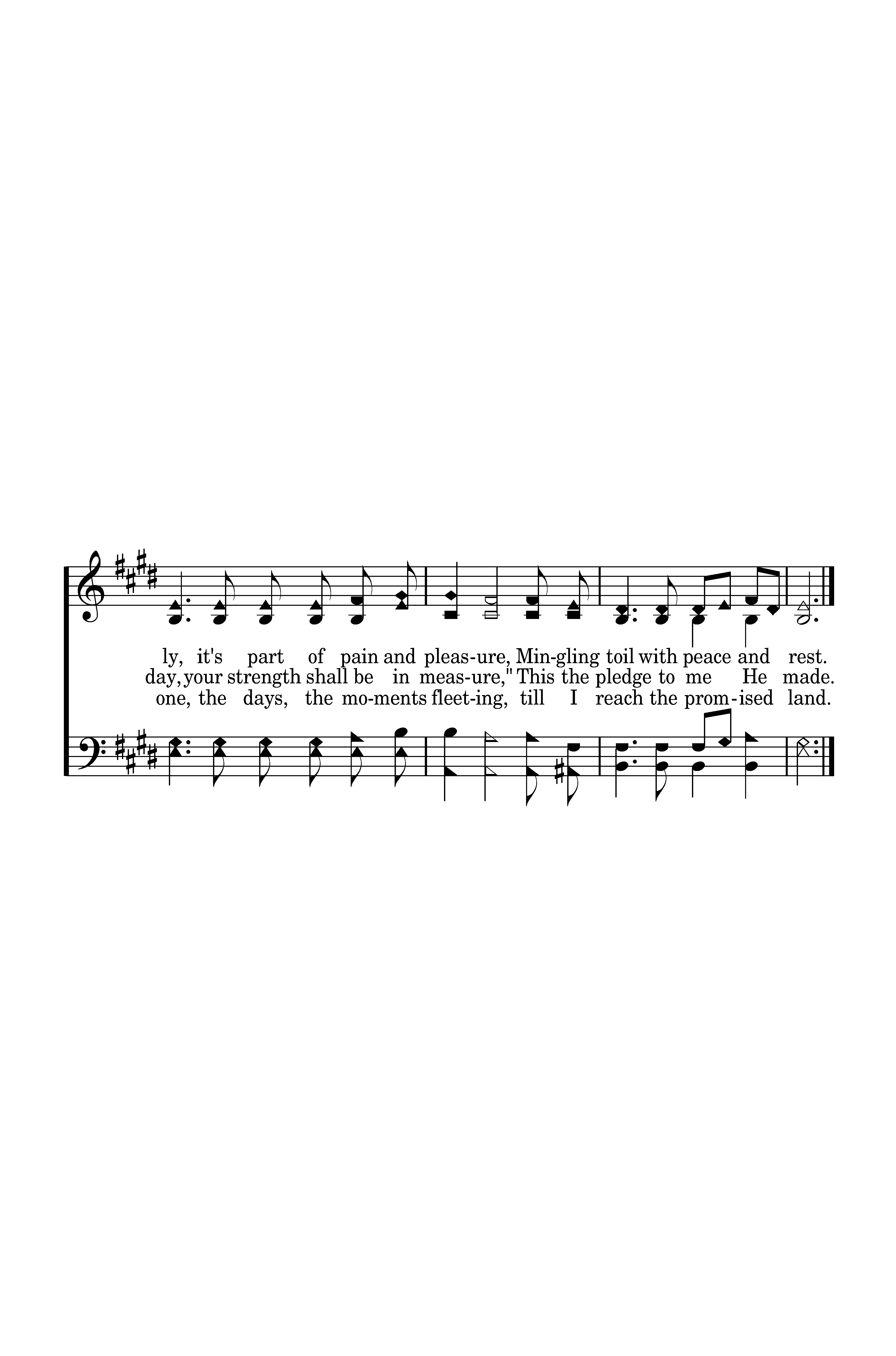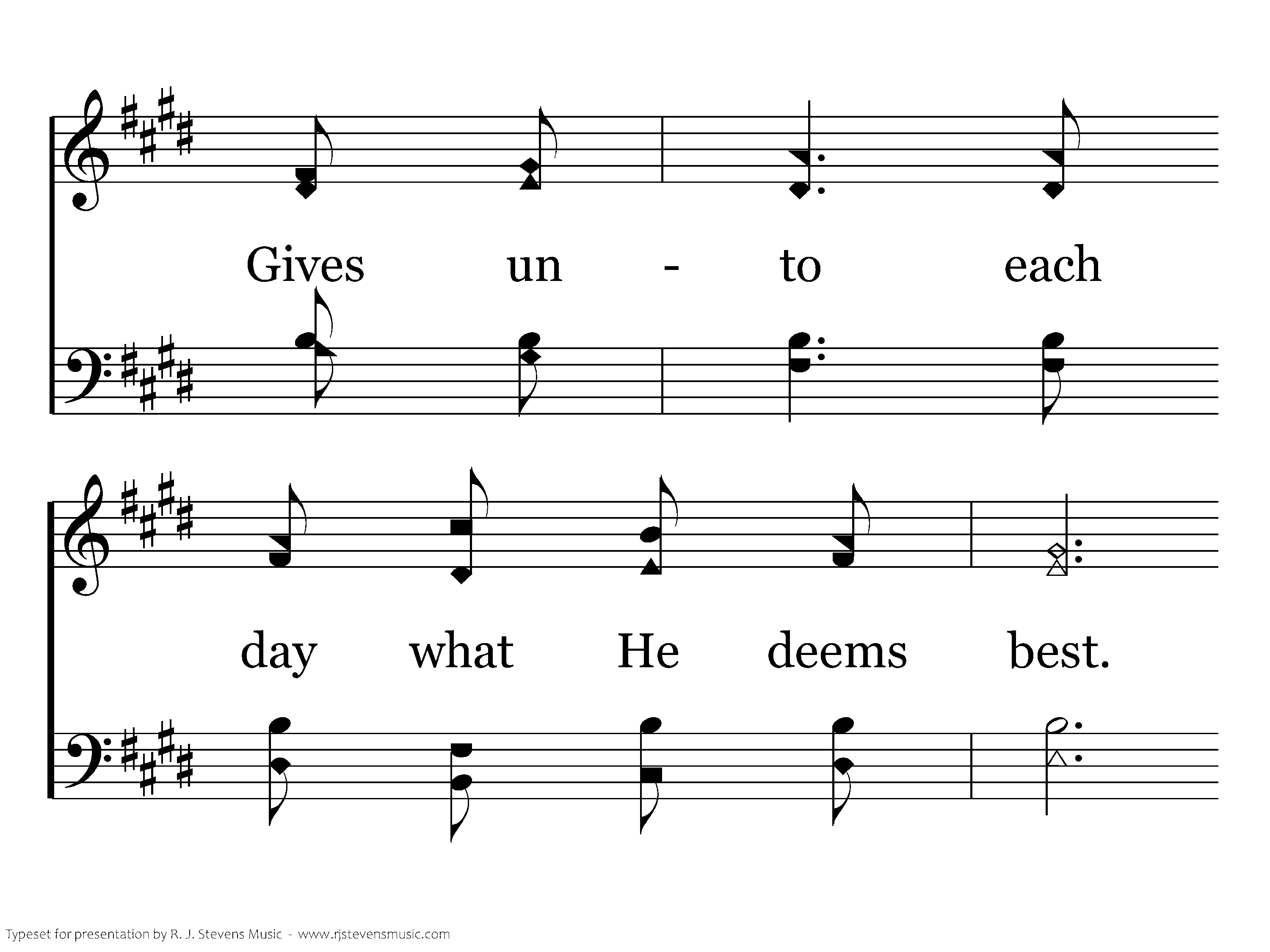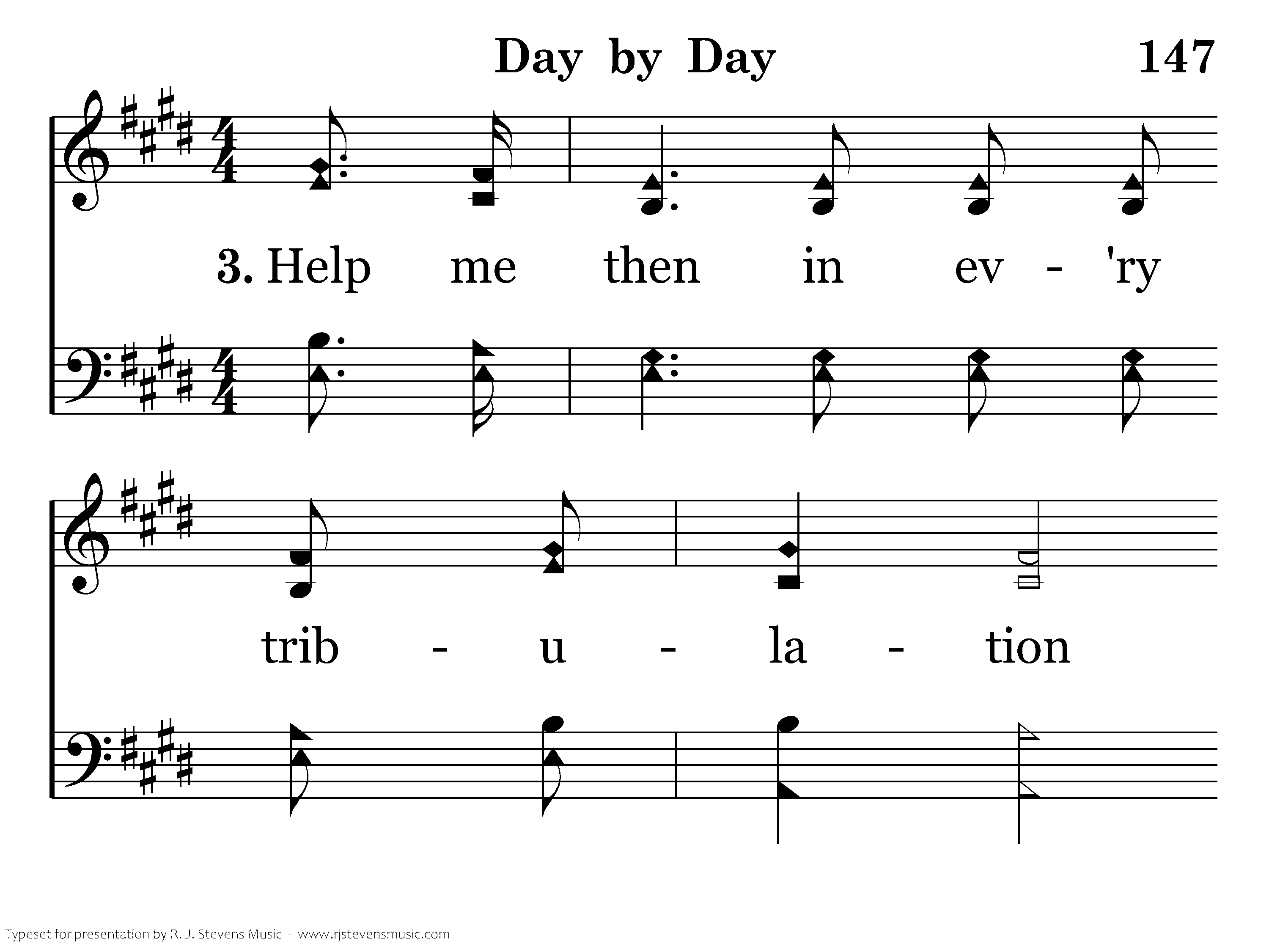 Day by day and with each passing moment, Strength I find to meet my trials here; Trusting in my Father's wise bestowment, I've no cause for worry or for fear. He, whose heart is kind beyond all measure Gives unto each day what he deems best. Lovingly, it's part of pain and pleasure, Mingling toil and peace and rest.