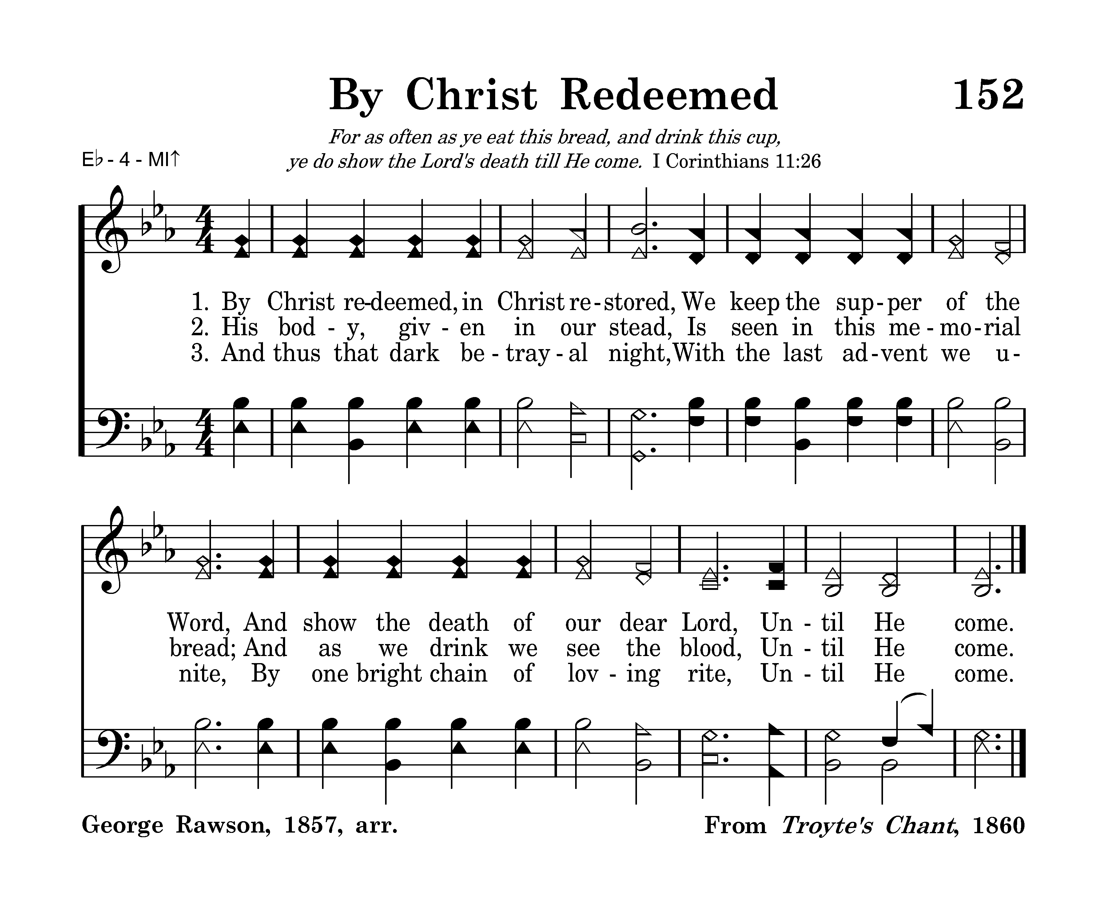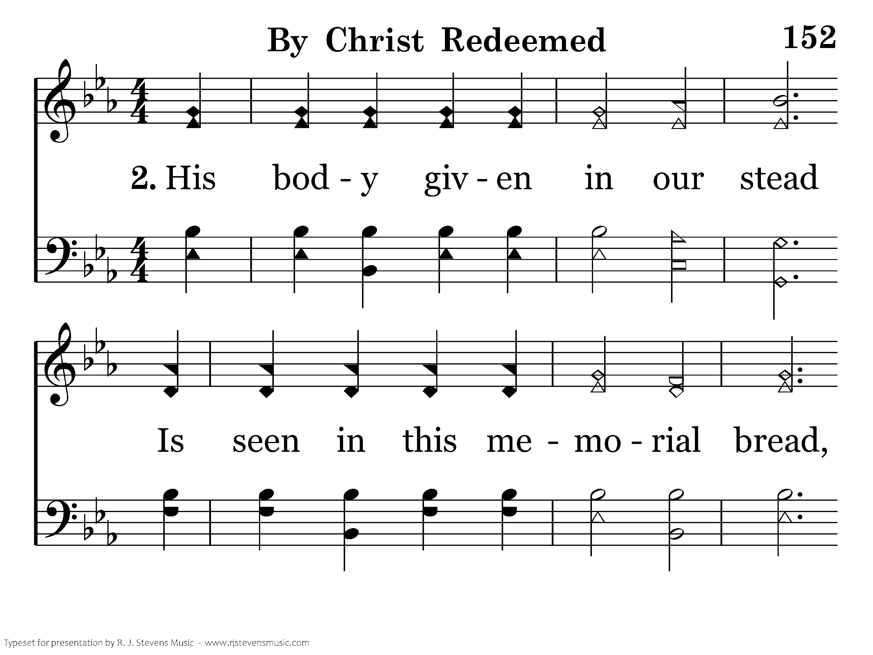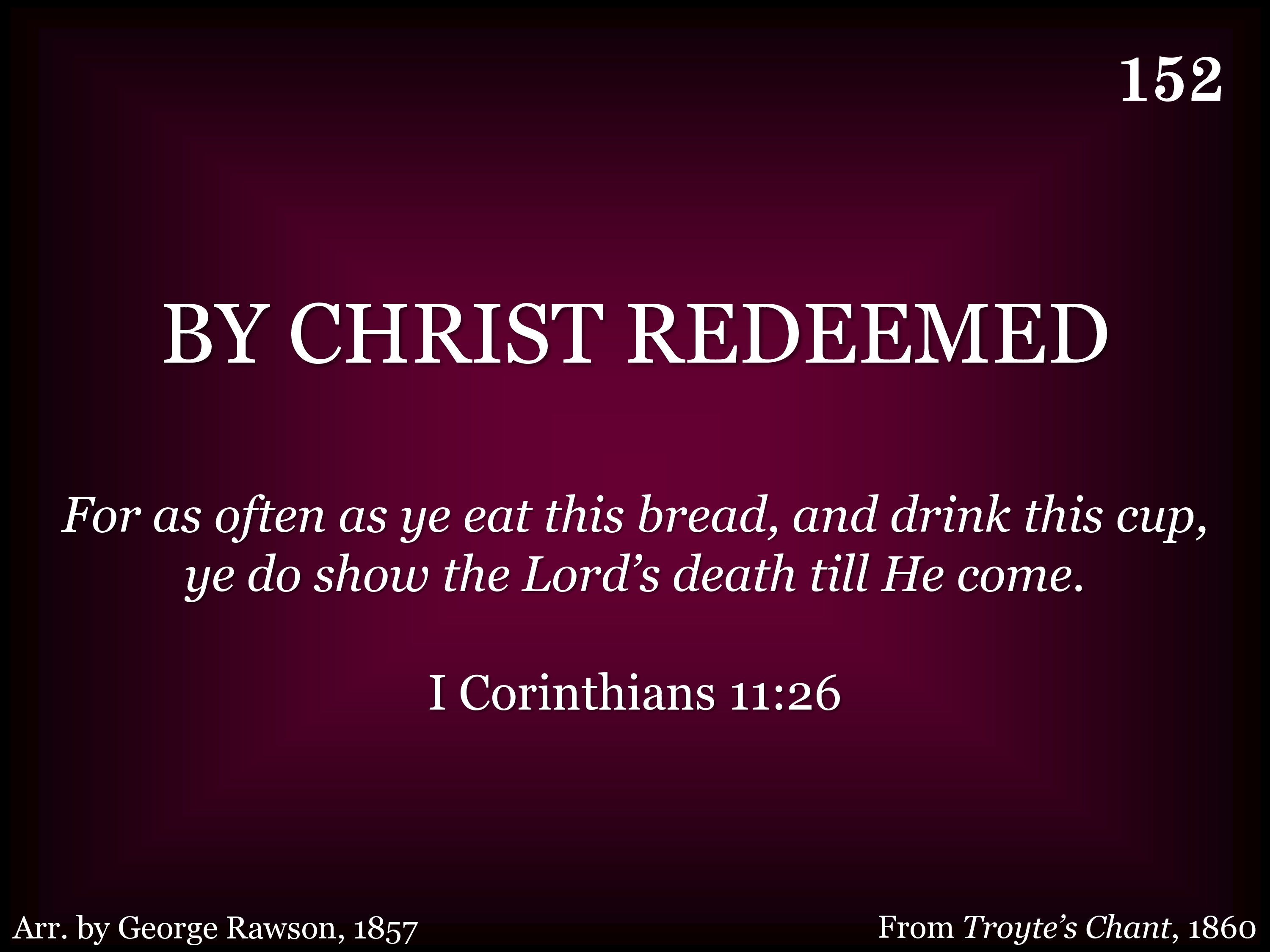 By Christ redeemed, in Christ restored, We keep the supper of the Word, And show the death of our dear Lord, Until He come.