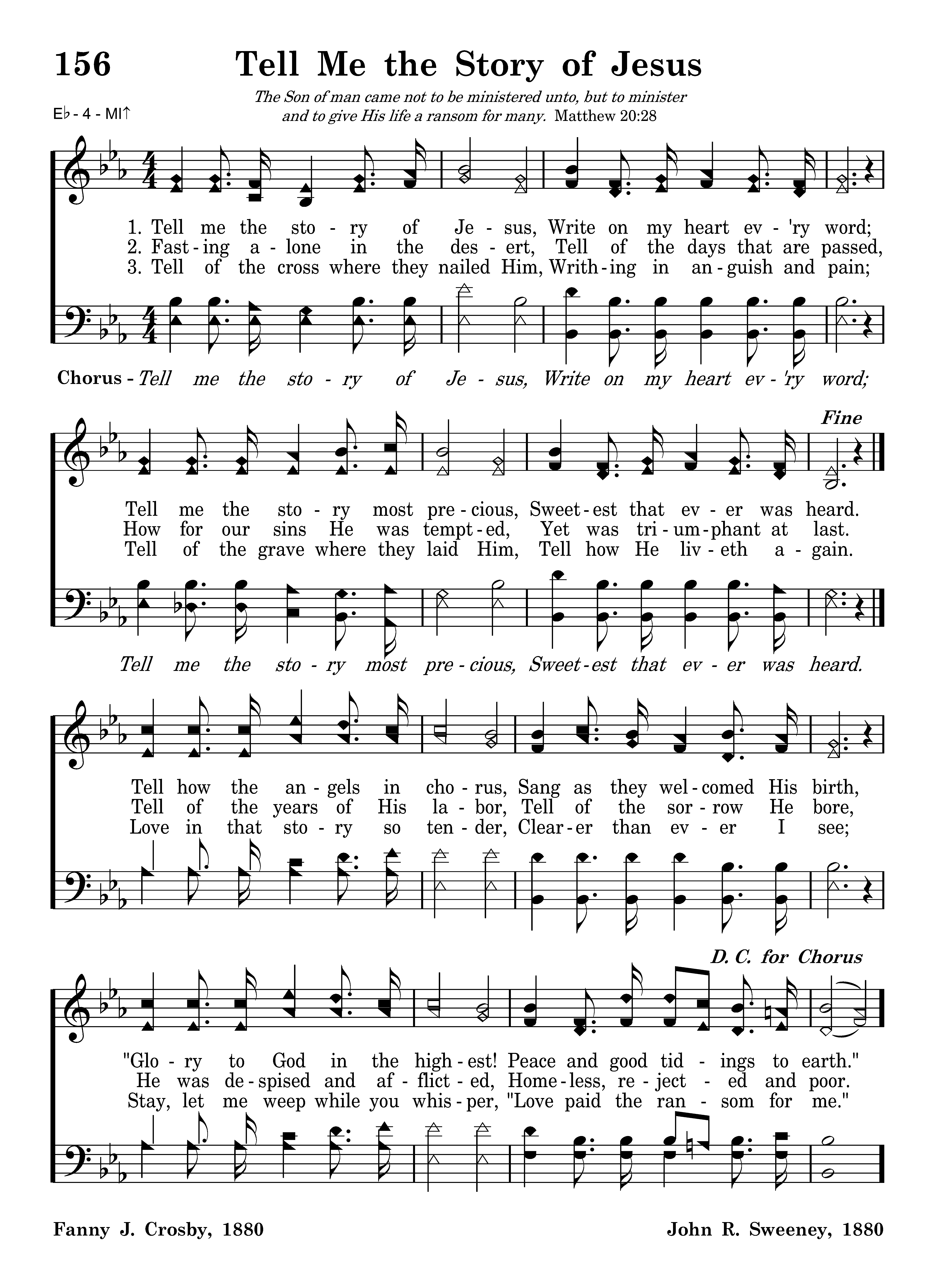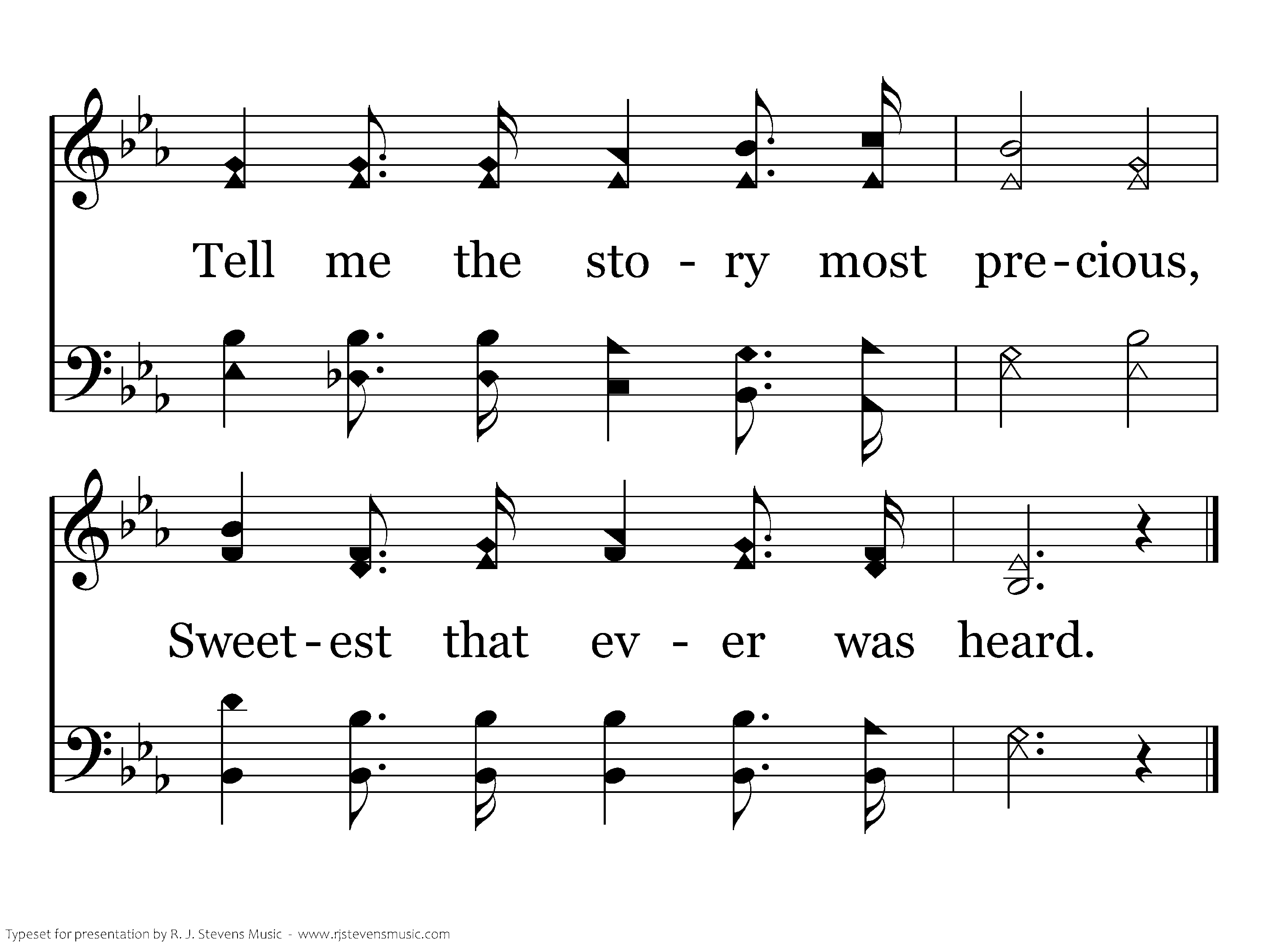 Tell me the story of Jesus, Write on my heart every word; Tell me the story most precious, Sweetest that ever was heard.