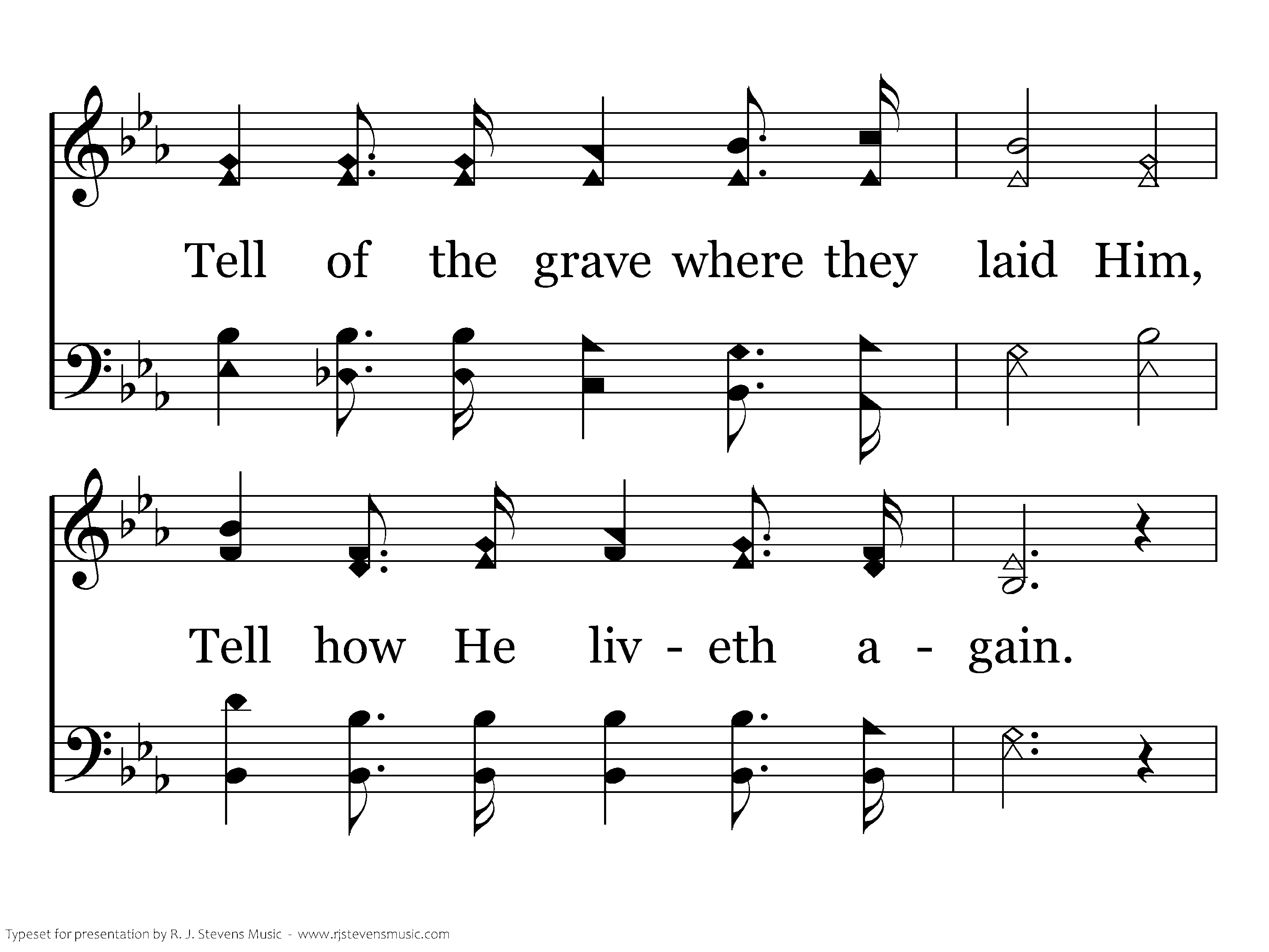 Tell of the cross where they nailed Him, Writhing in anguish and pain; Tell of the grave where they laid Him, Tell how He liveth again. Love in that story so tender, Clearer than ever I see; Stay, let me weep while you whisper, "Love paid the ransom for me."