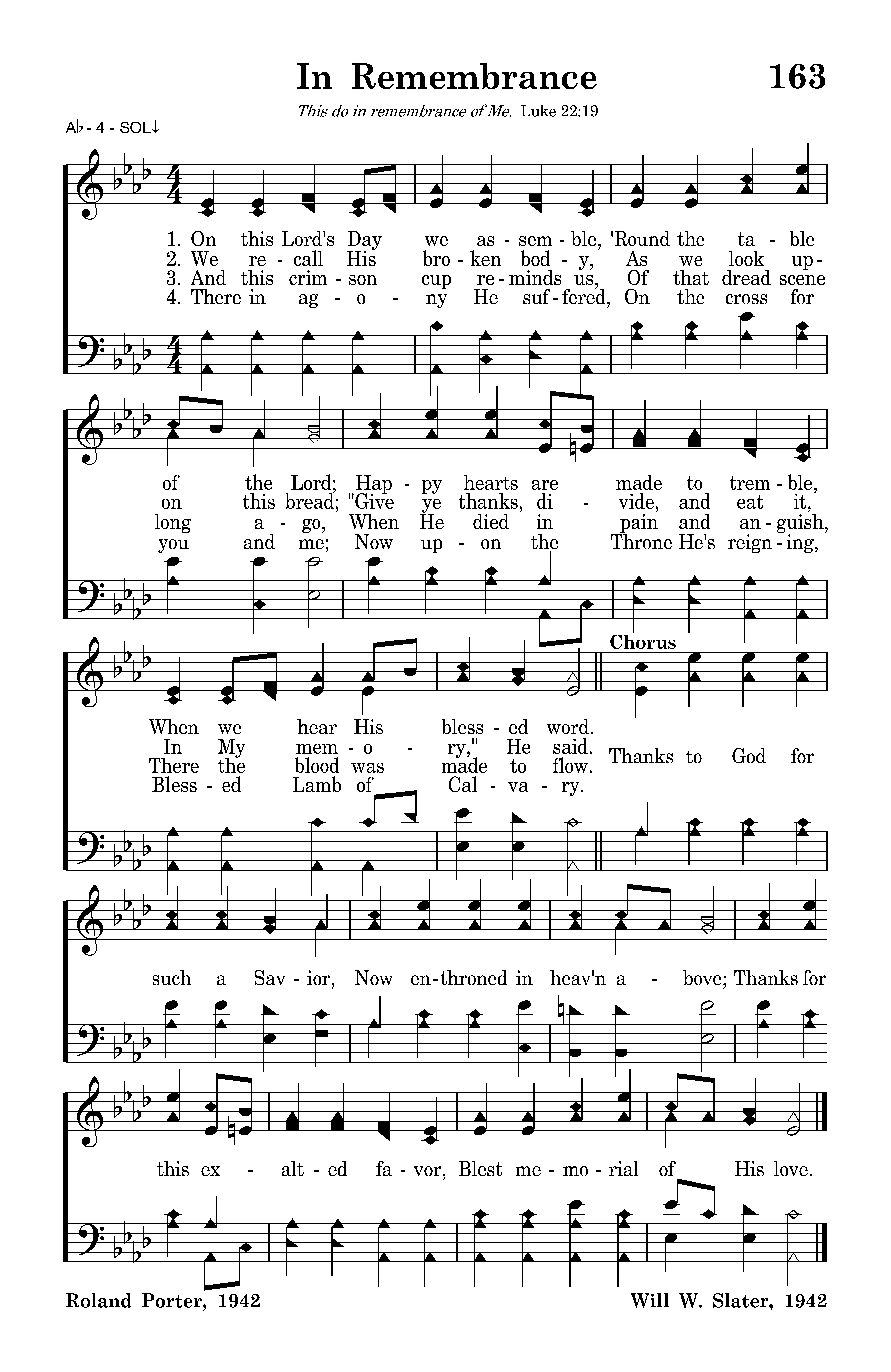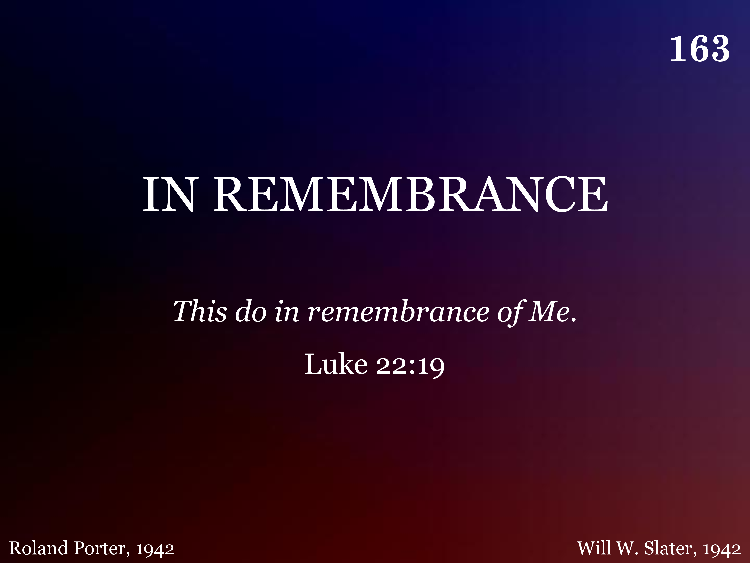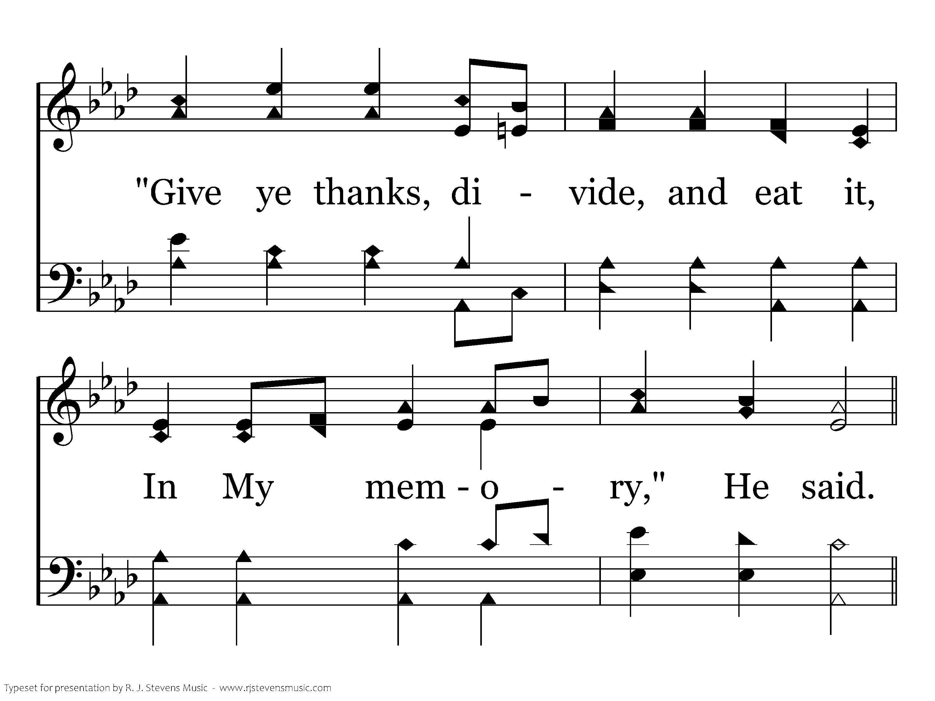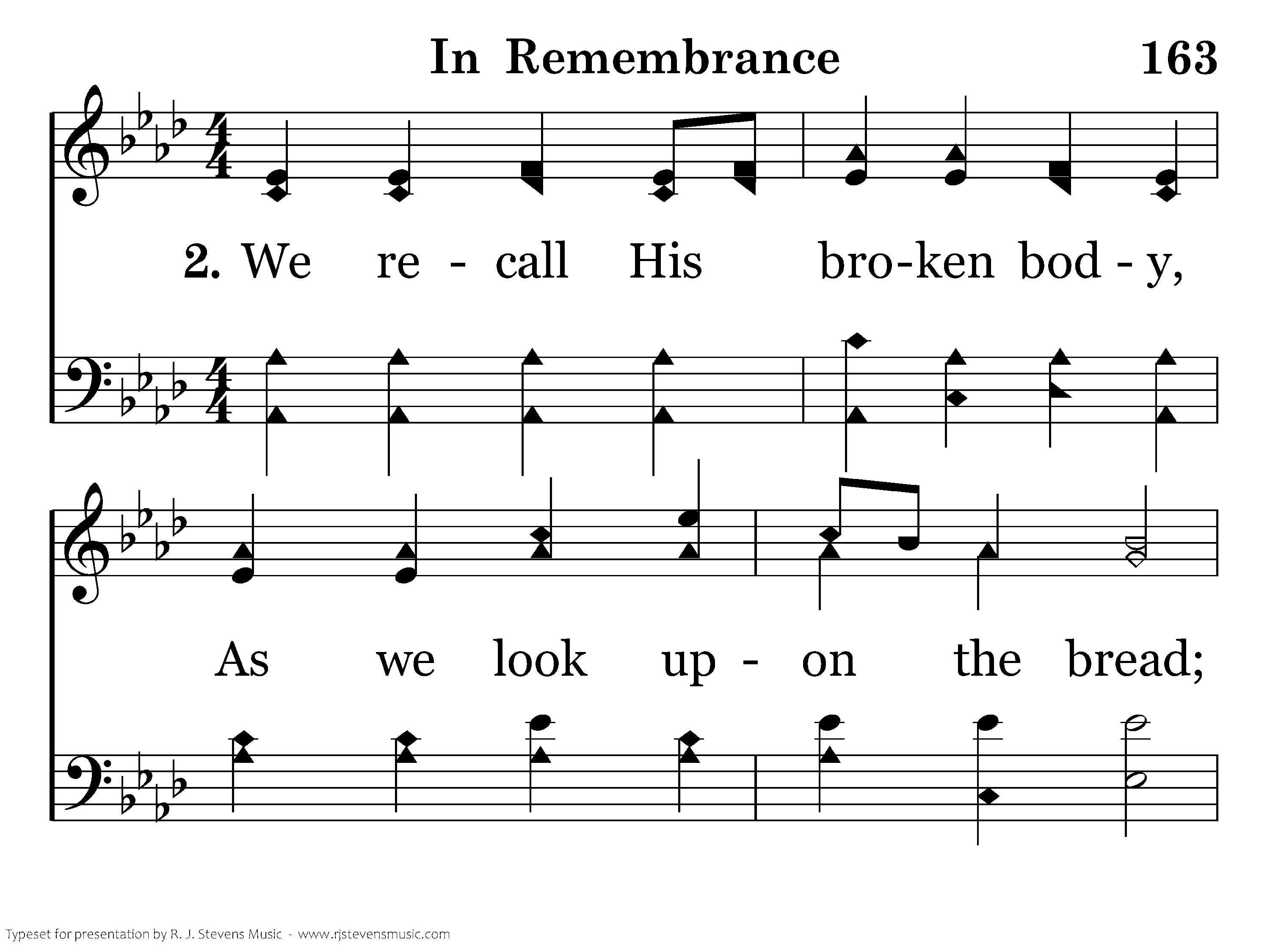 We recall His broken body As we look upon the bread; "Give ye thanks divide and eat it In my memory," He said.
