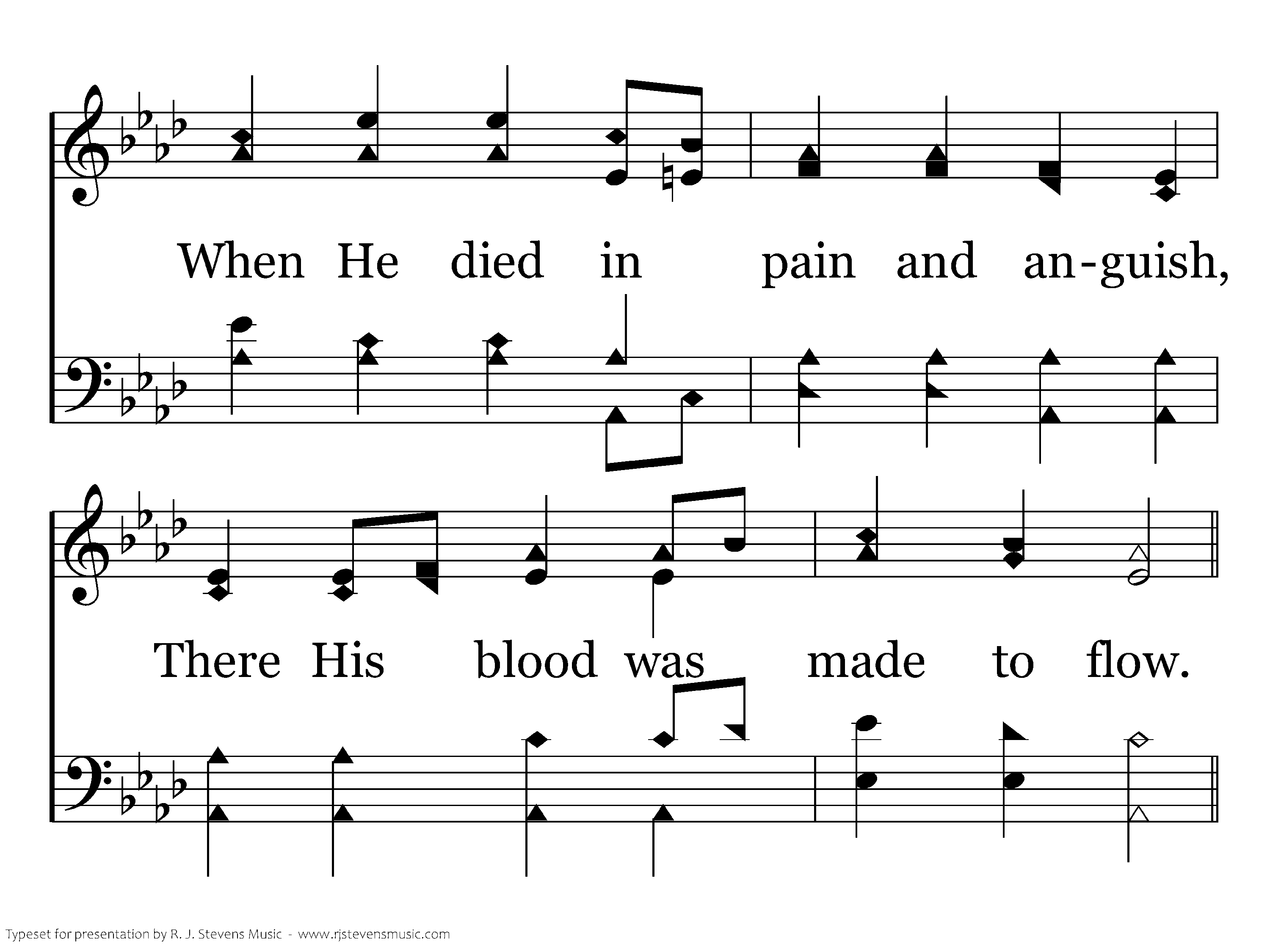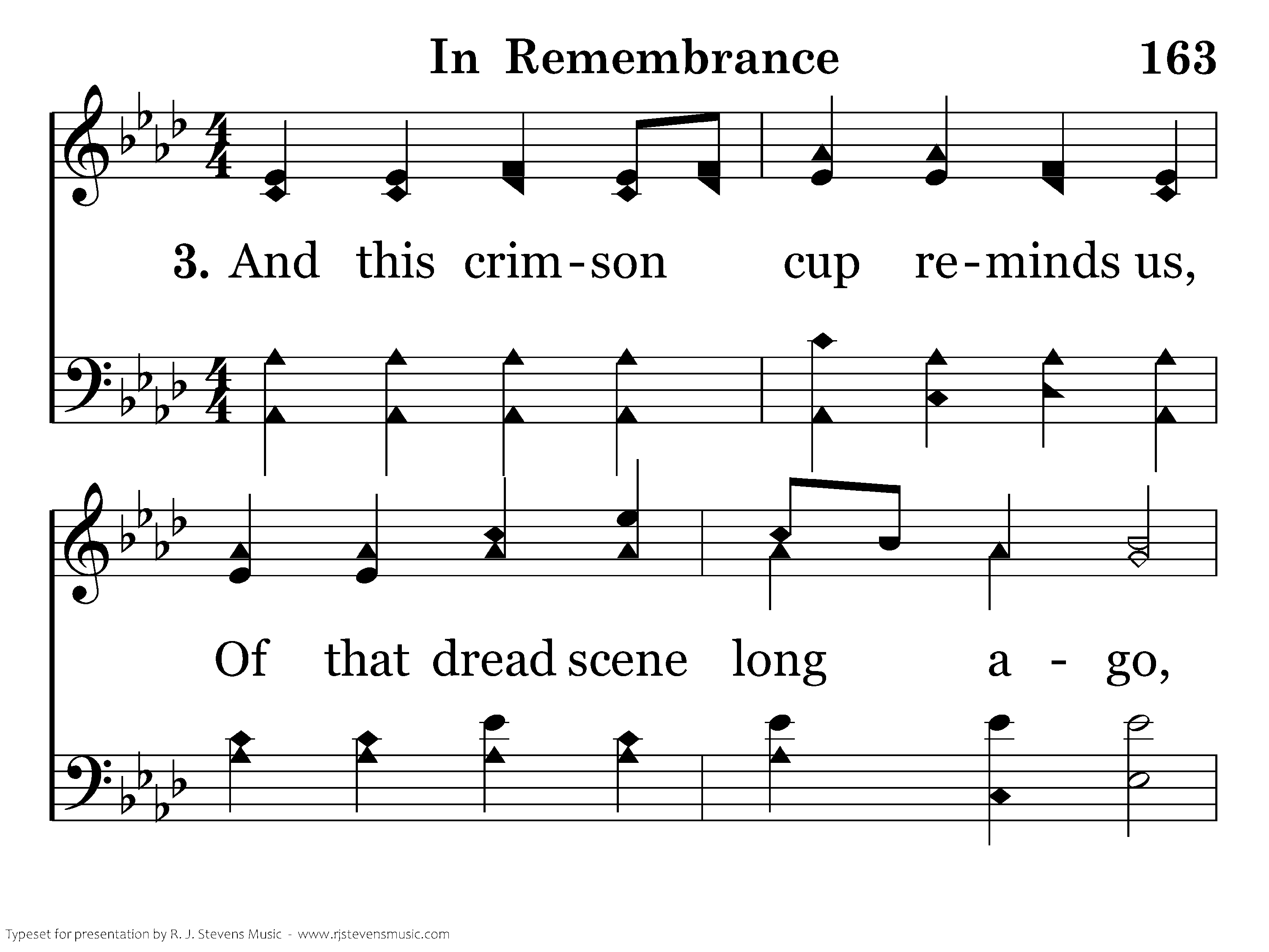 And this crimson cup reminds us Of that dread scene long ago, When He died in pain and anguish, There the blood was made to flow.