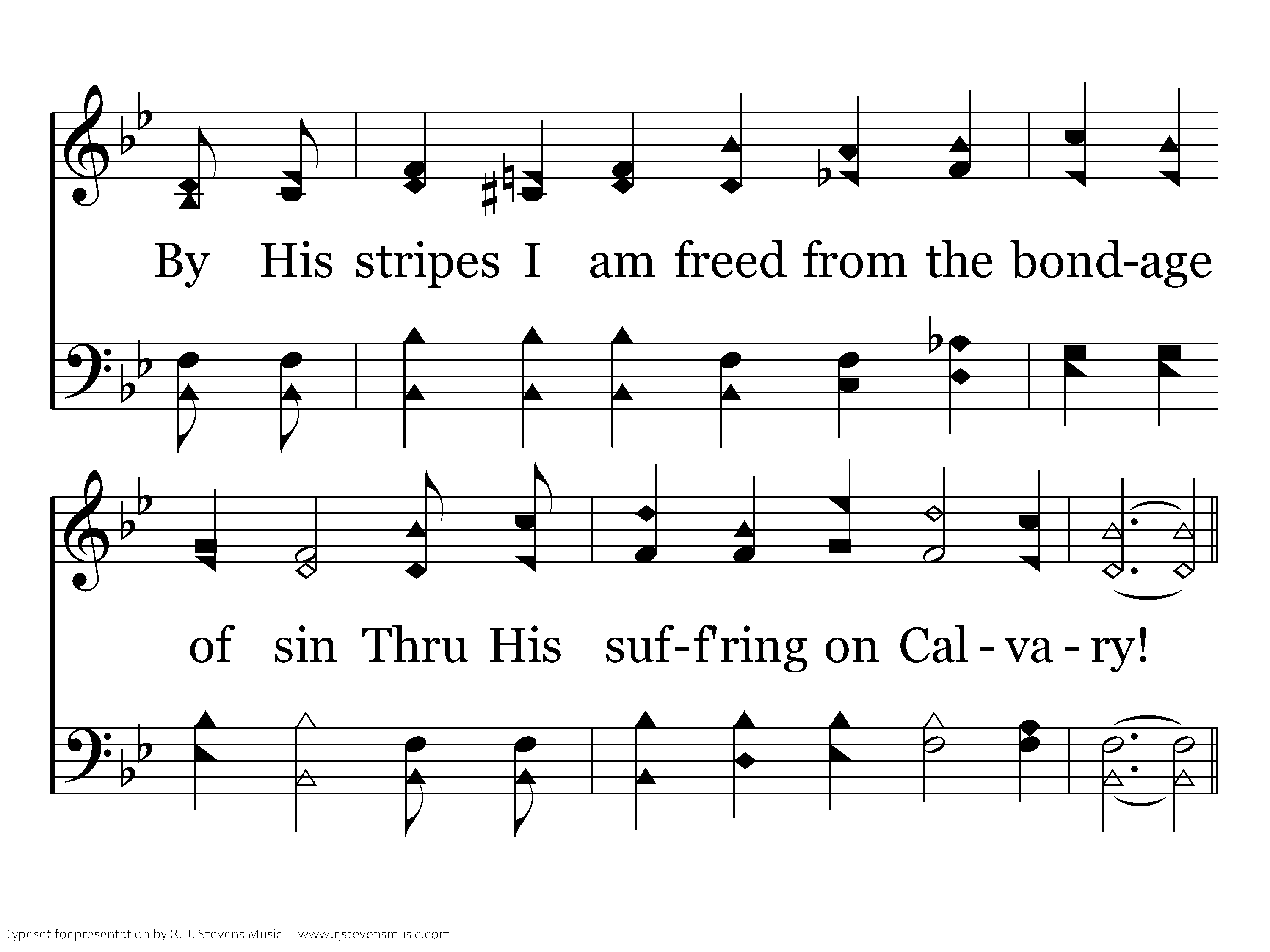 How my heart humbly bows in His presence today, When I think of His agony; By His stripes I am freed from the bondage of sin Thru his suffereing on Calvary!