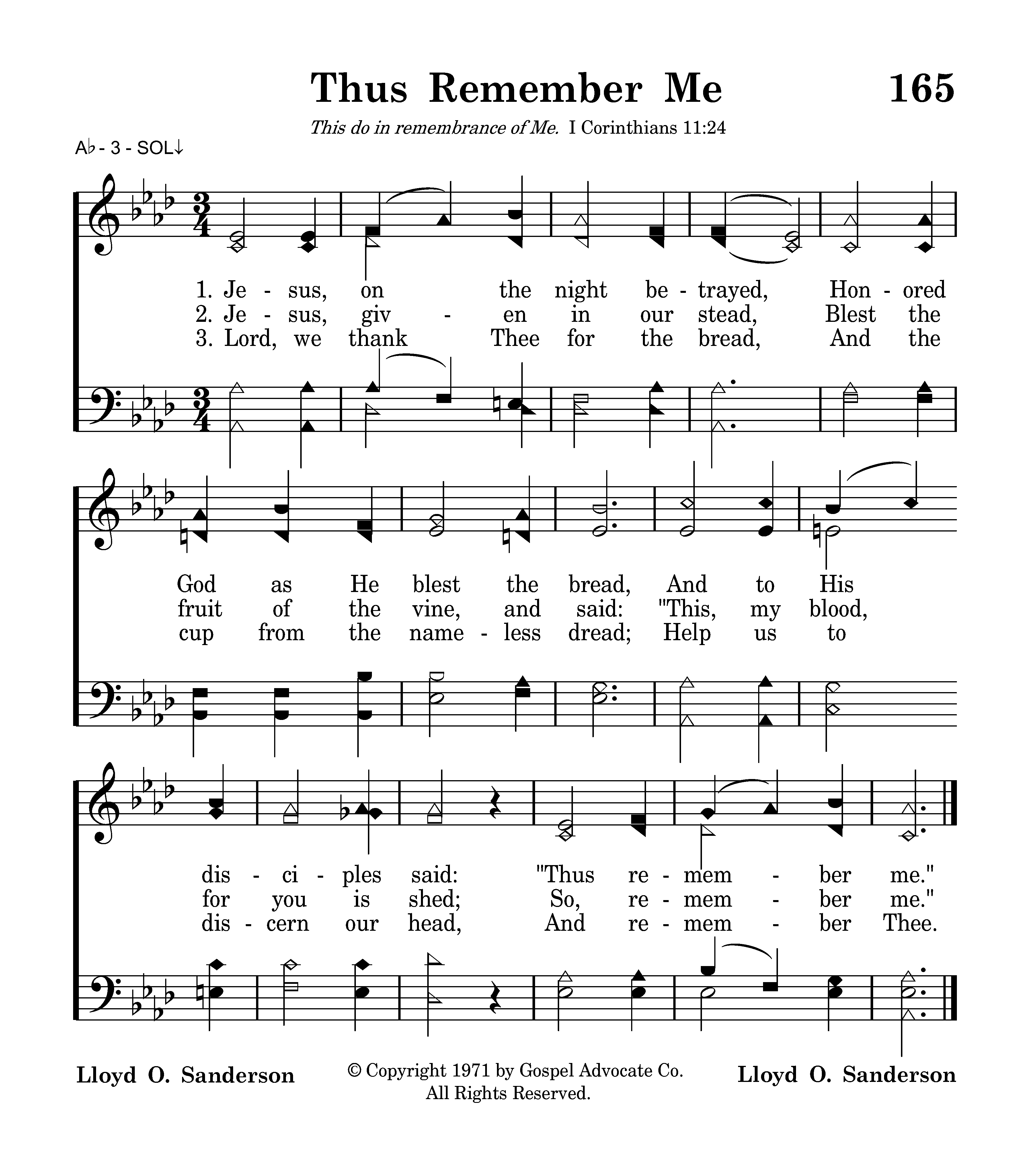 Jesus, on the night betrayed, Honored God as He blest the bread, And to His disciples said, "Thus remember me."