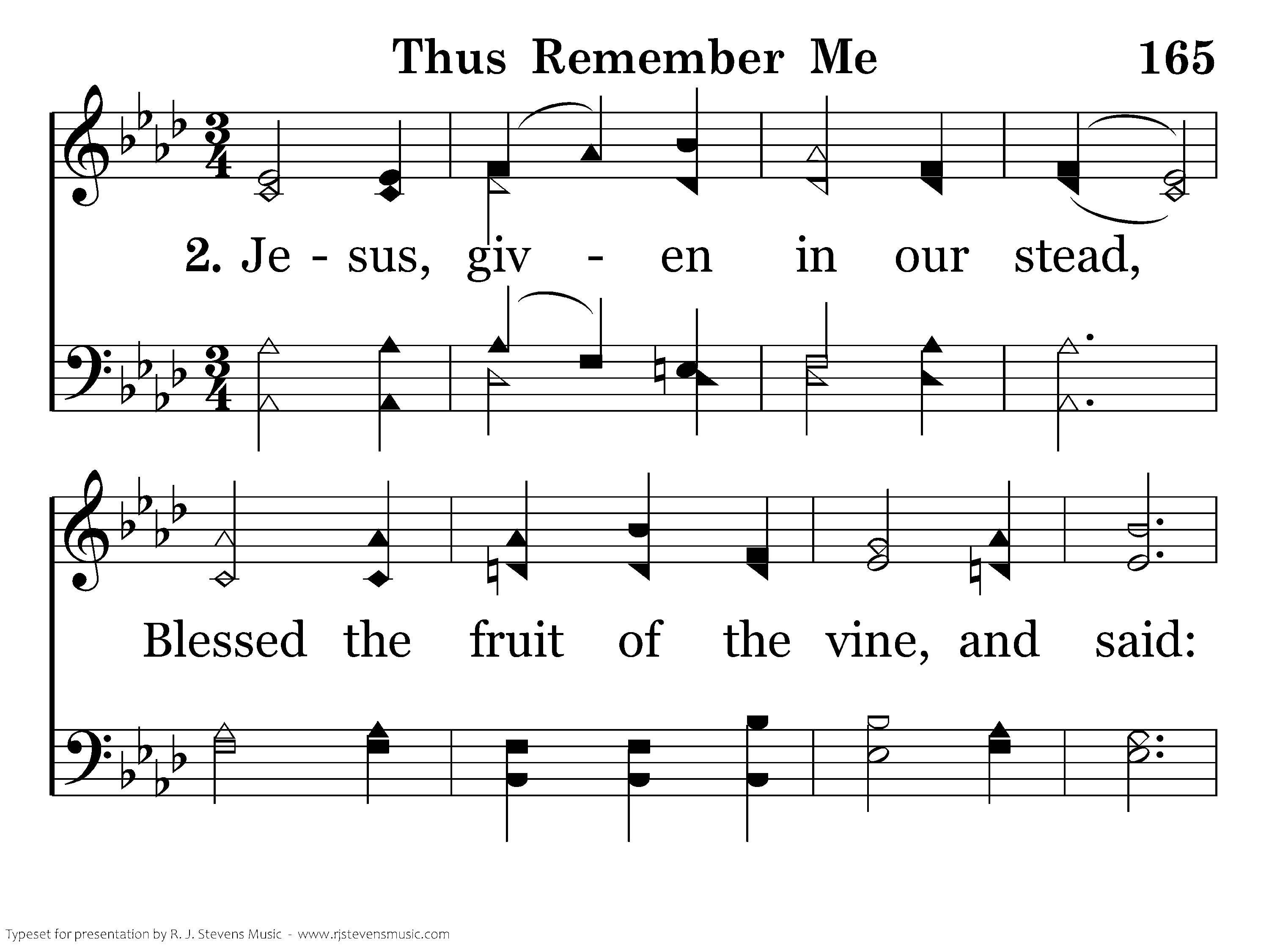 Jesus given in our stead, Blest the fruit of the vine and said: "This, My blood, for you is shed; So, remember me."