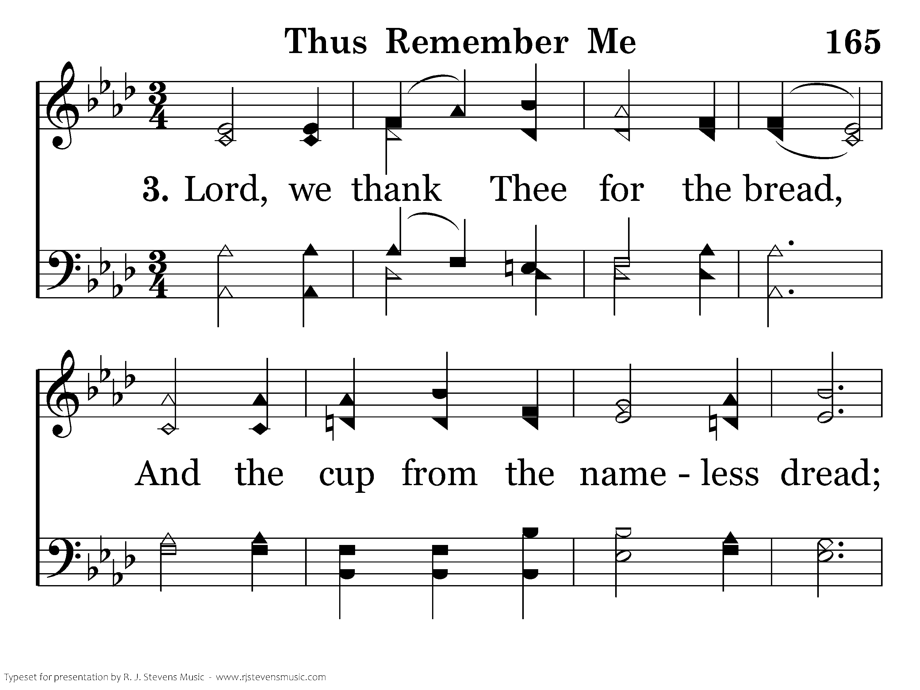Lord, we thank Thee for the bread, And the cup from the nameless dread; Help us to discern our head, And remember Thee.