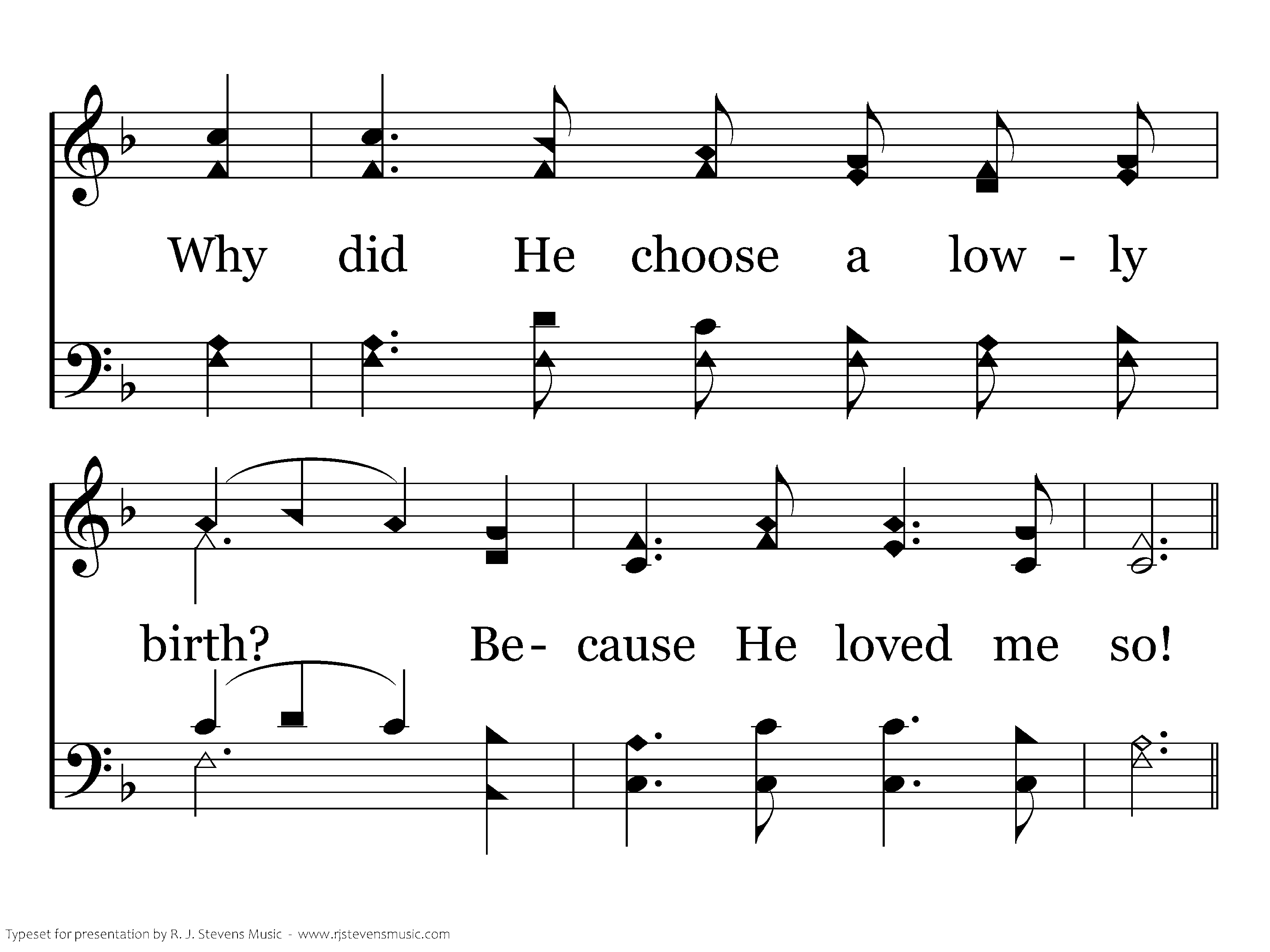 Why did my Savior come to earth And to the humble go? Why did He choose a lowly birth? Because he loved me so!