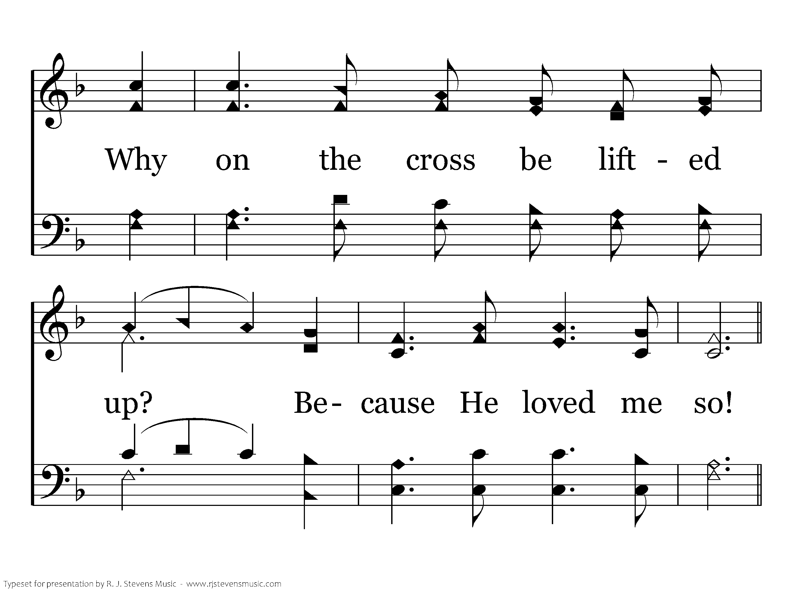 Why did he drink the bitter cup of sorrow pain and woe? Why on the cross be lifted up? Because he loved me so!