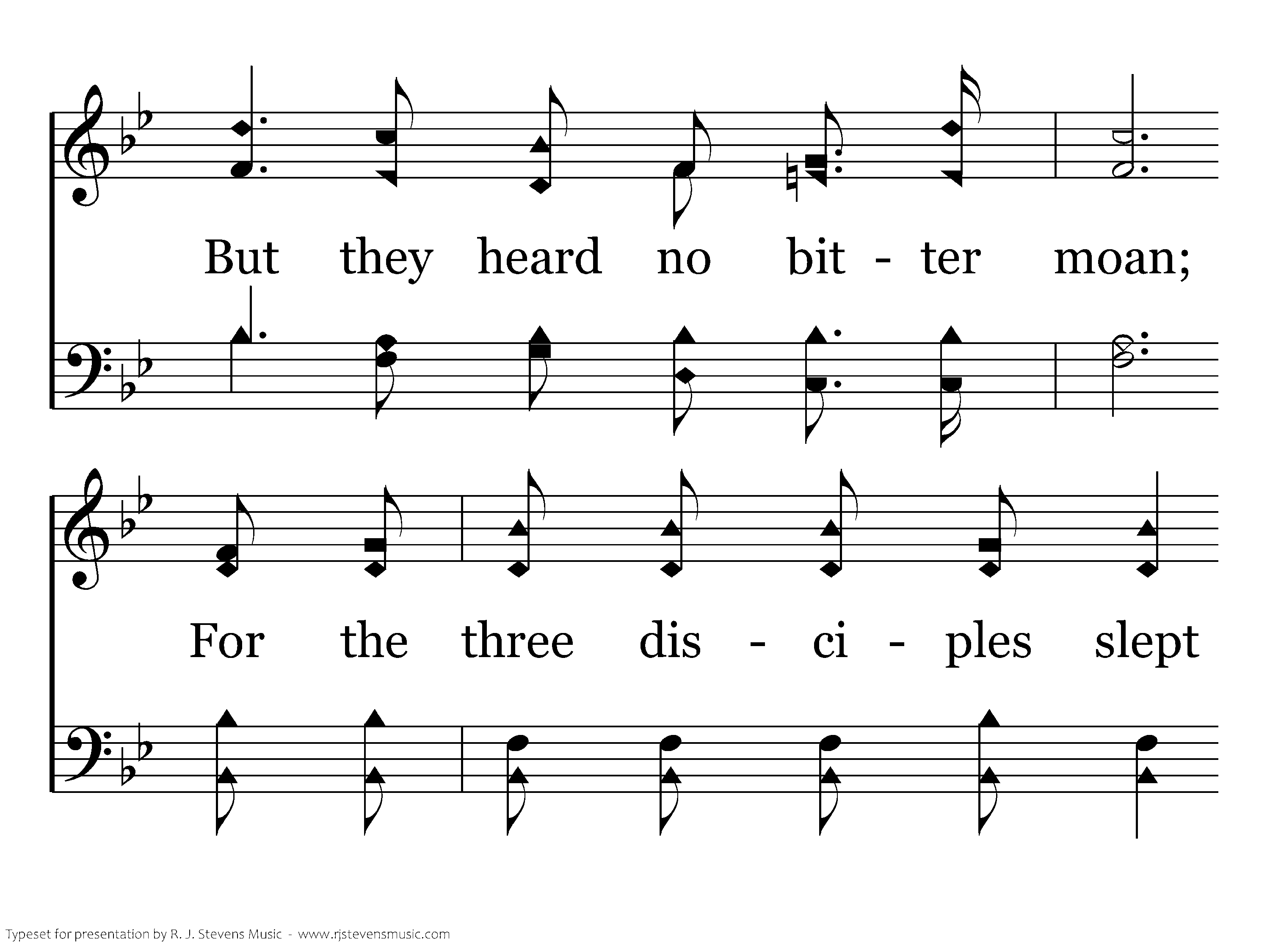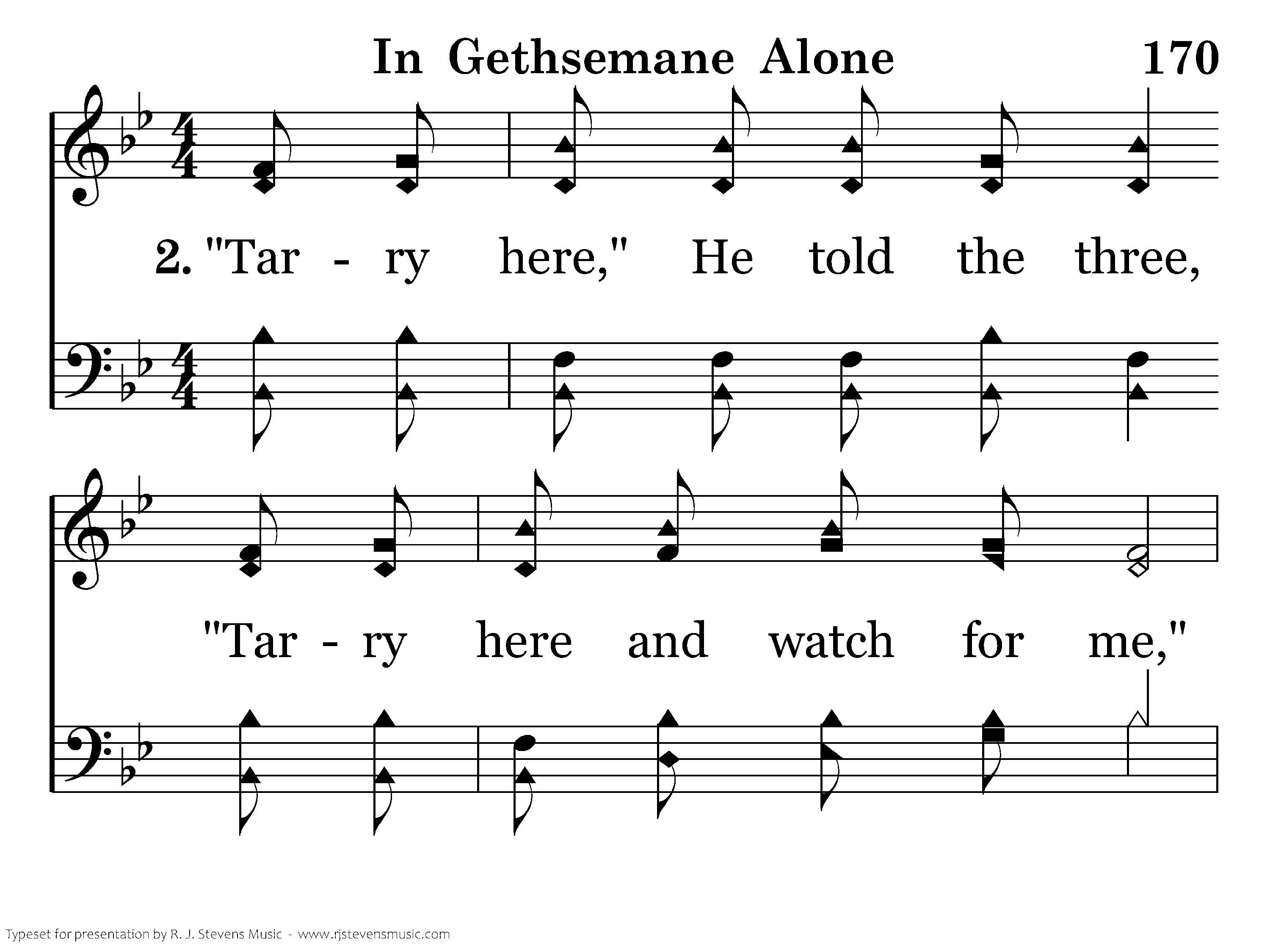 Tarry here He told the three, "Tarry here and watch for me," But they heard no bitter moan; For the three disciples slept While my loving Savior wept In Gethsemane, alone.