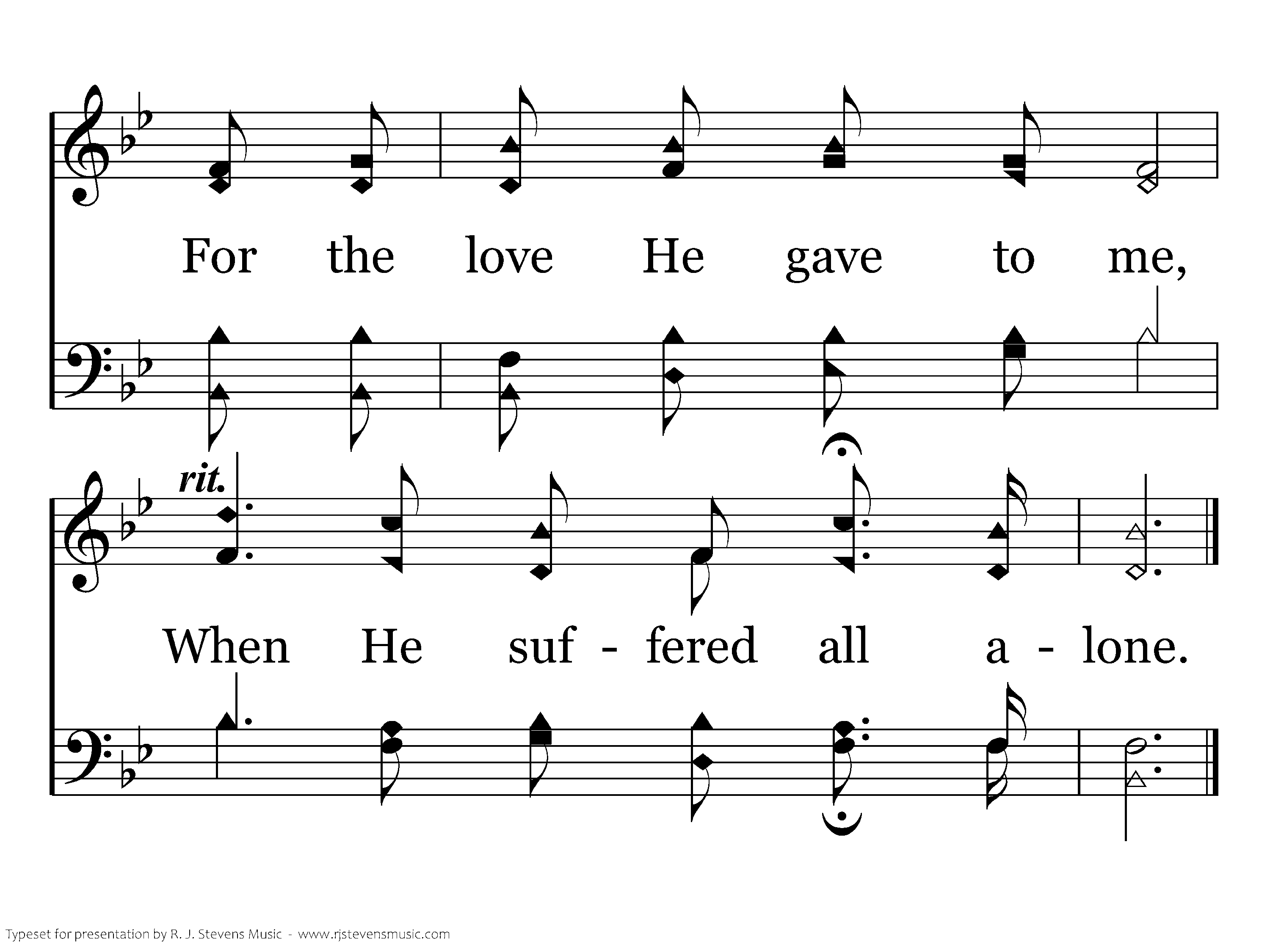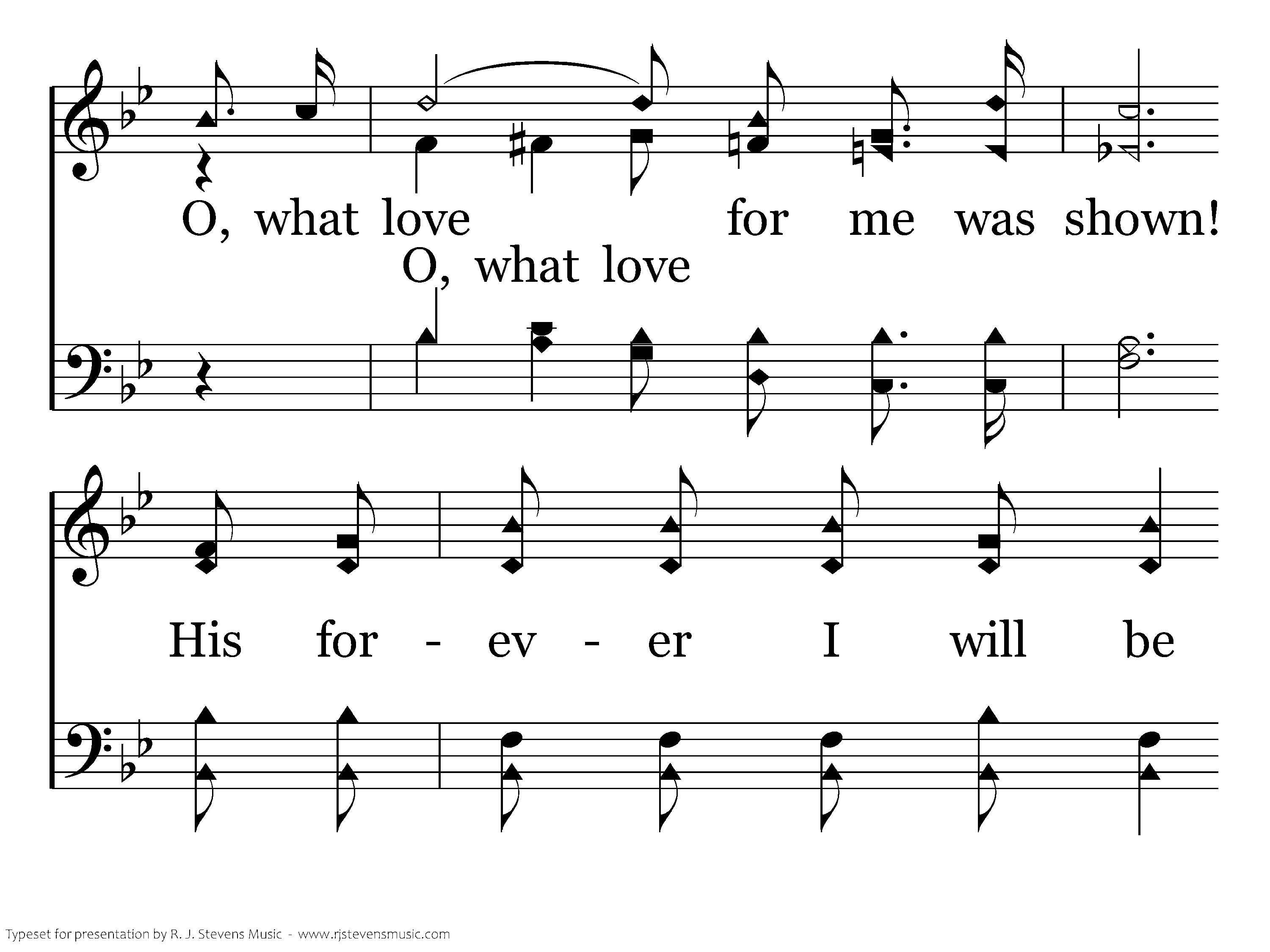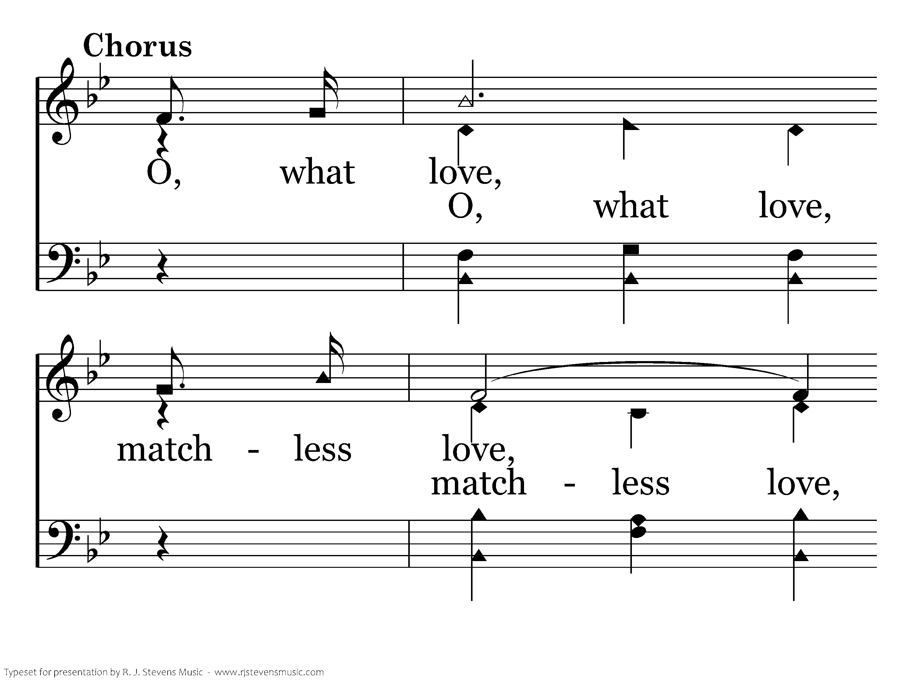 O, what love, matchless love, O, what love for me was shown! His forever I would be for the love He gave to me, When He suffered all alone.