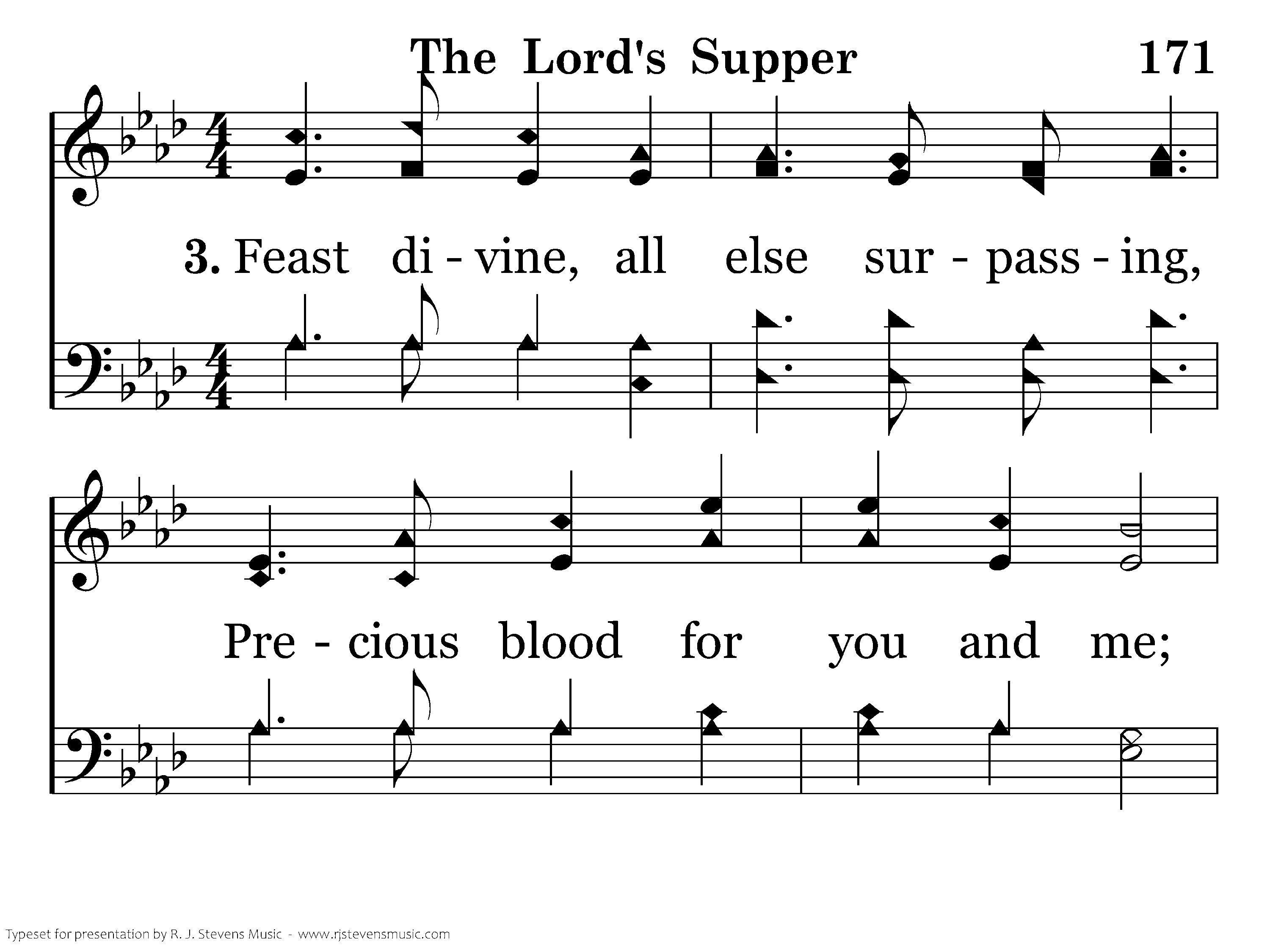 Feast divine all else surpassing, Precious blood for you and me; While we sup Christ gently whispers: "Do this in my memory."