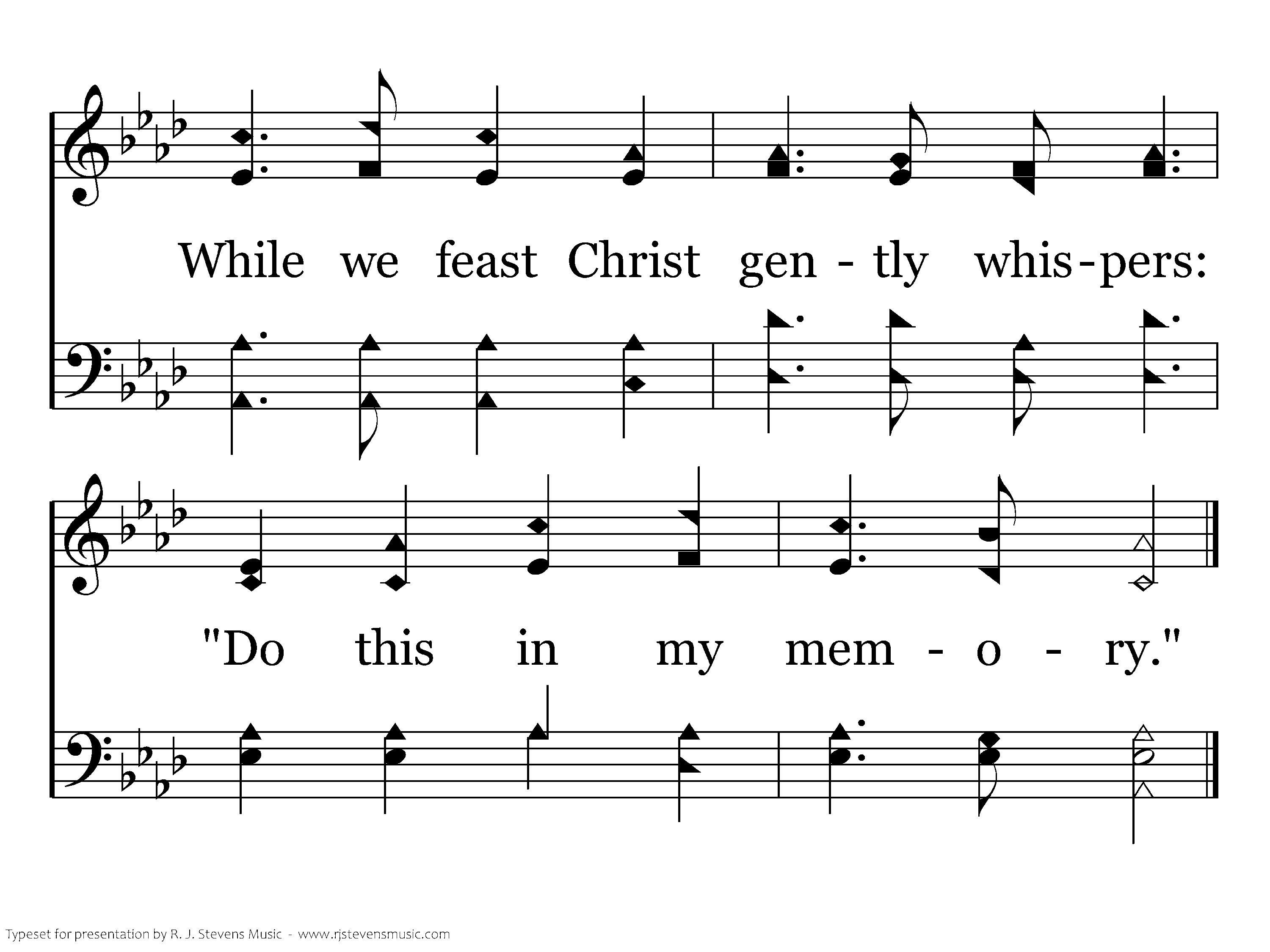 Precious feast, all else surpassing, Wondrous love for you and me; While we feast Christ gently whispers: "Do this in my memory."