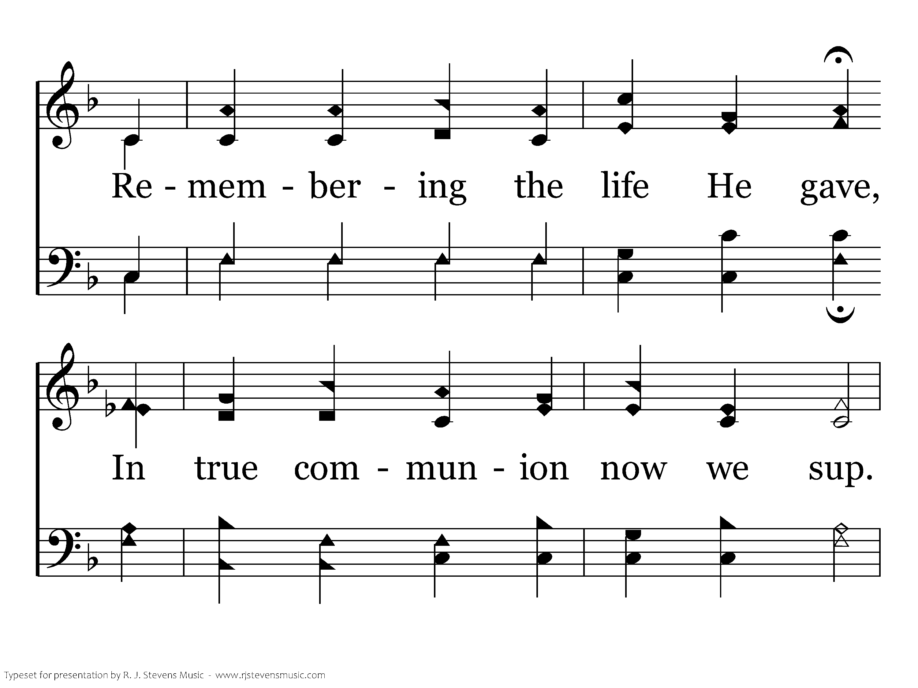 We share His body and His blood: With quiet heart our mind discerns The Christ whose side flowed crimson flood; His death we show 'til He returns. Lord, be with us in this place; keep us safely in Thy grace.
