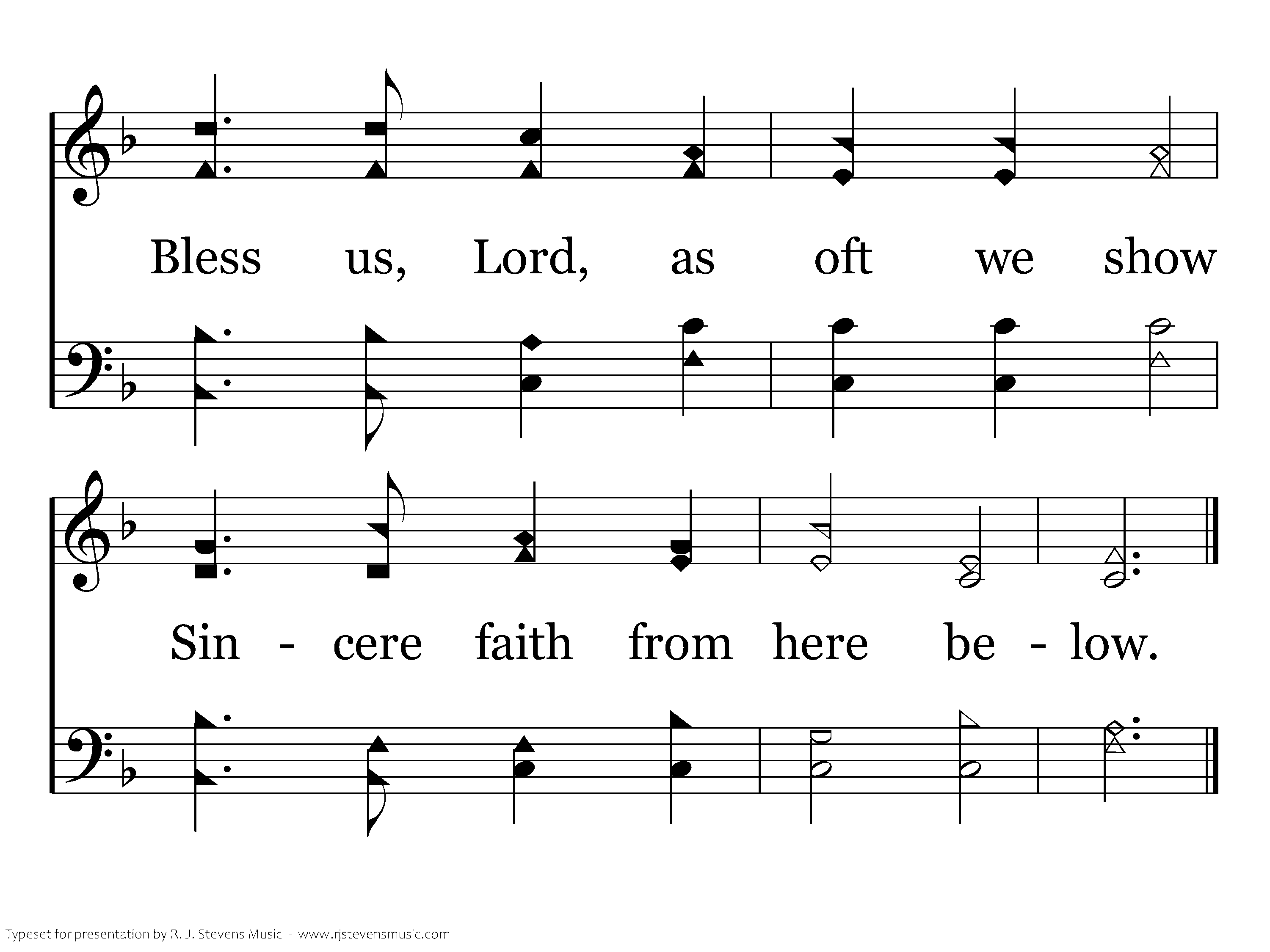 We hear by faith the pleading Son; "O Father, pass this cup from me, Tho' not my will, but Thine be done." That night in Garden's agony. Bless us, Lord, as oft we show Sincere faith from here below.