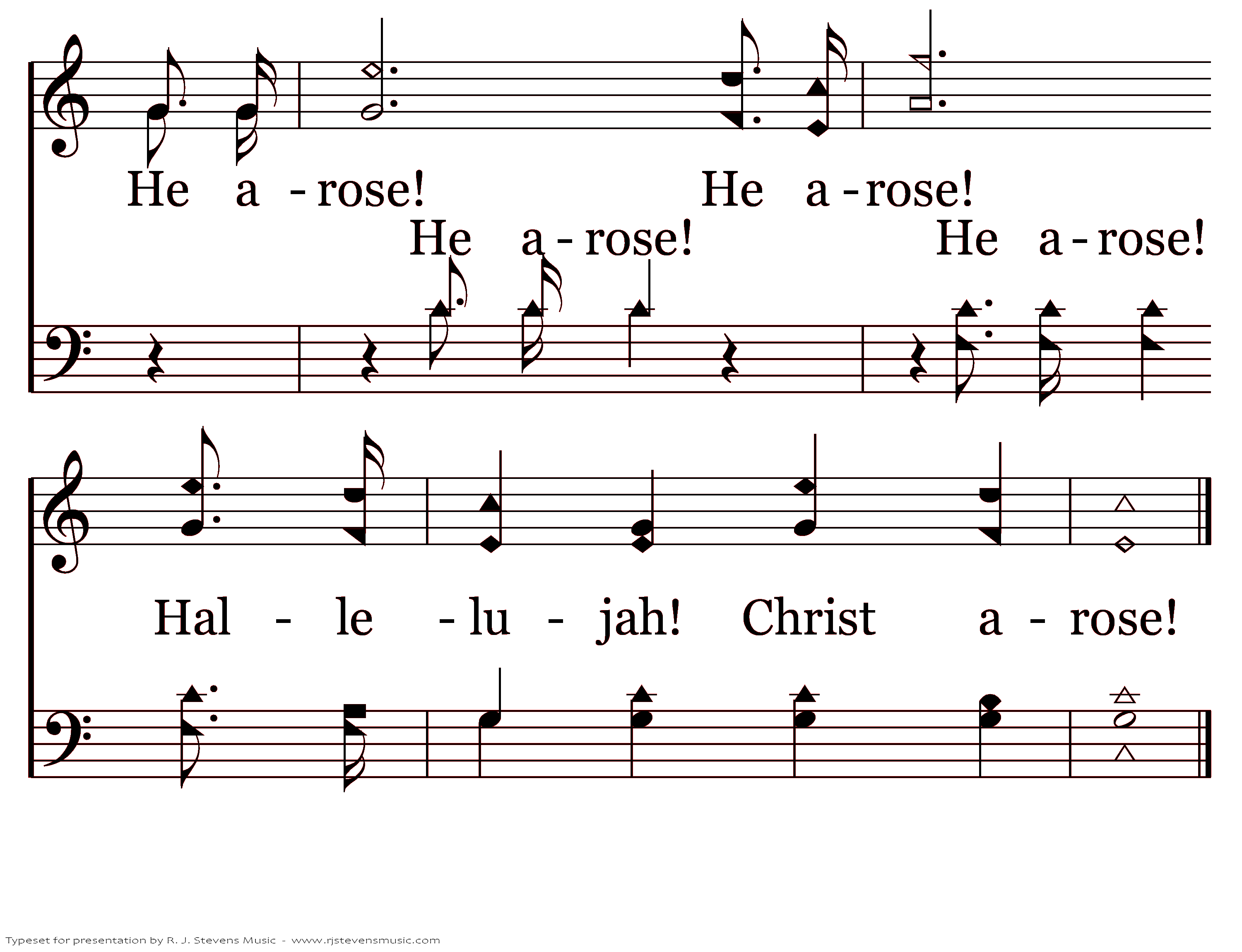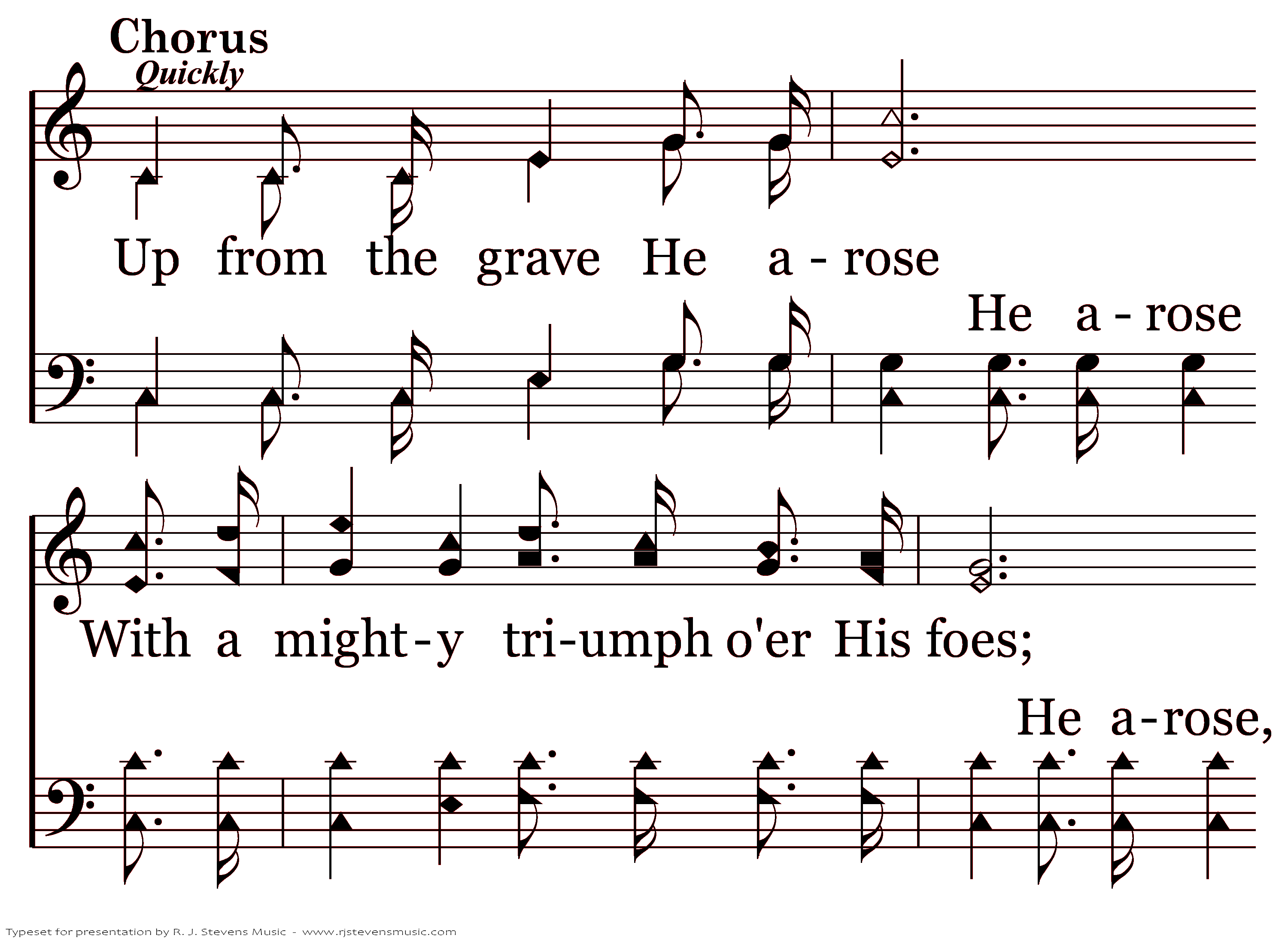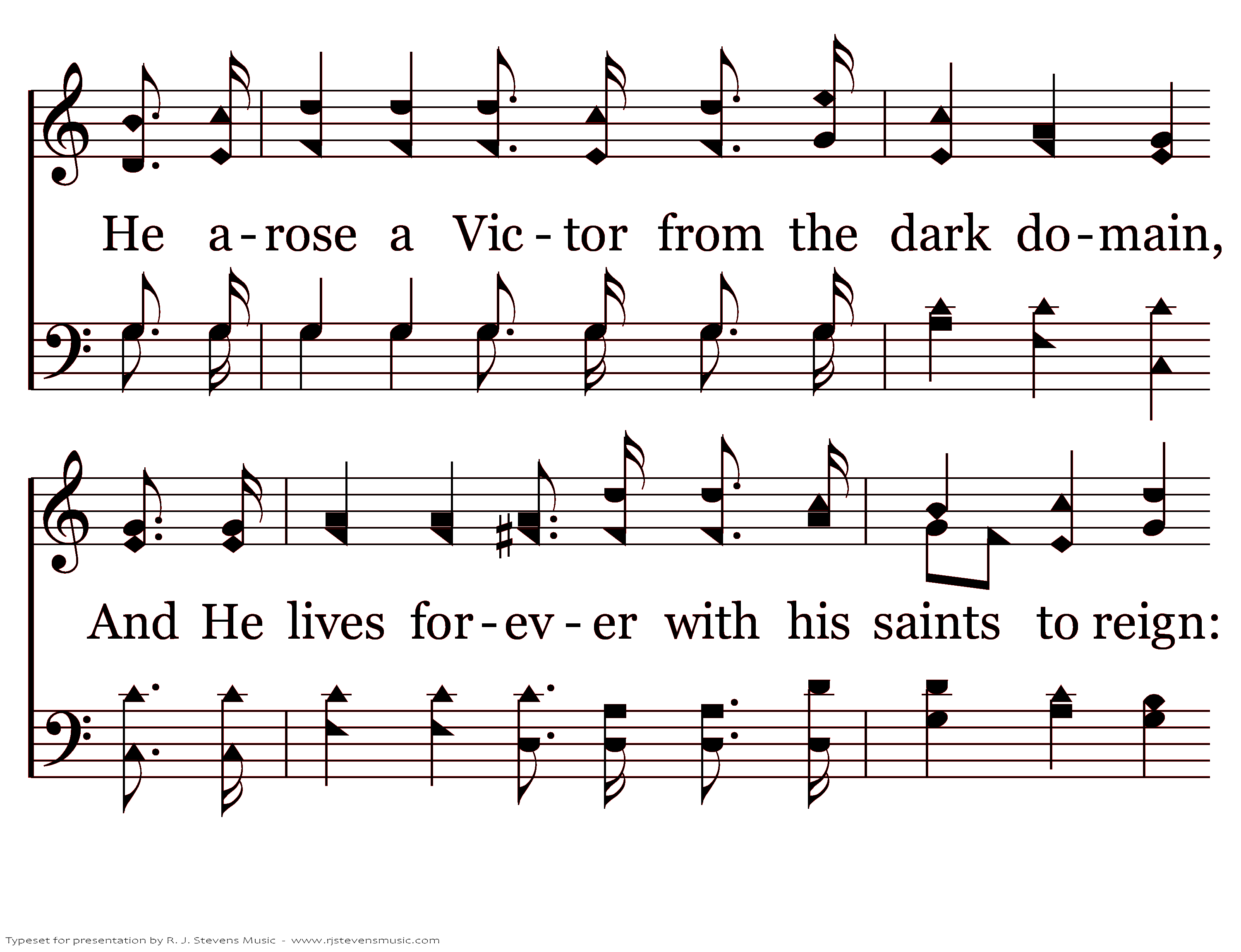 Up from the grave He arose With a mighty triumph o'er His foes, He arose a Victor from the dark domain And He lives forever with His saints to reign; He arose, He arose! Hallelujah! Christ arose!