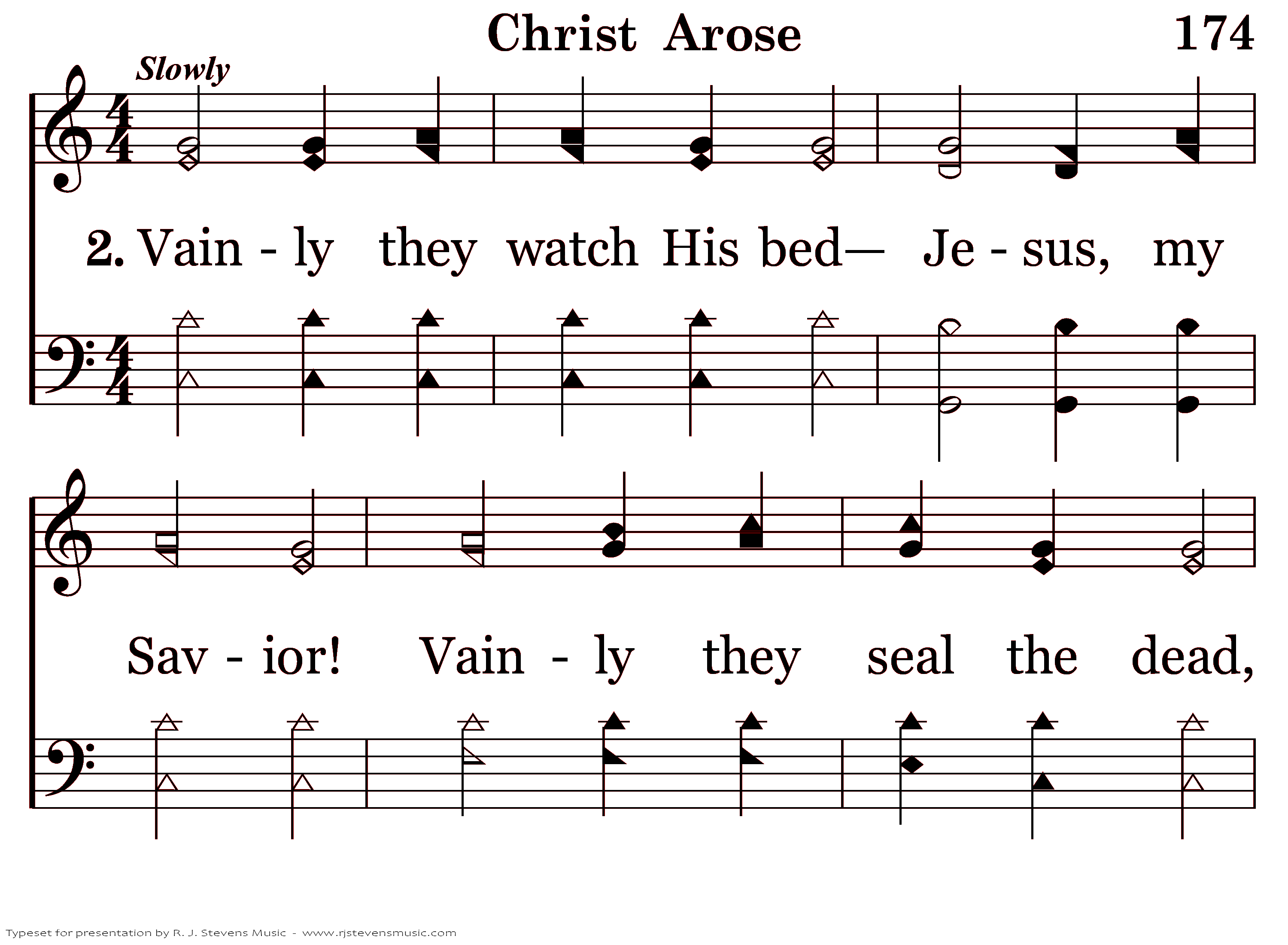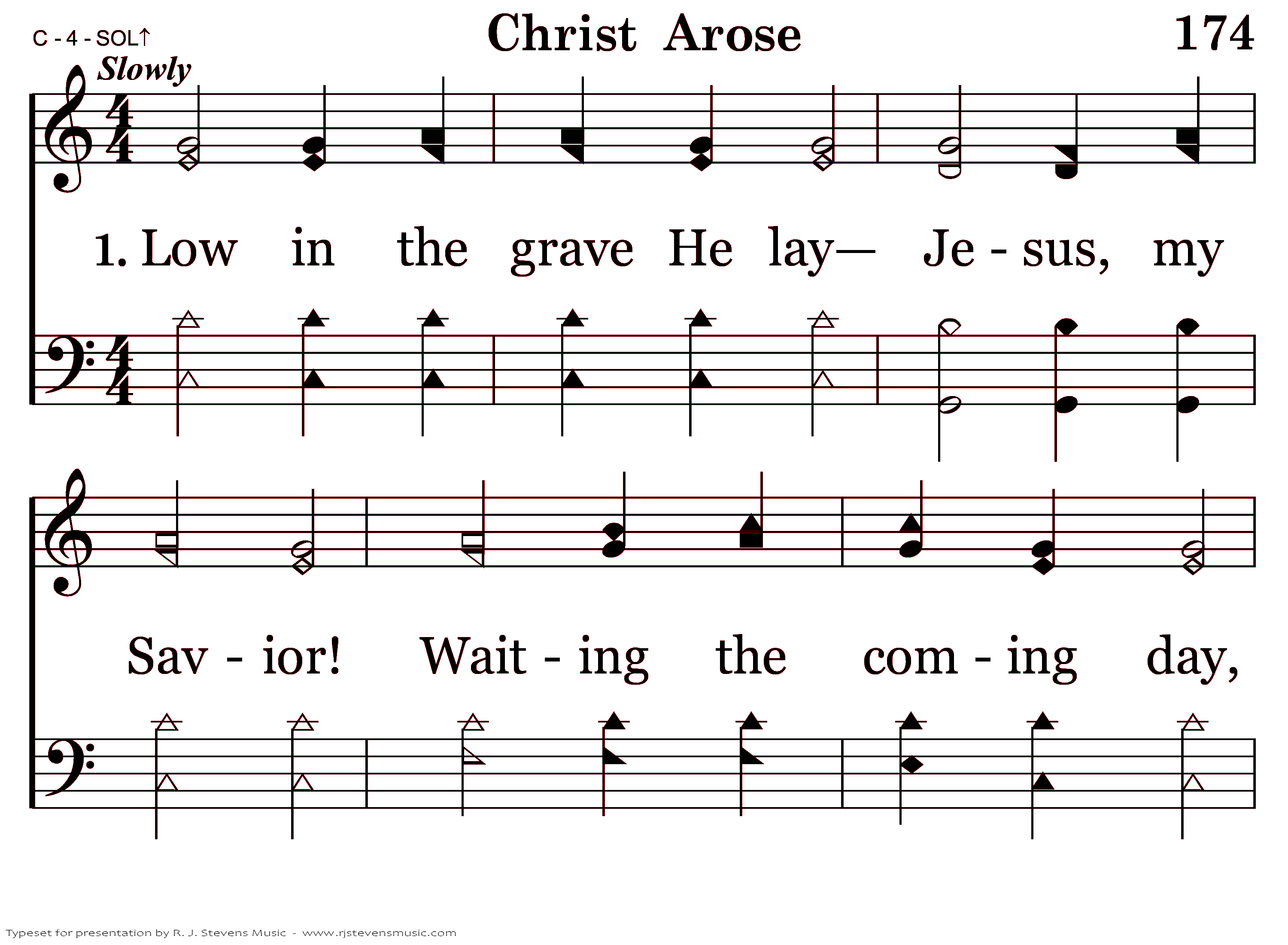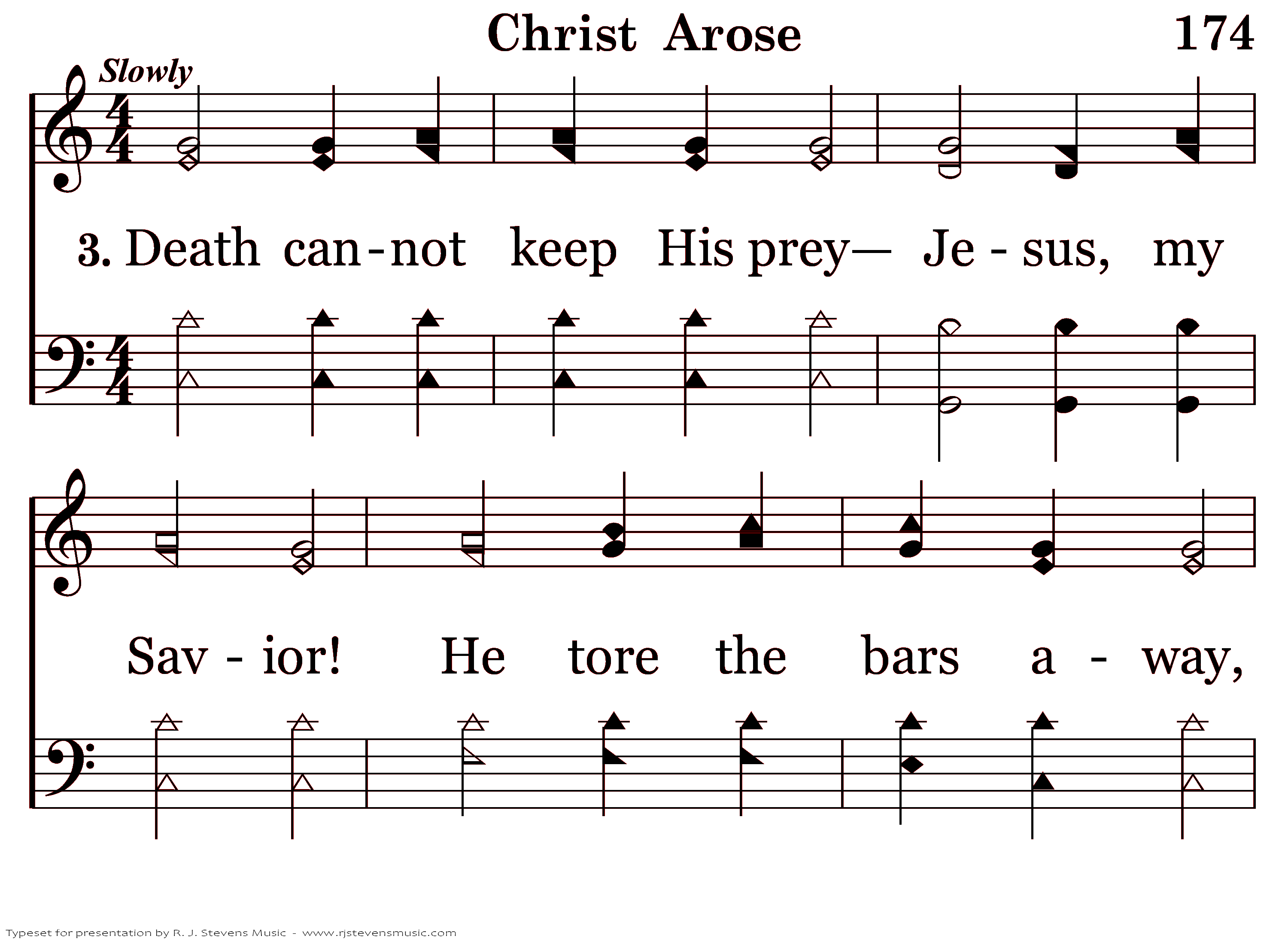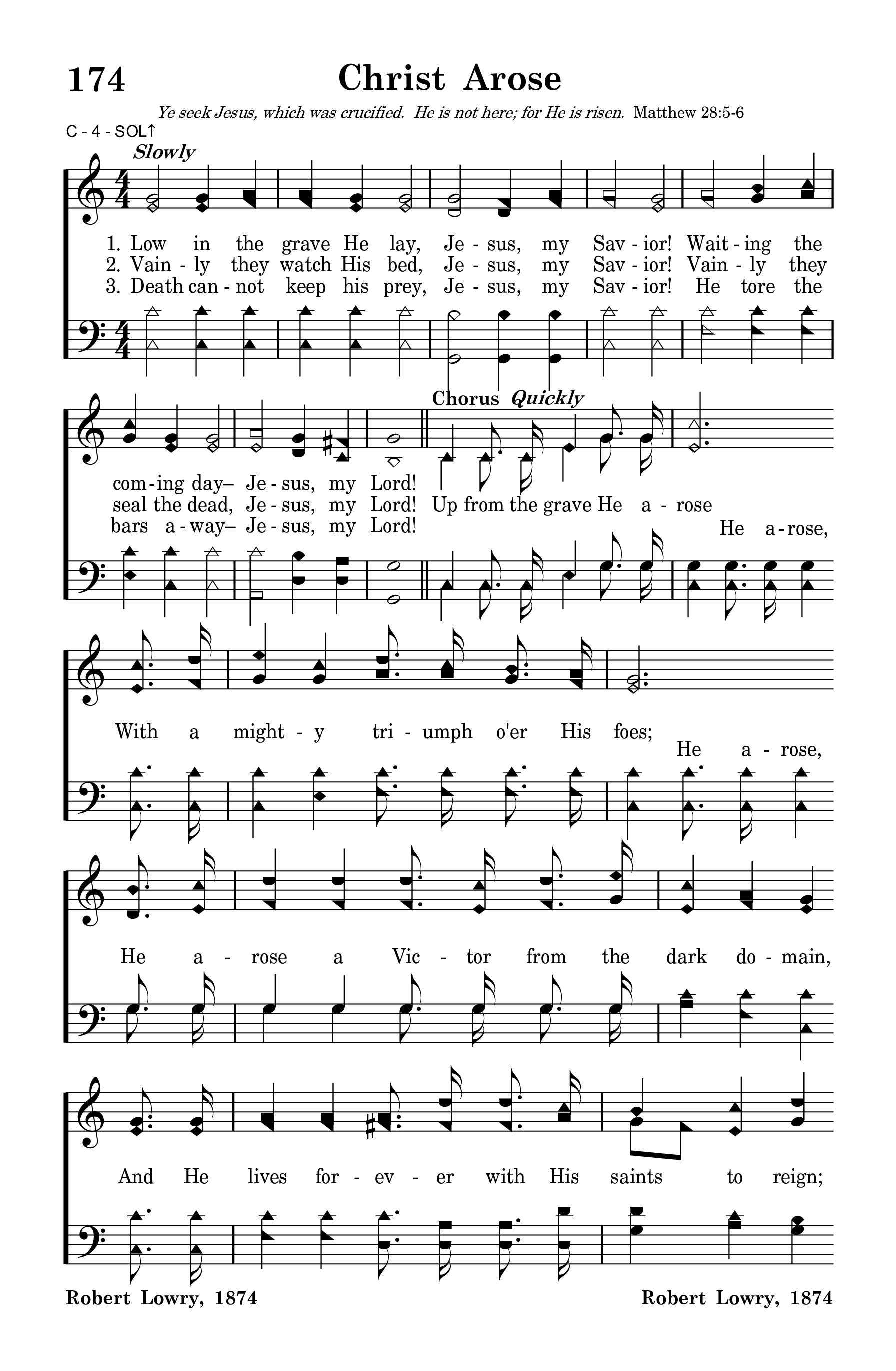 Up from the grave He arose With a mighty triumph o'er His foes, He arose a Victor from the dark domain And He lives forever with His saints to reign; He arose, He arose! Hallelujah! Christ arose!