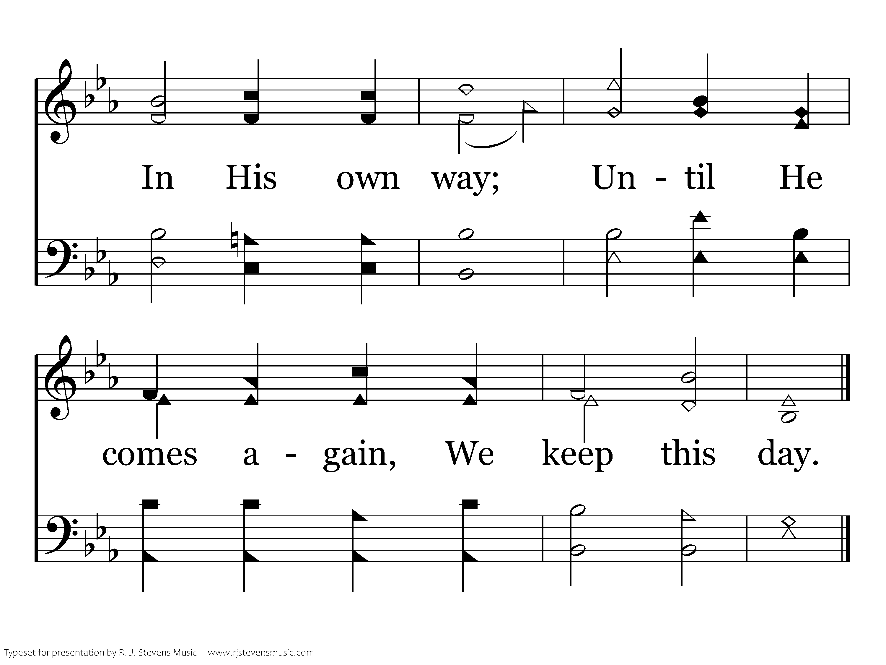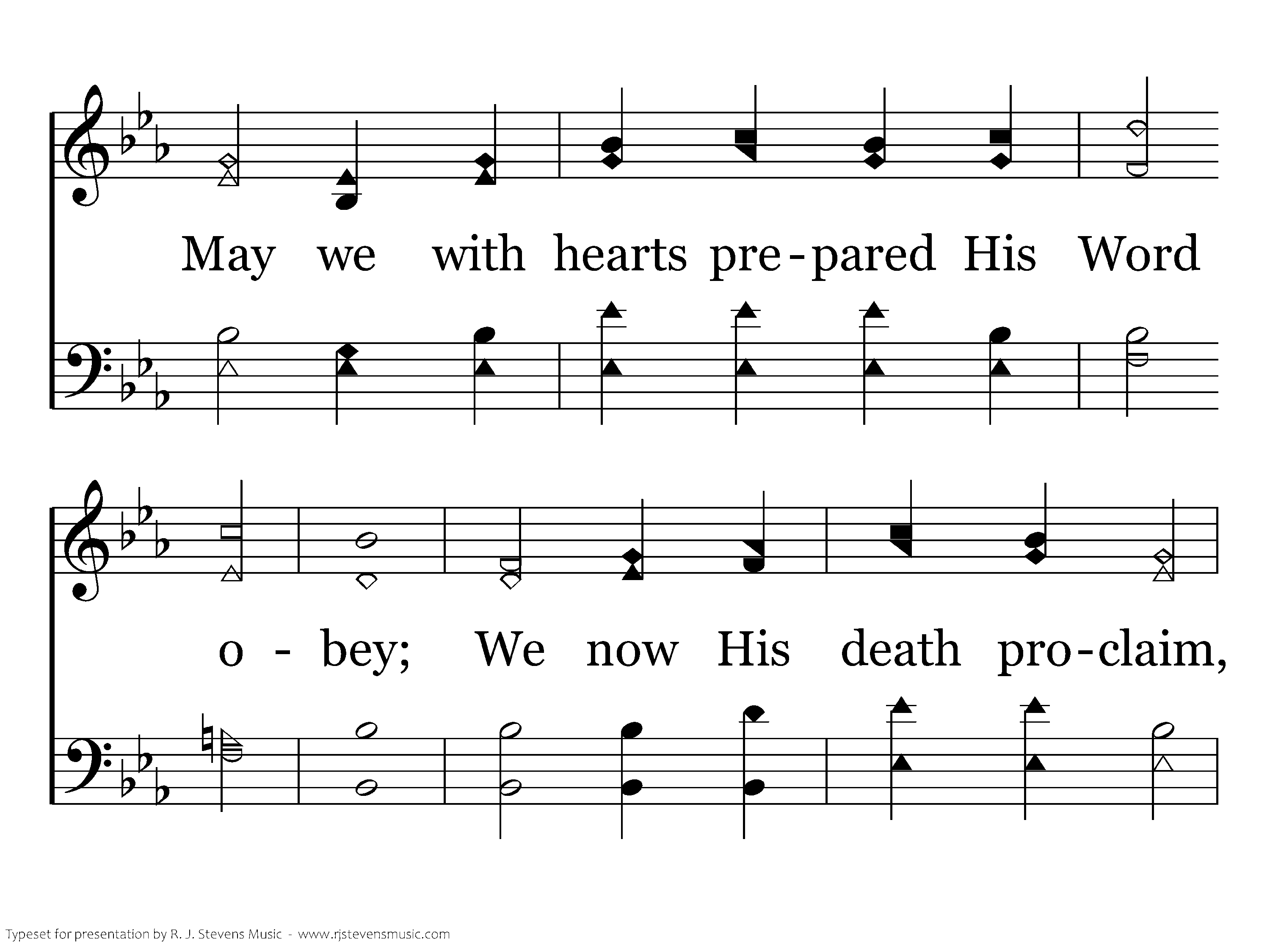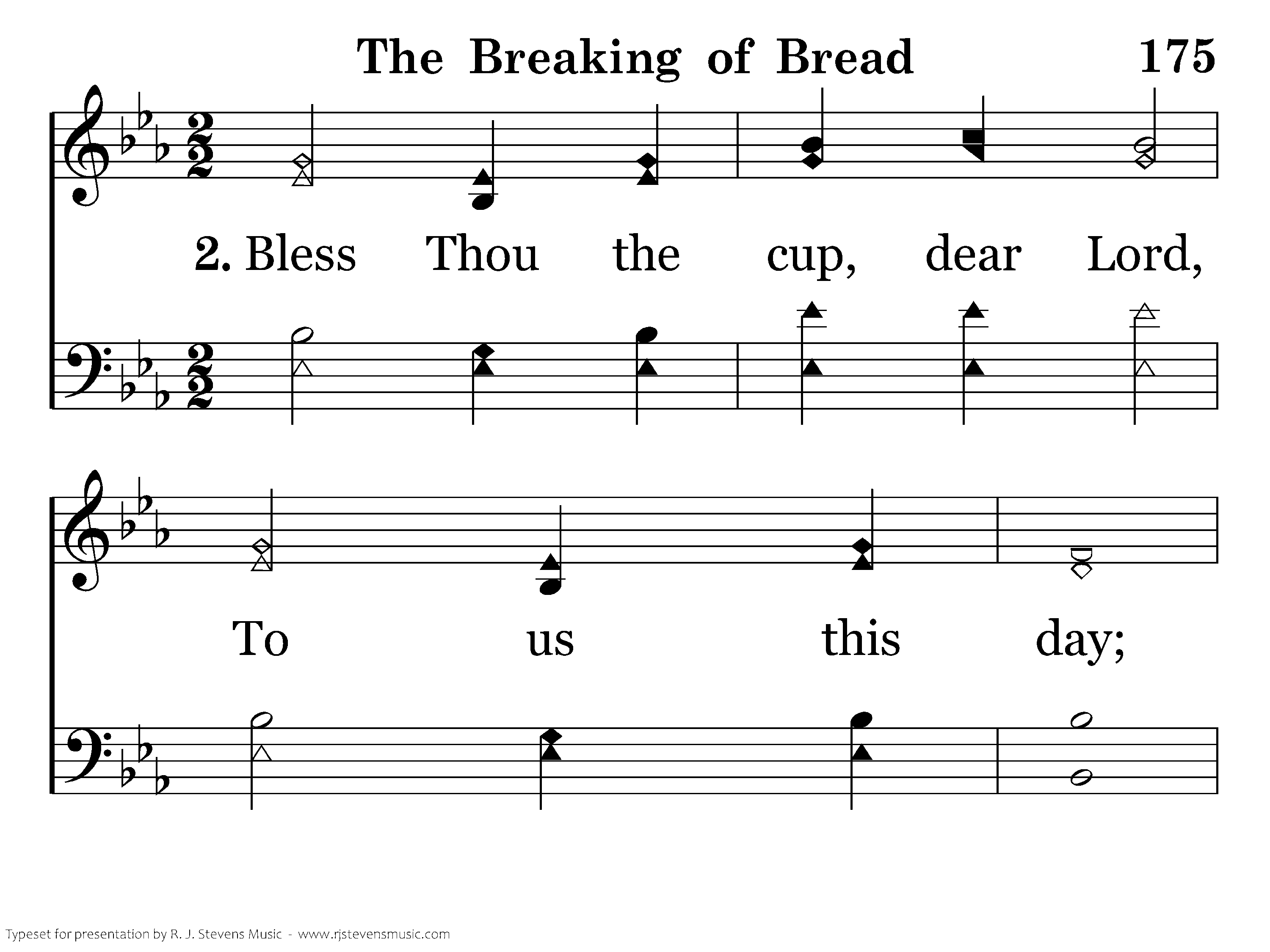 Bless thou the cup, dear Lord, To us this day; May we with hearts prepared His words obey; We now His death proclaim In His own way; Until He comes again, We keep this day.