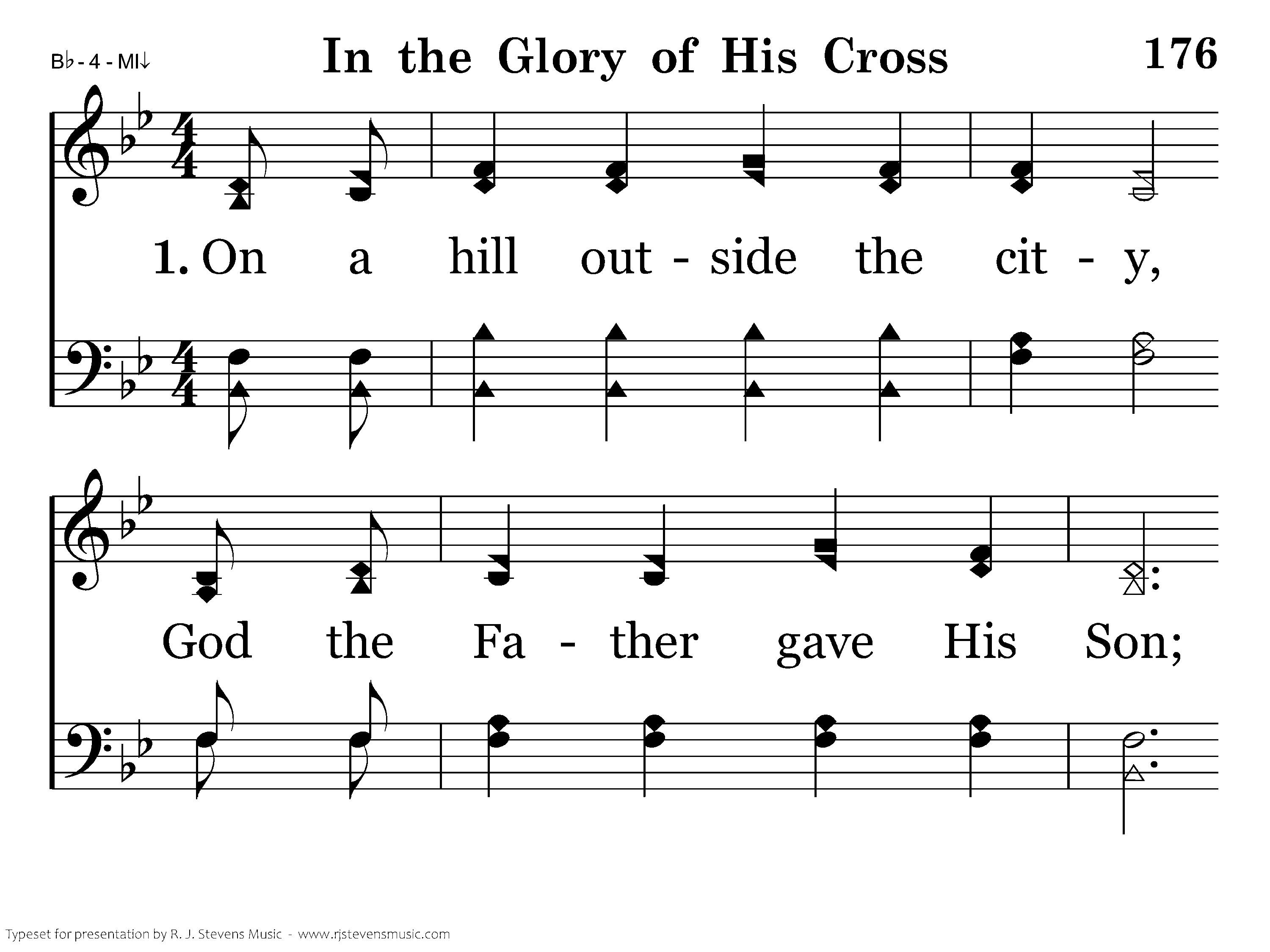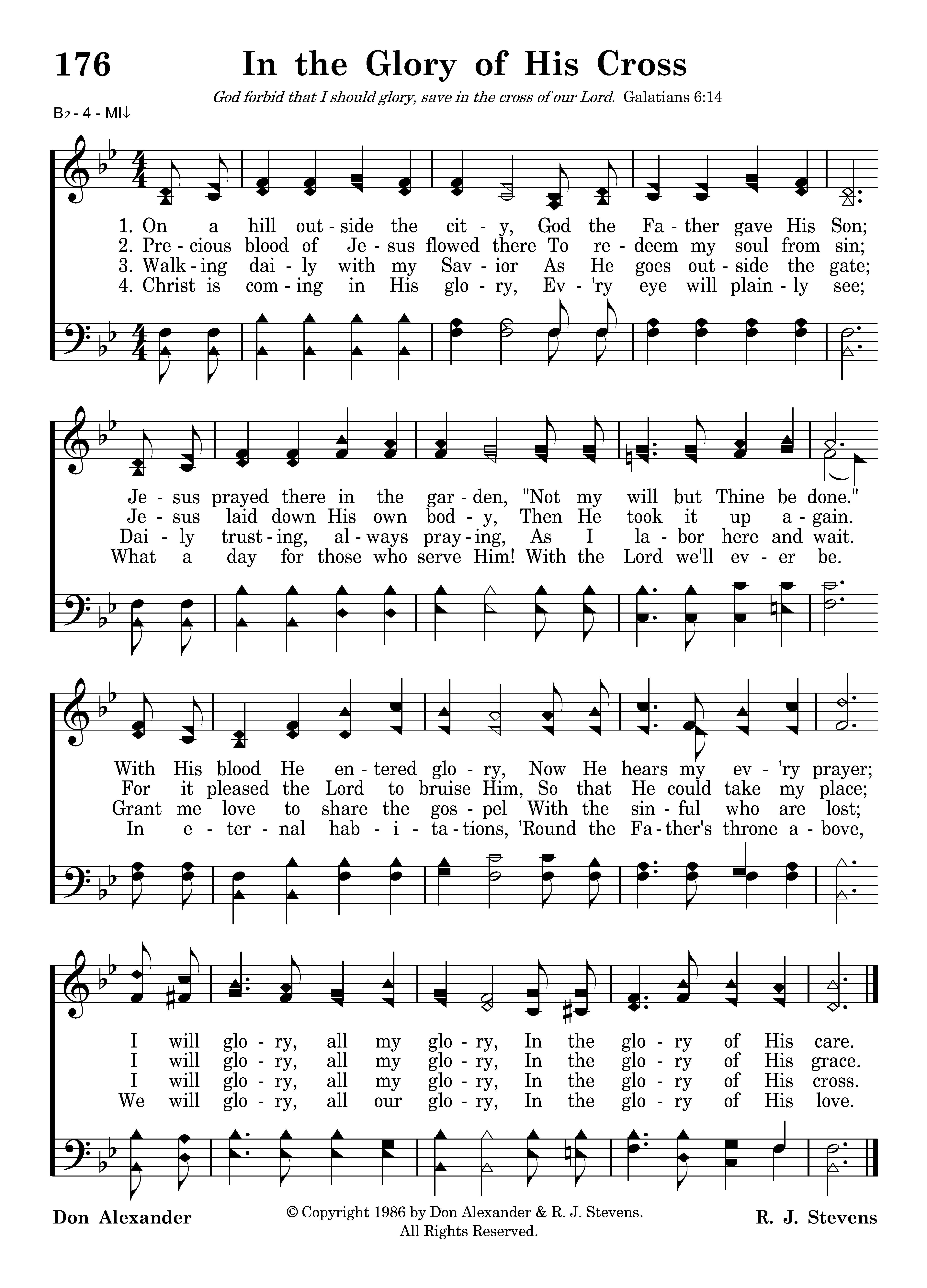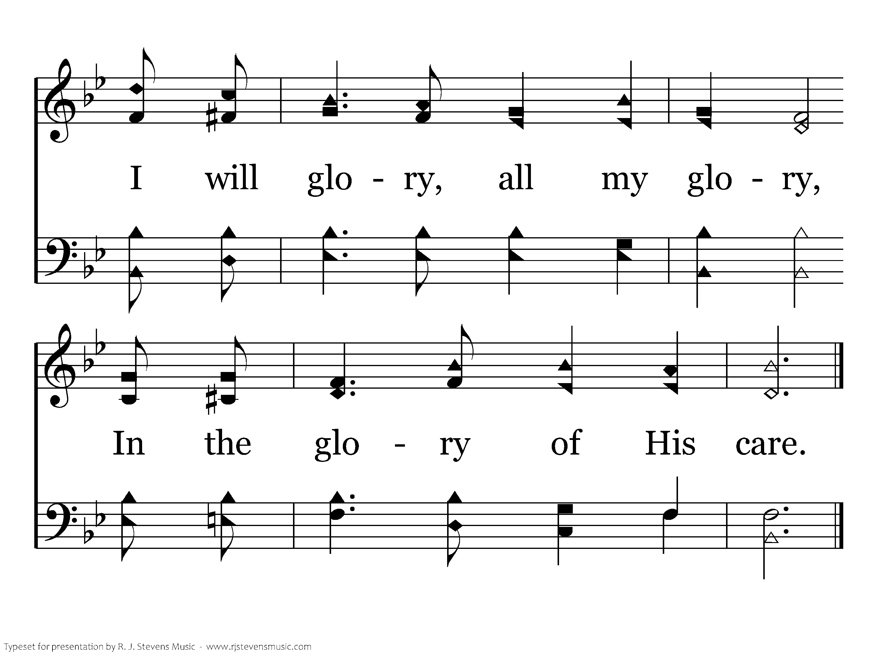 On a hill outside the city, God the Father gave his Son; Jesus prayed there, in the garden, "Not my will but Thine be done." With His blood He entered glory, Now he hears my ev'ry prayer; I will glory, all my glory, In the glory of His care.