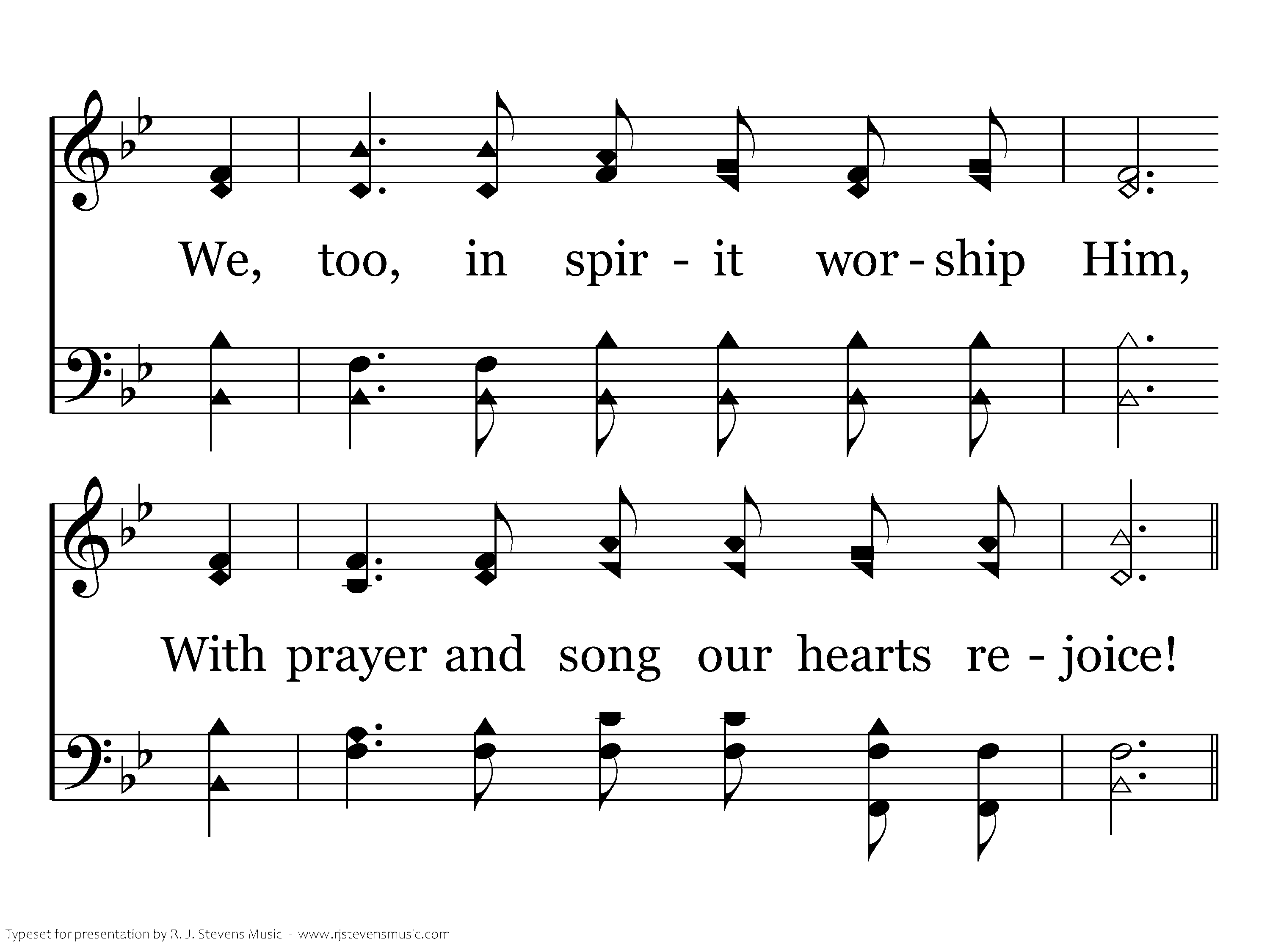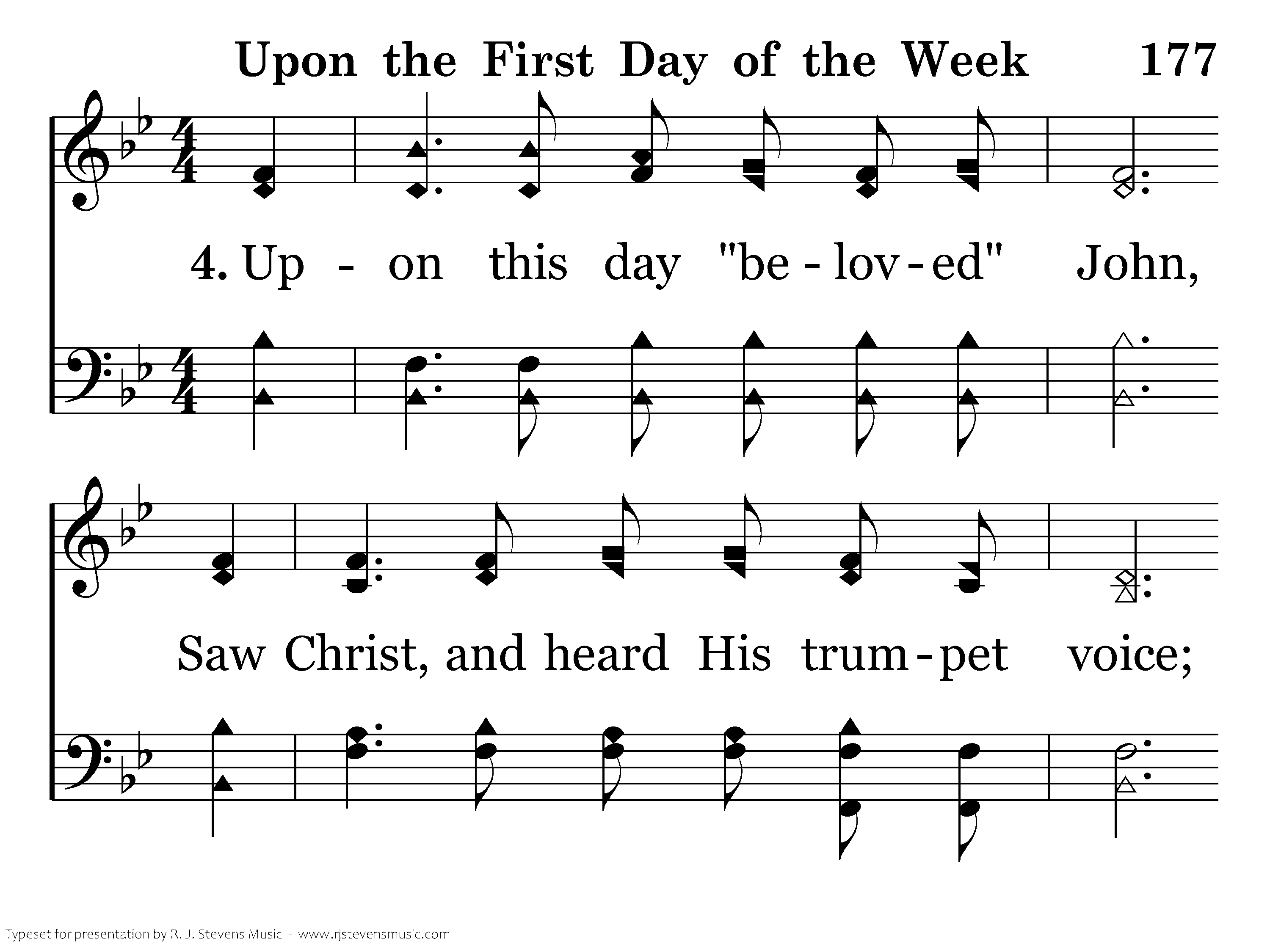 Upon the day "beloved" John, Saw Christ, and heard His trumpet voice; We, too, in spirit worship Him, With prayer and song our hearts rejoice!