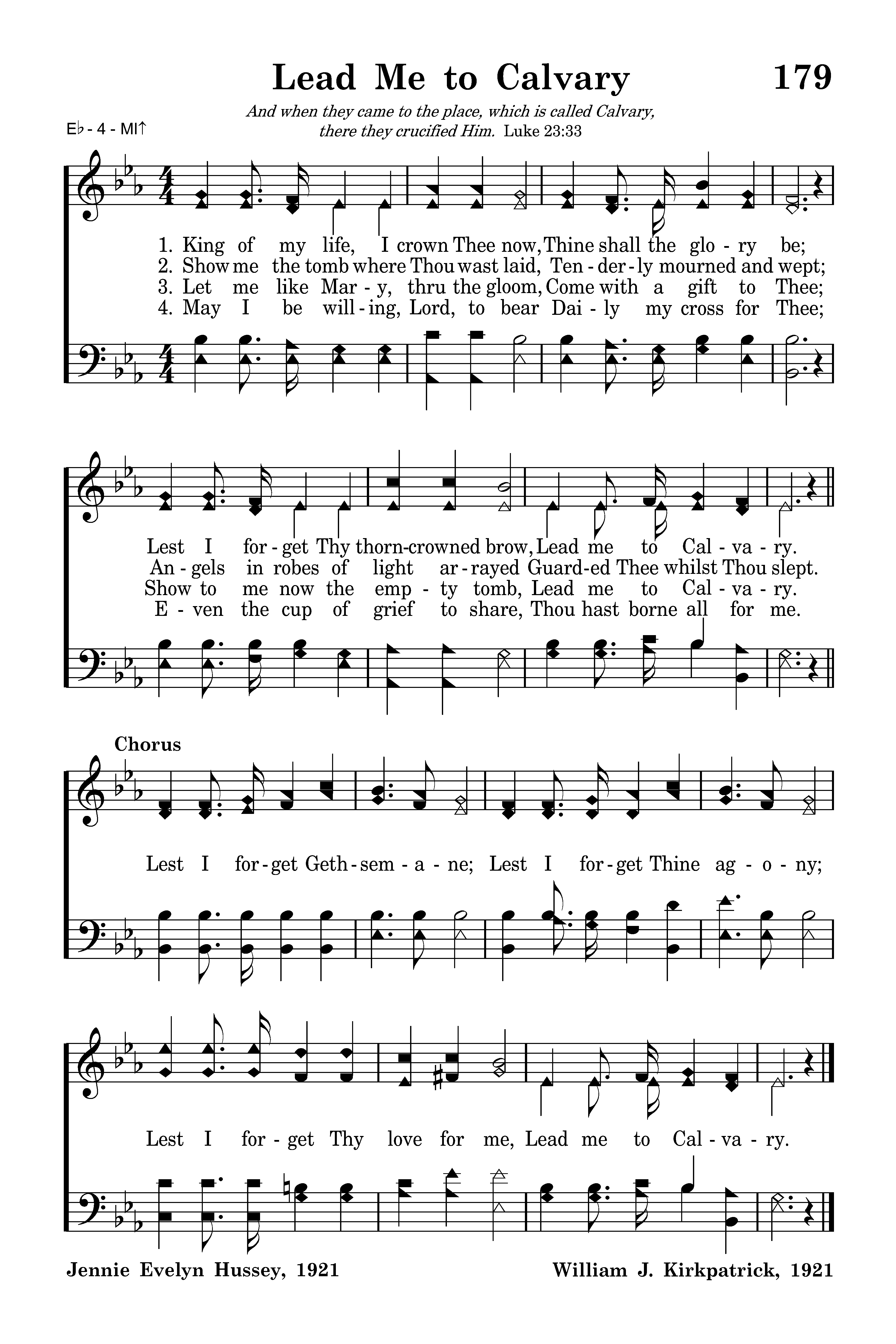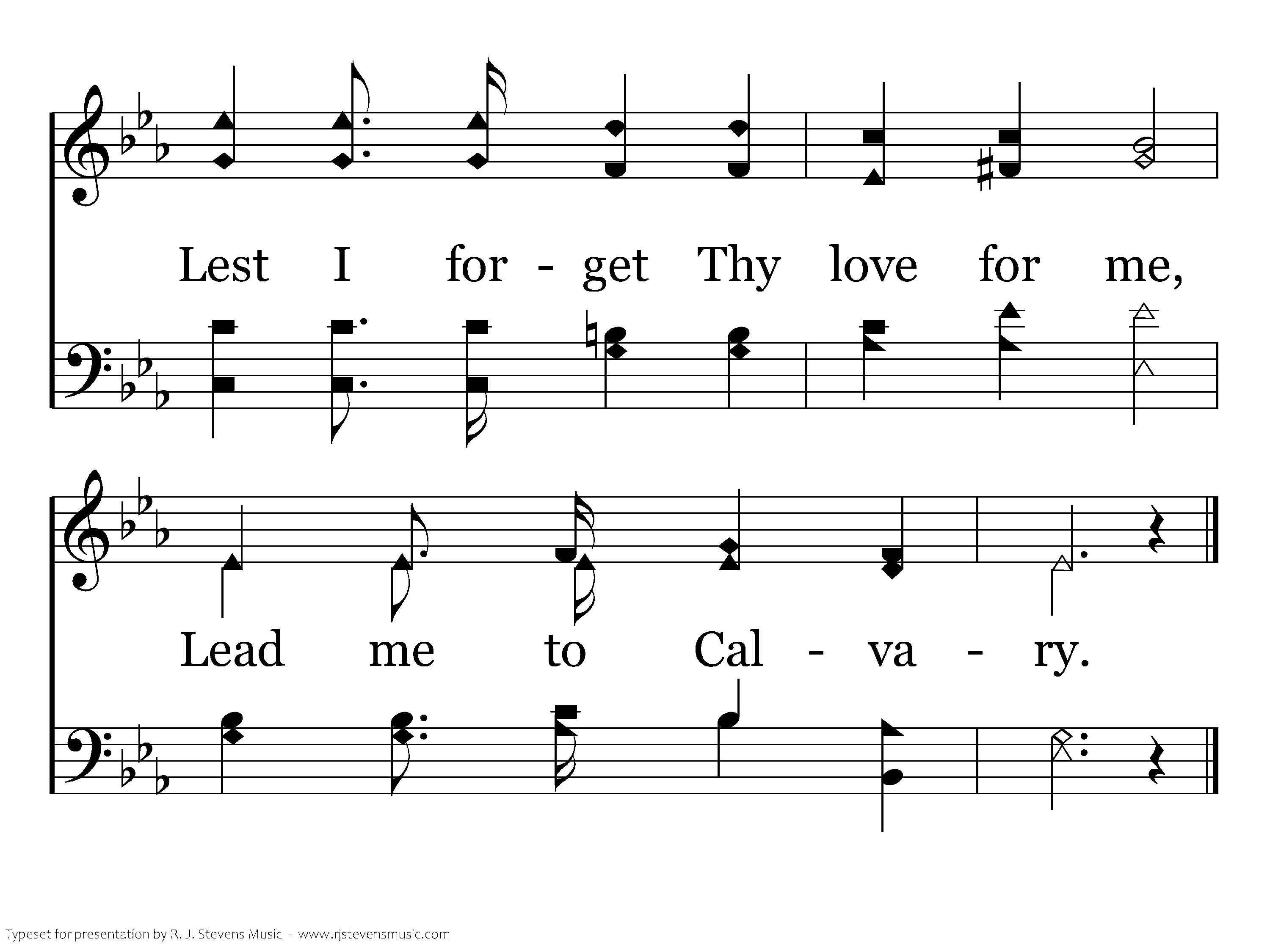 Lest I forget Gethsemane, Lest I forget Thine agony, Lest I forget Thy love for me, Lead me to Calvary.
