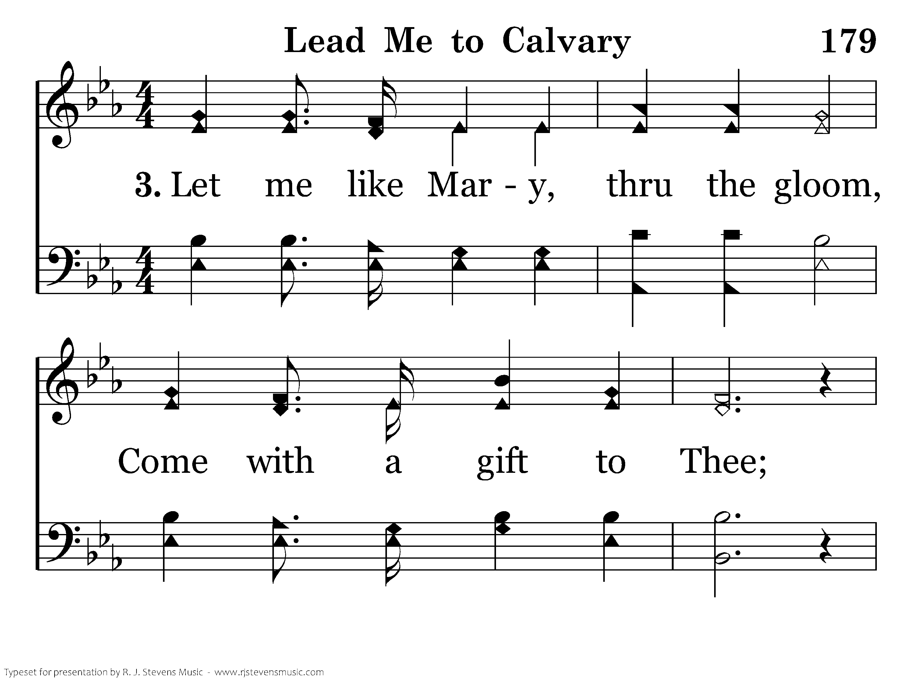 Let me like Mary, Thru the gloom Come with a gift to Thee; Show to me now the empty tomb, Lead me to Calvary.