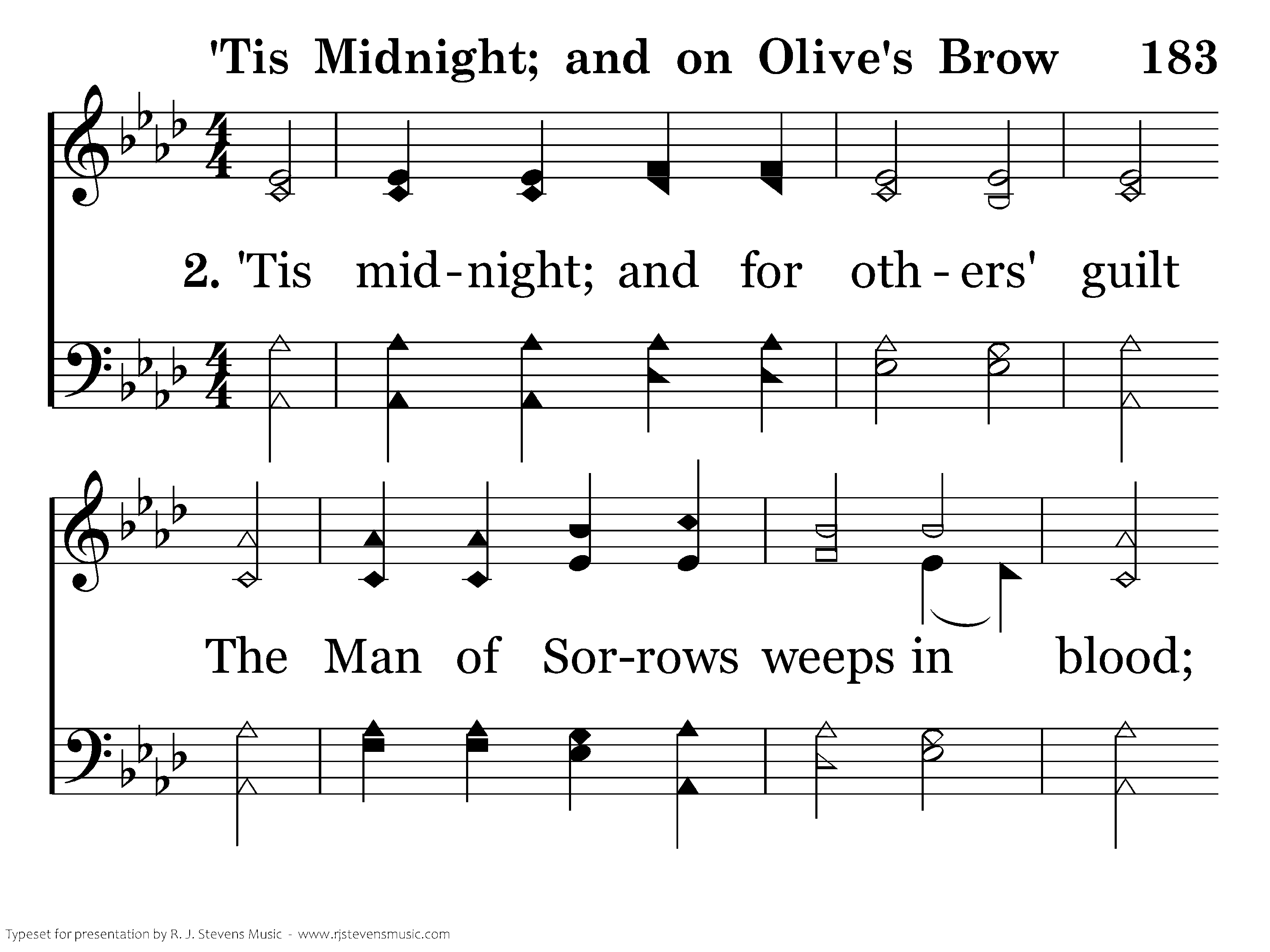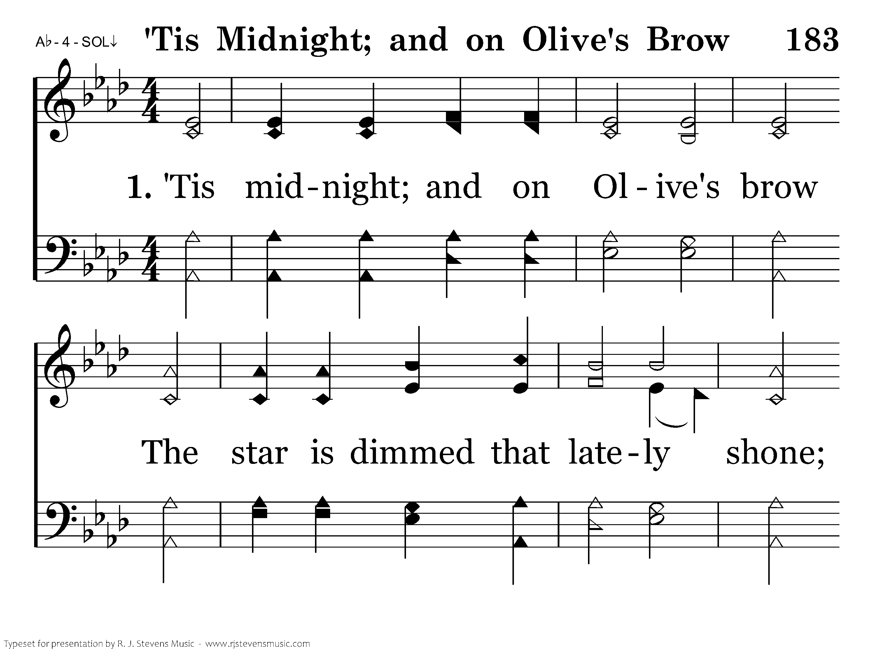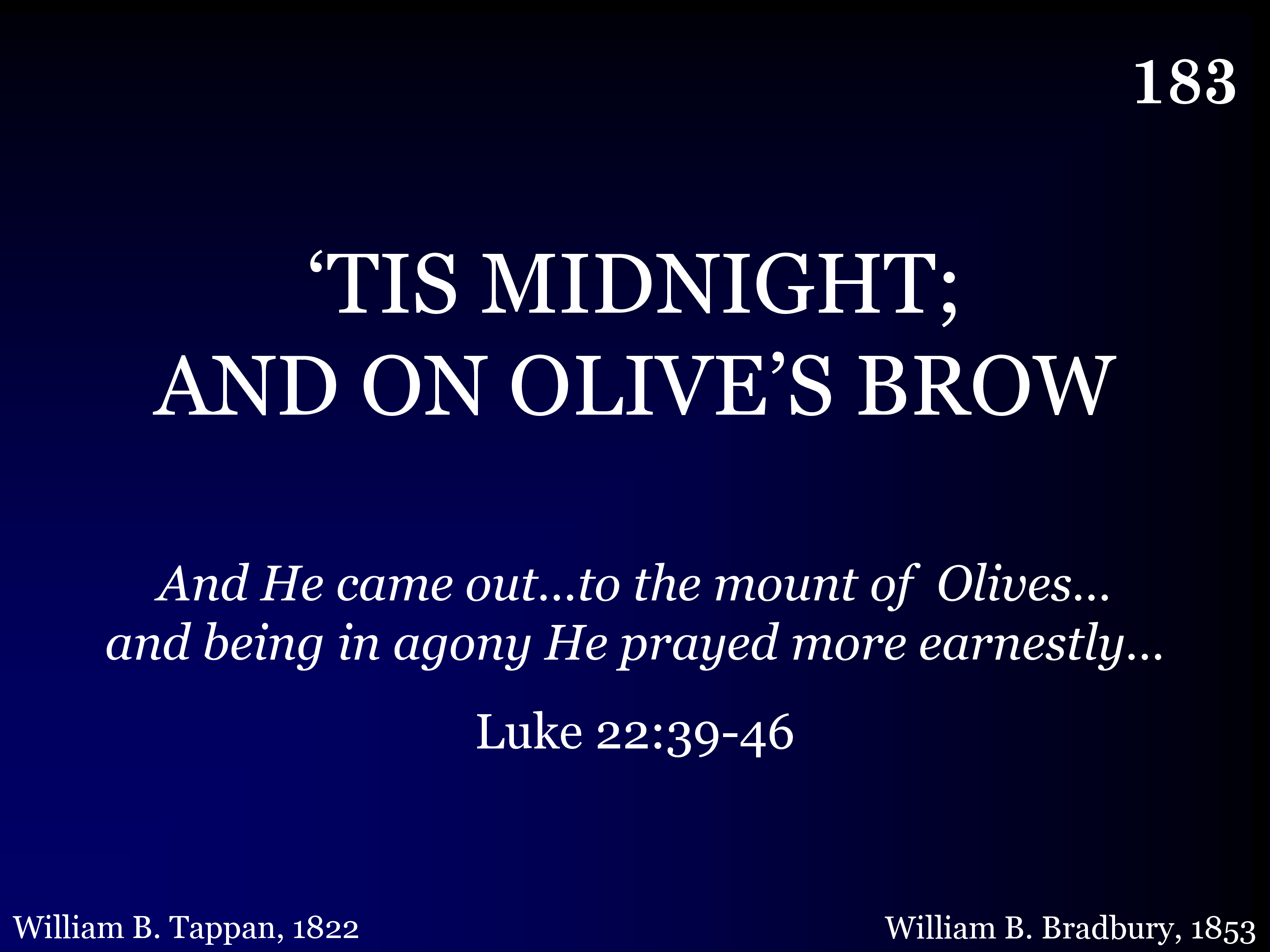 Tis midnight; and on Olives' brow The star is dimmed that lately shown; 'Tis midnight in the garden, now The suffering Savior prays alone.