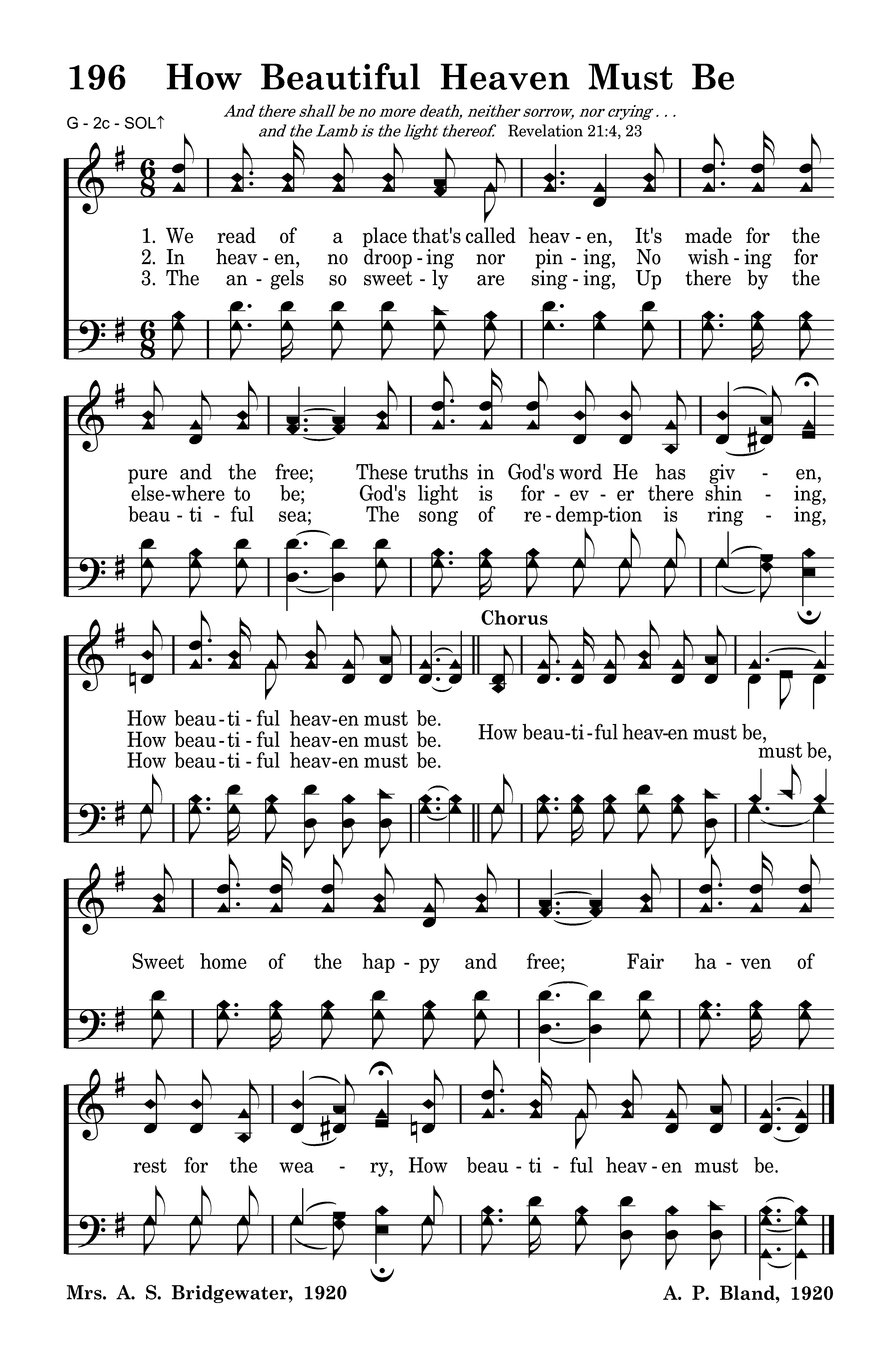 In heaven no drooping nor pining, Nor wishing for else where to be; God's light is forever there shining, How beautiful heaven must be.