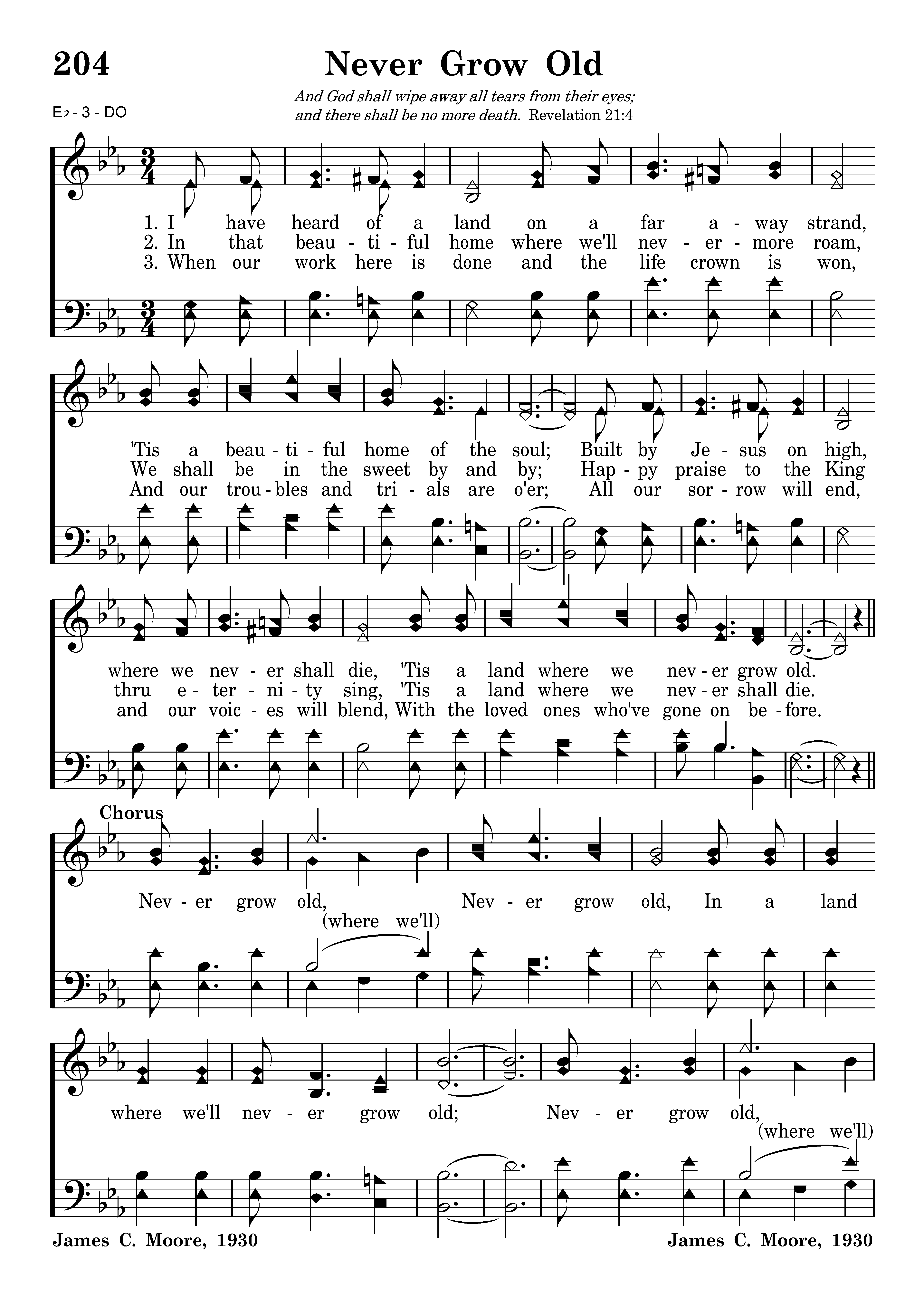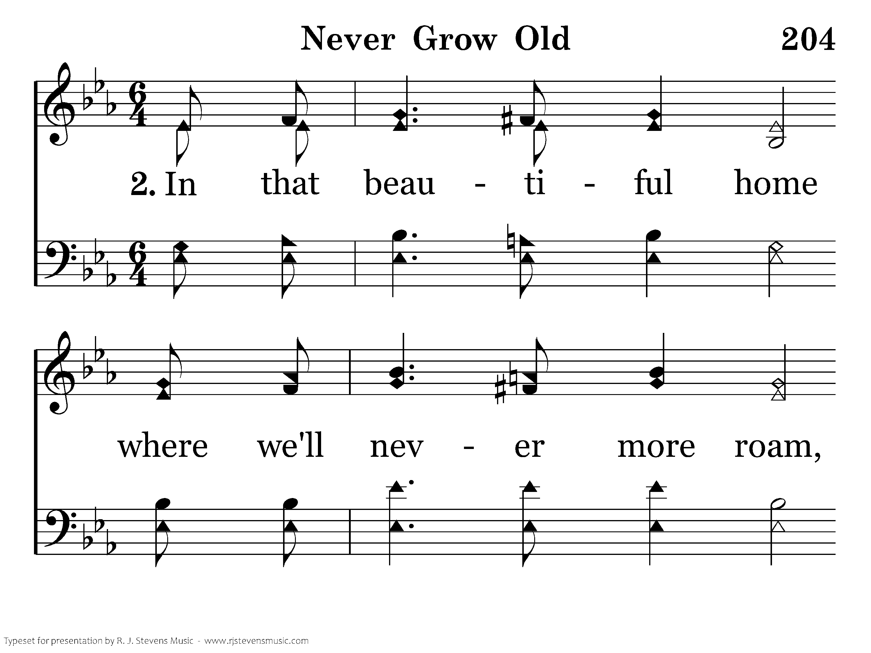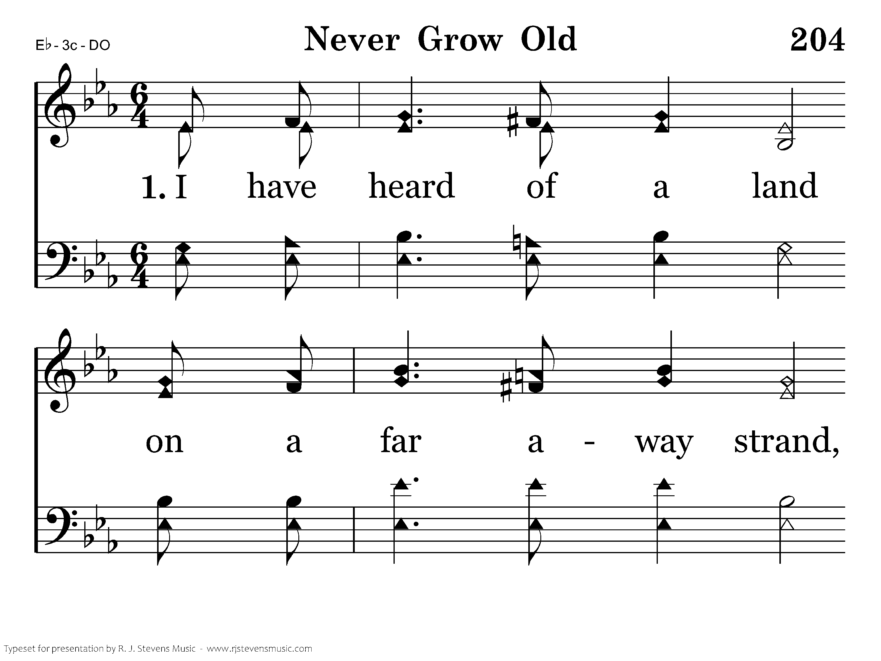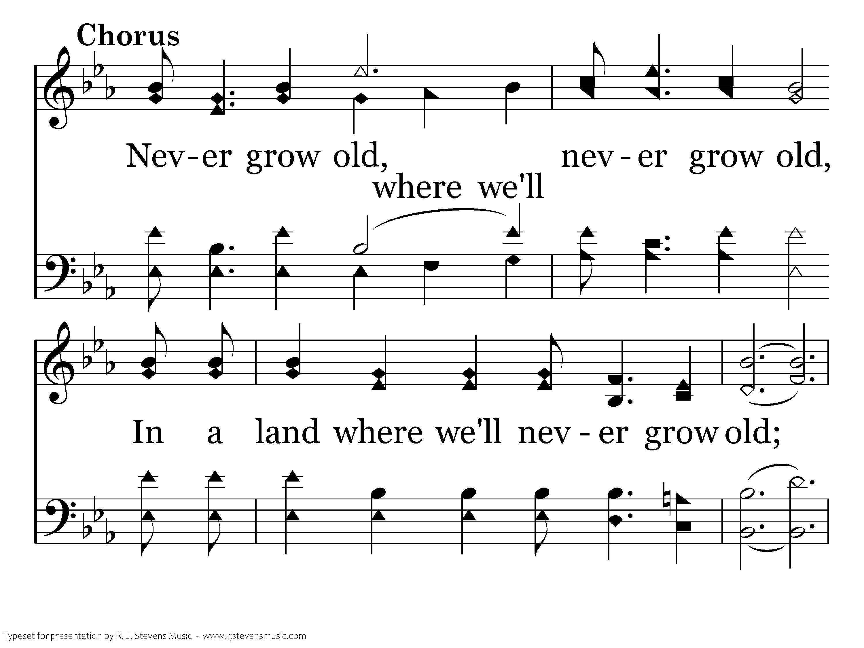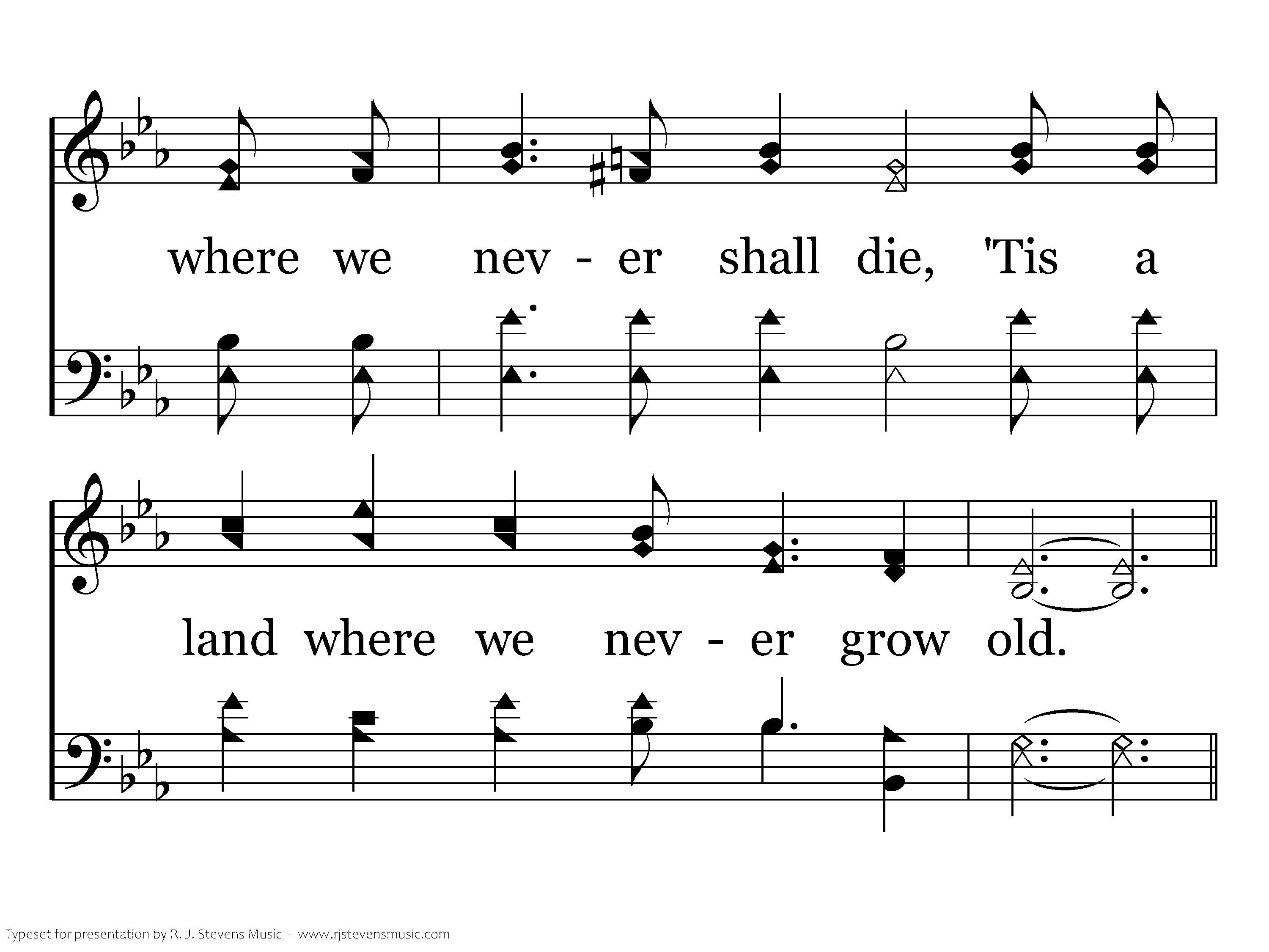 Never grow old, Never grow old, In a land where we'll never grow old; Never grow old, never grow old, In a land where we'll never grow old.