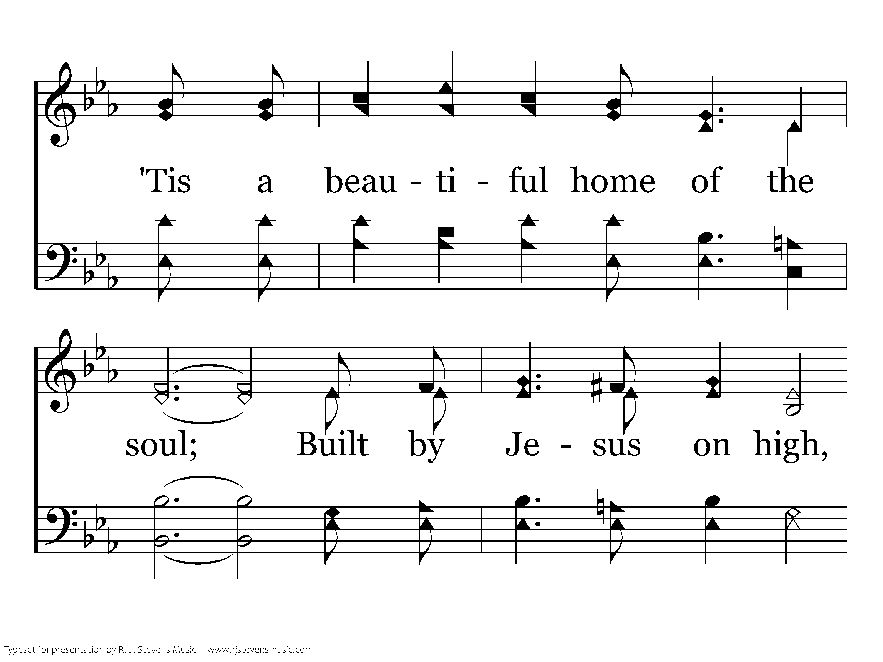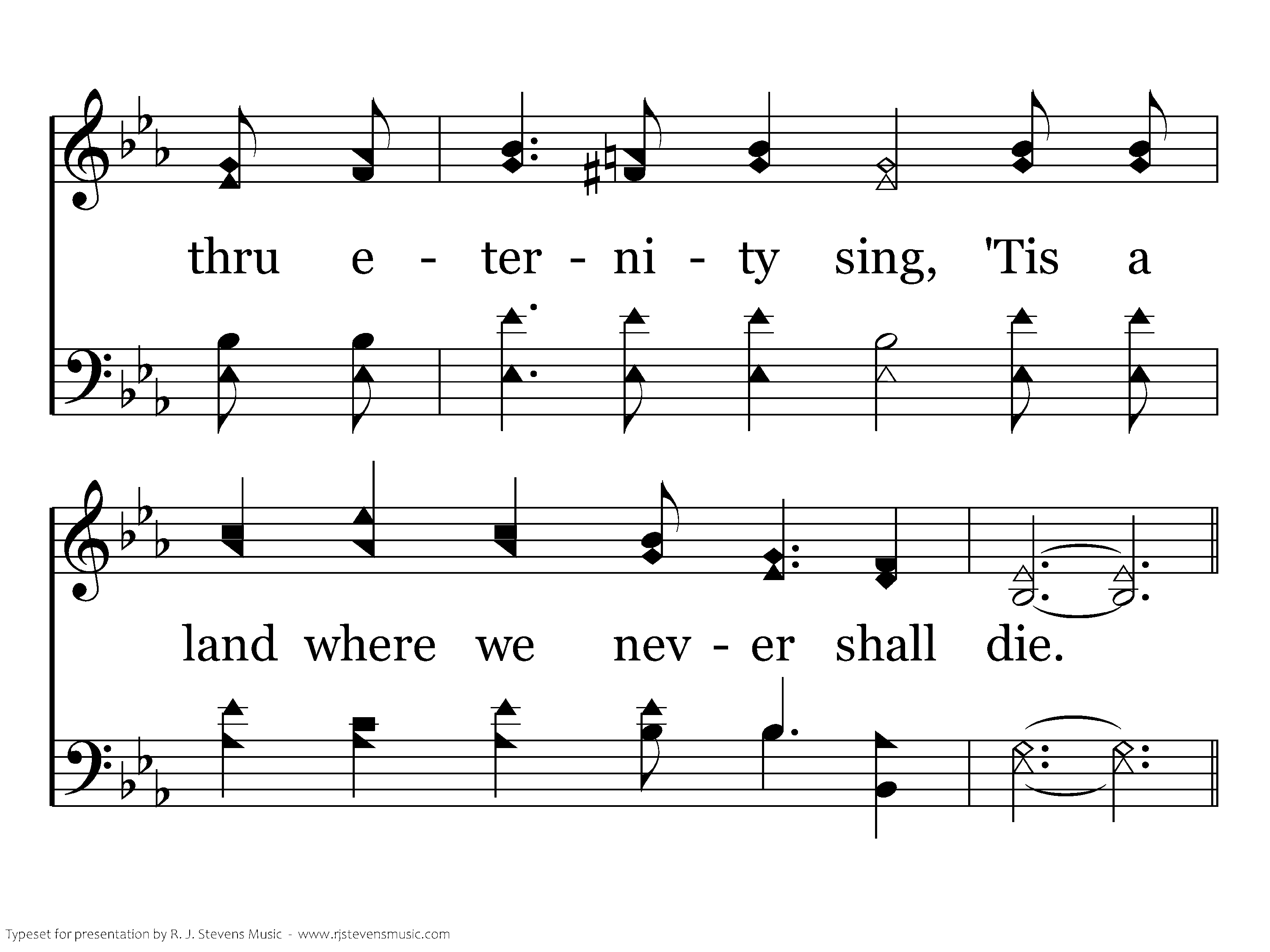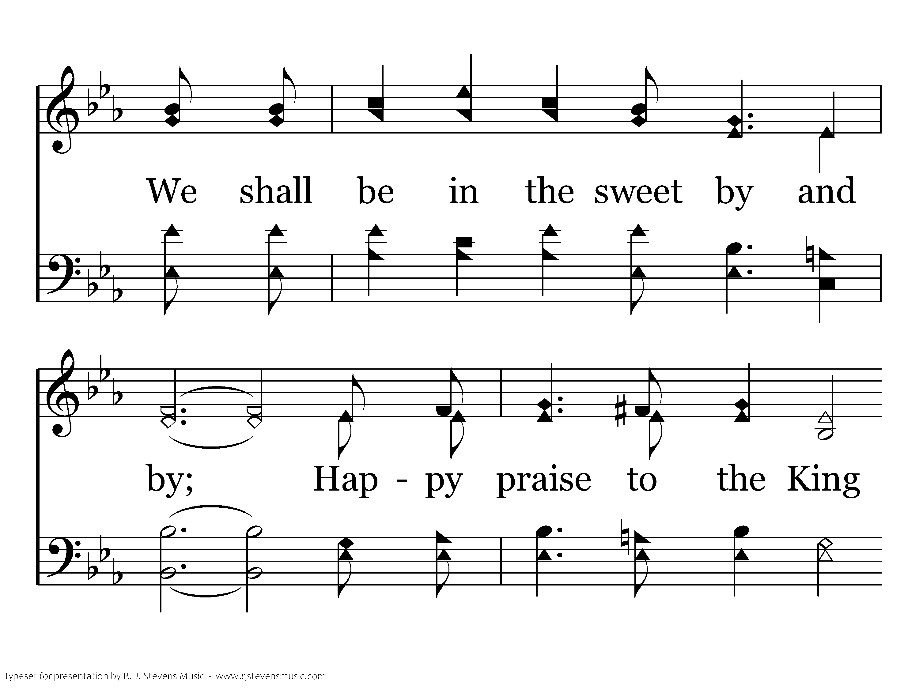In that beautiful home, where we'll nevermore roam, We shall be in the sweet by and by; Happy praise to the king thru eternity sing, 'Tis a land where we never shall die.
