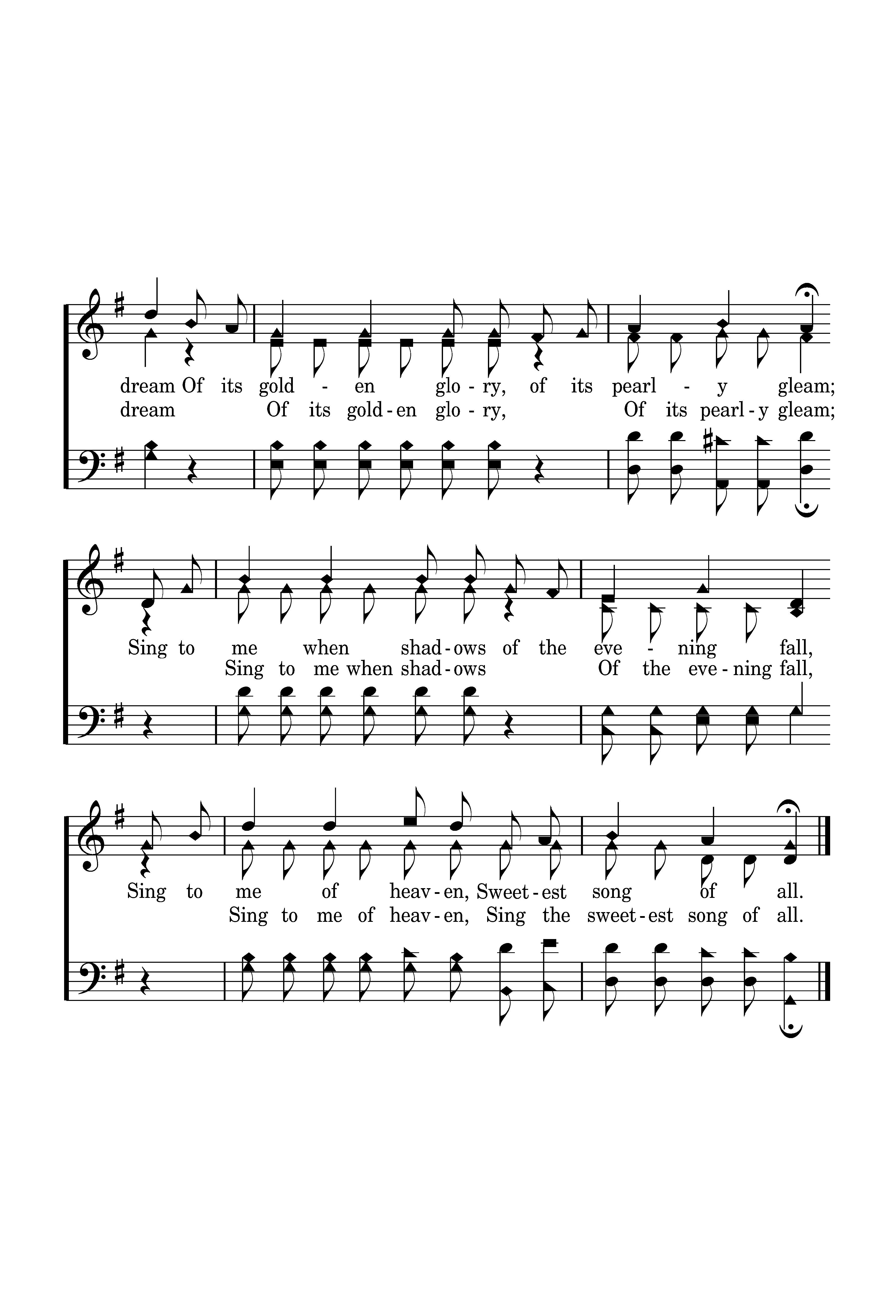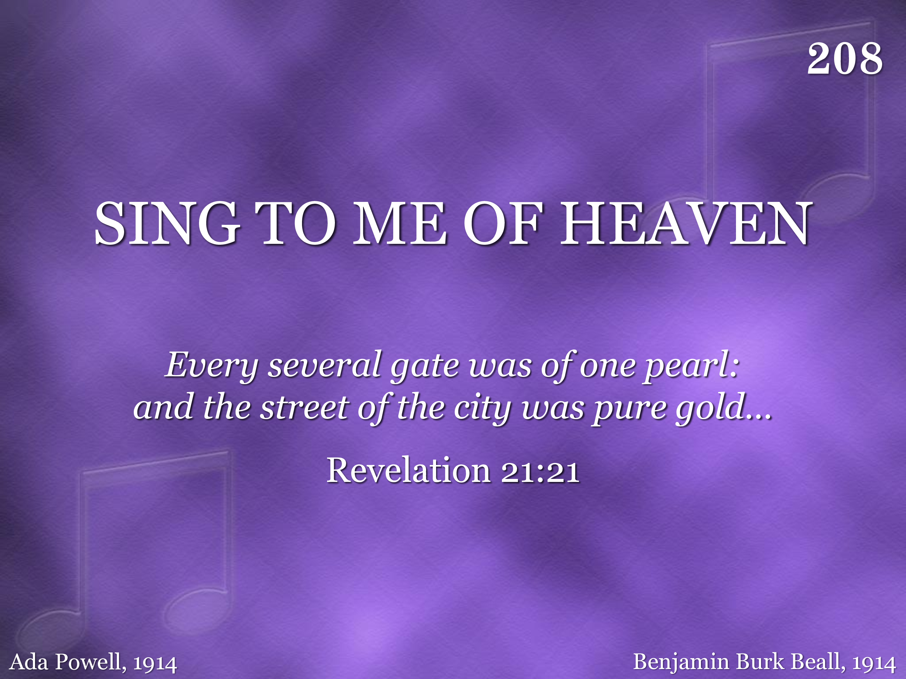 Sing to me of heaven, let me fondly dream Of its golden glory, of its pearly gleam; Sing to me when shadows of the evening fall, Sing to me of heaven, Sweetest song of all.