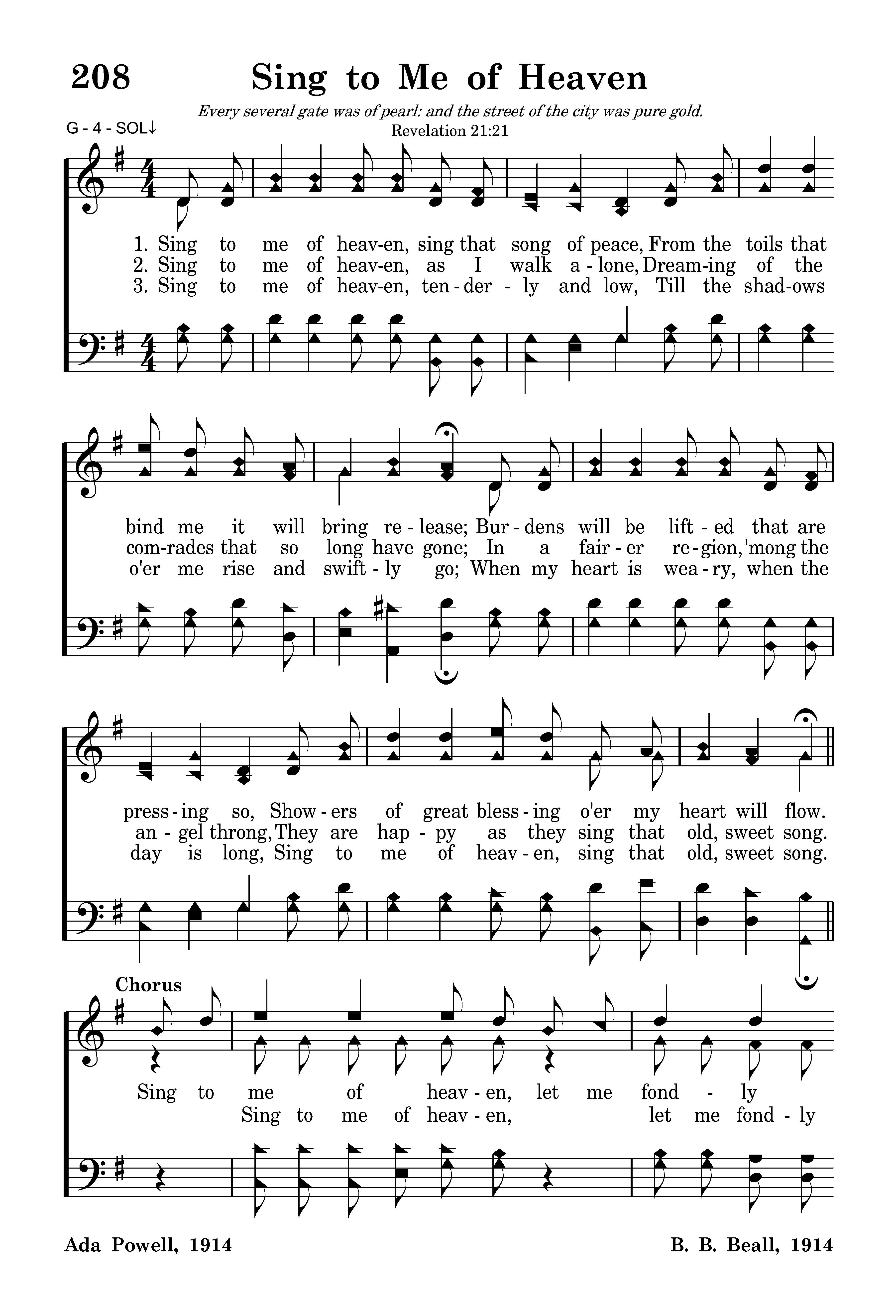 Sing to me of heaven, sing that song of peace From the toil that binds me it will bring release; Burdens will be lifted that are pressing so, Showers of great blessings o'er my heart will flow.