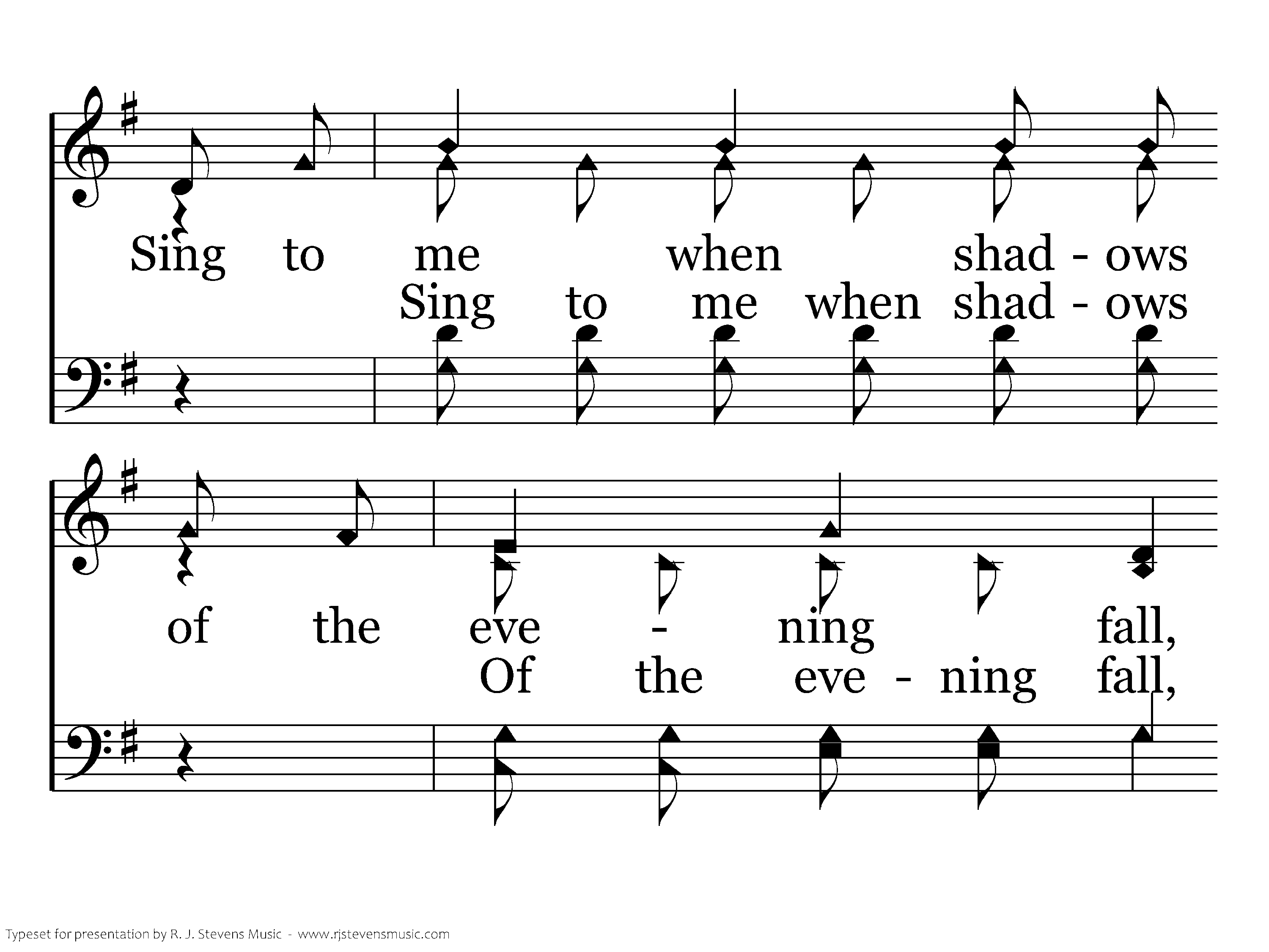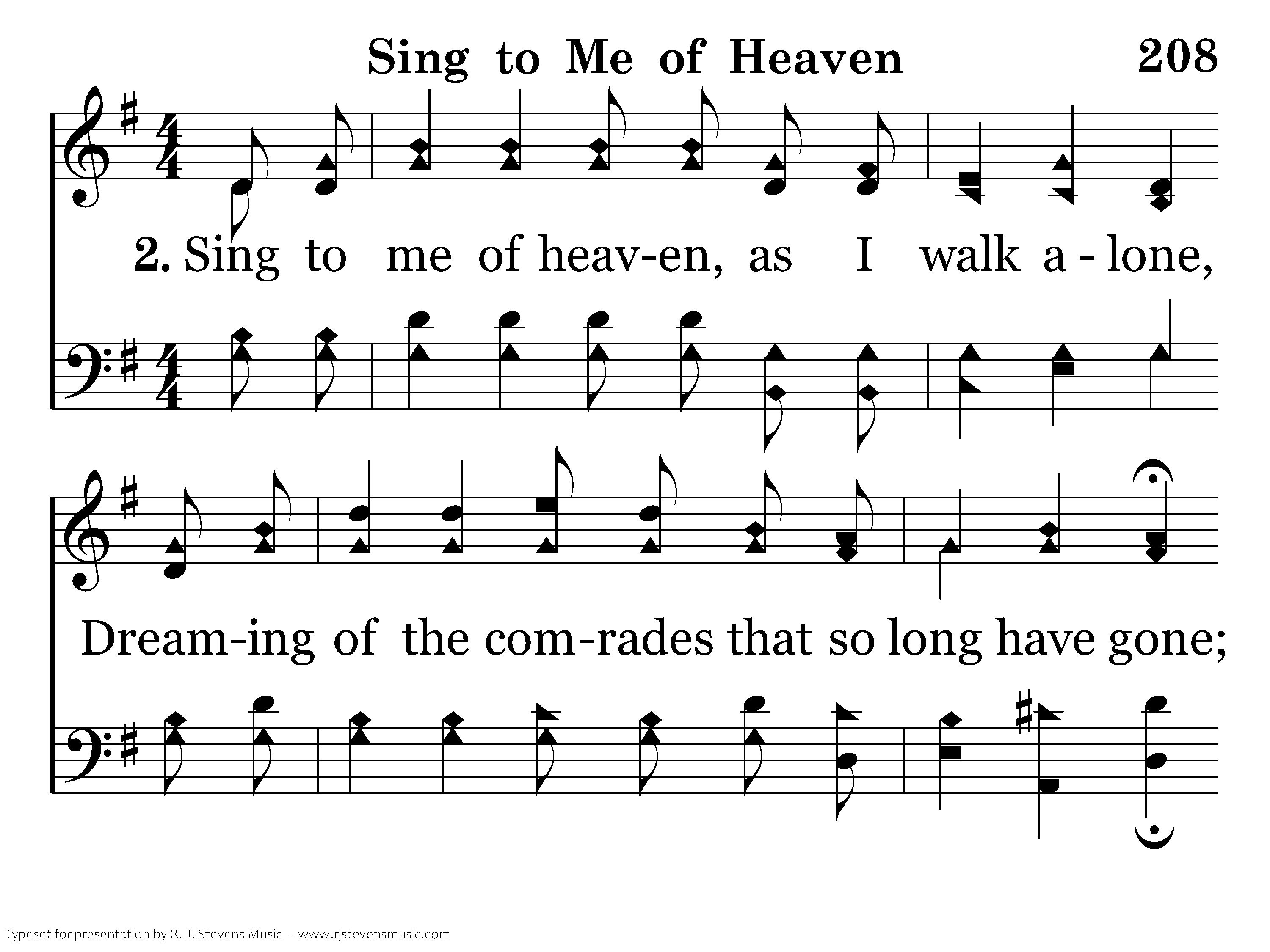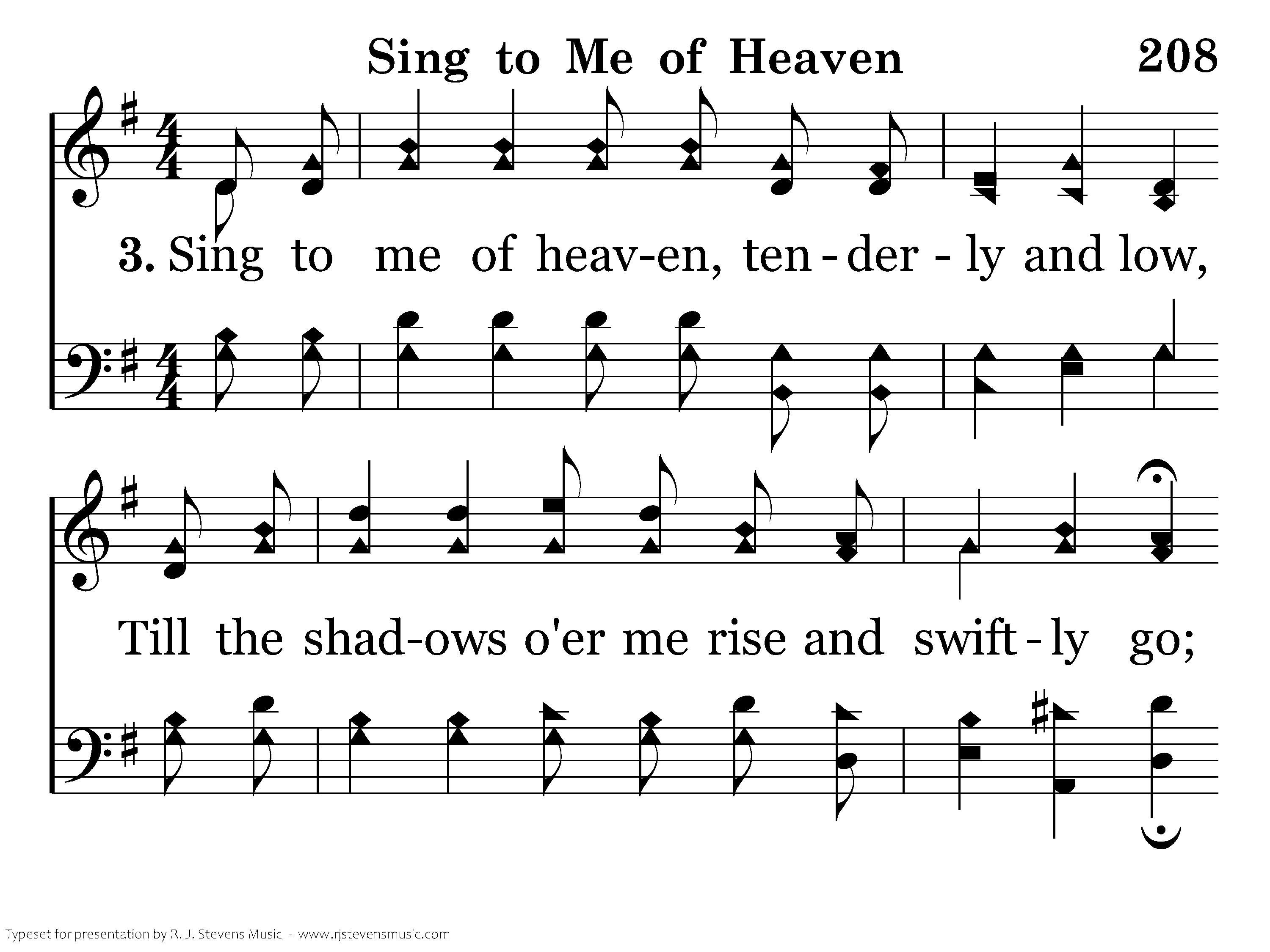 Sing to me of heaven, tenderly and low, Till the shadows o'er me rise and swiftly go; When my heart is weary, when the day is long, Sing to me of heaven, sing that old sweet song.