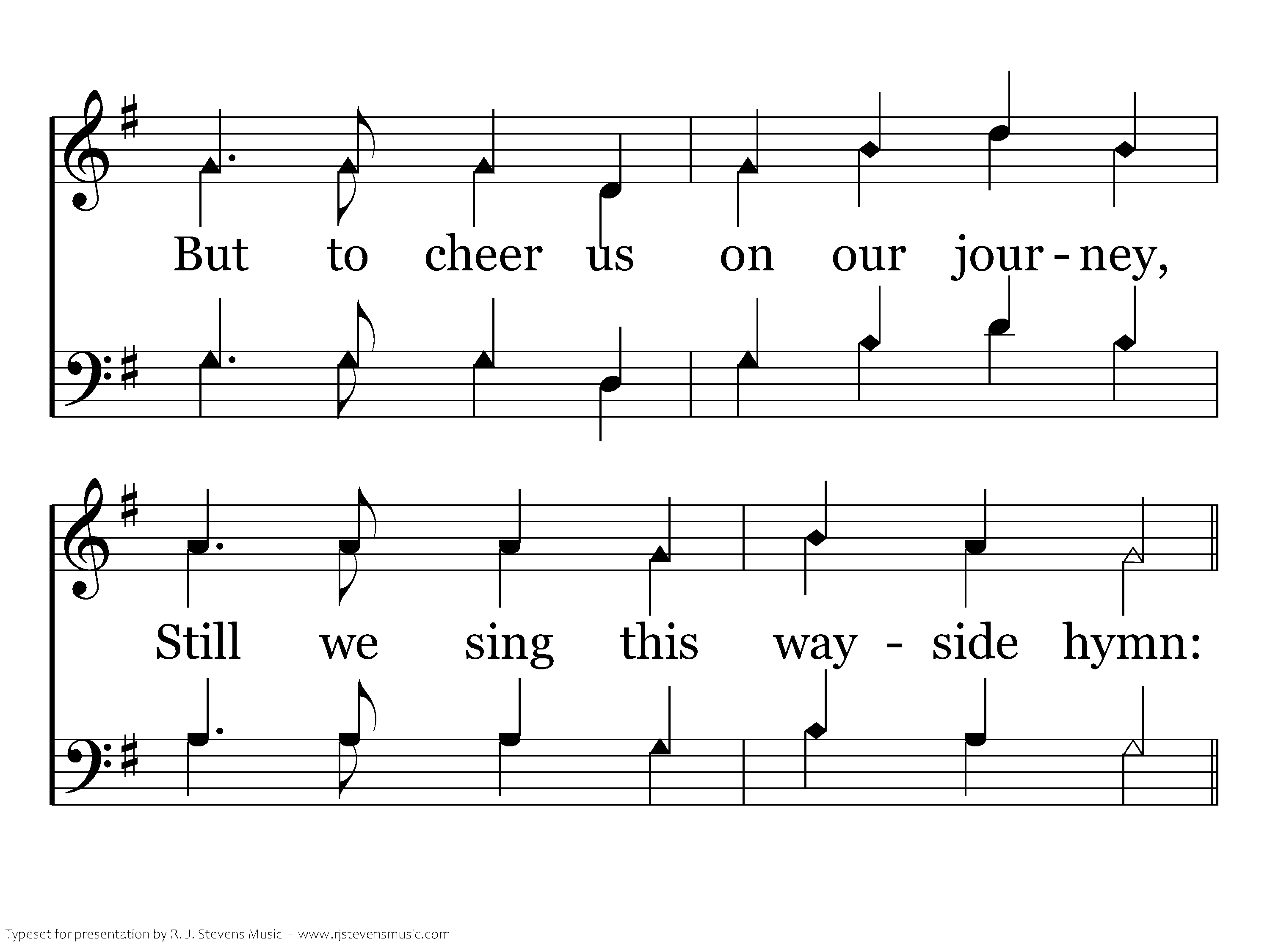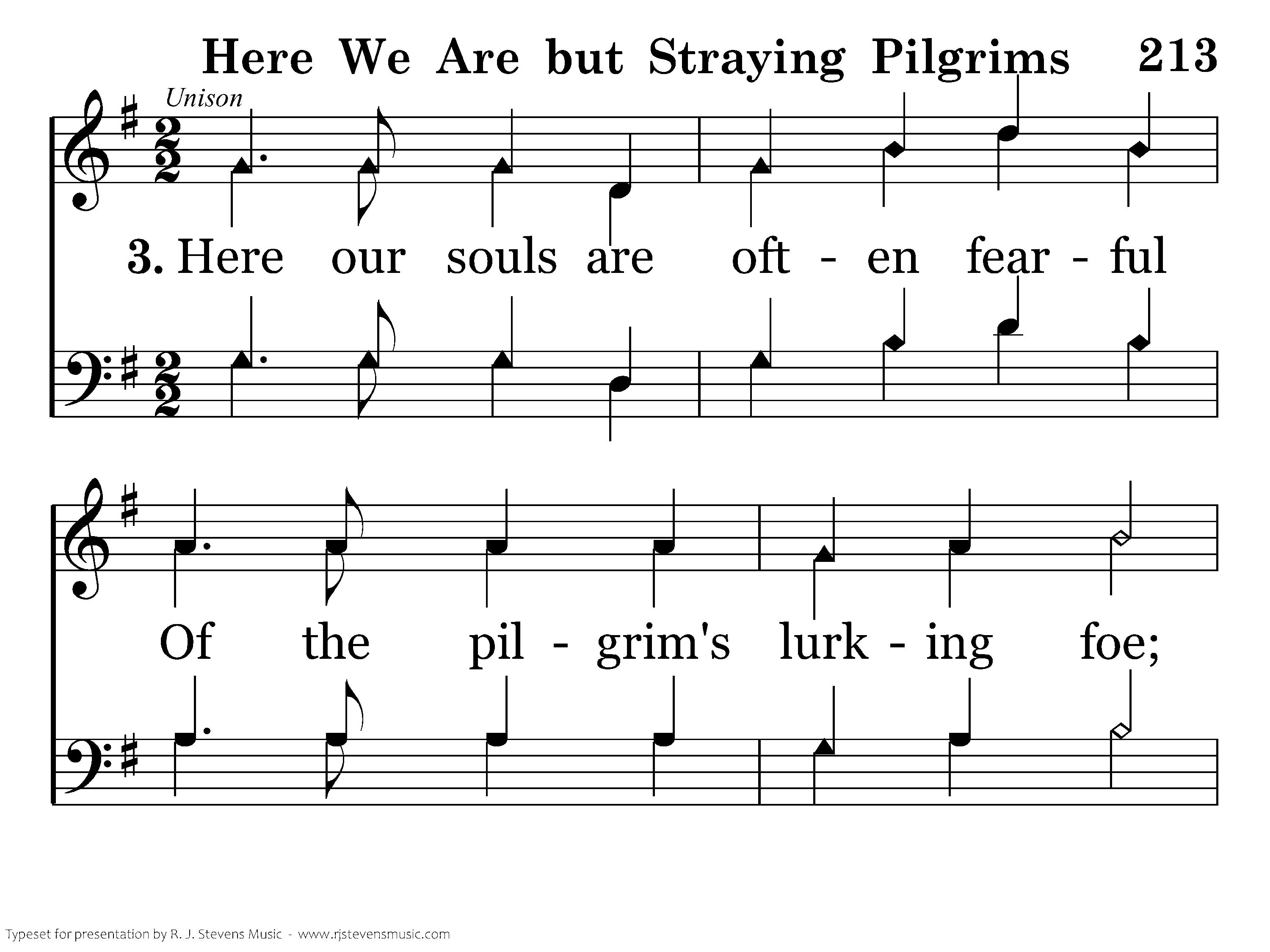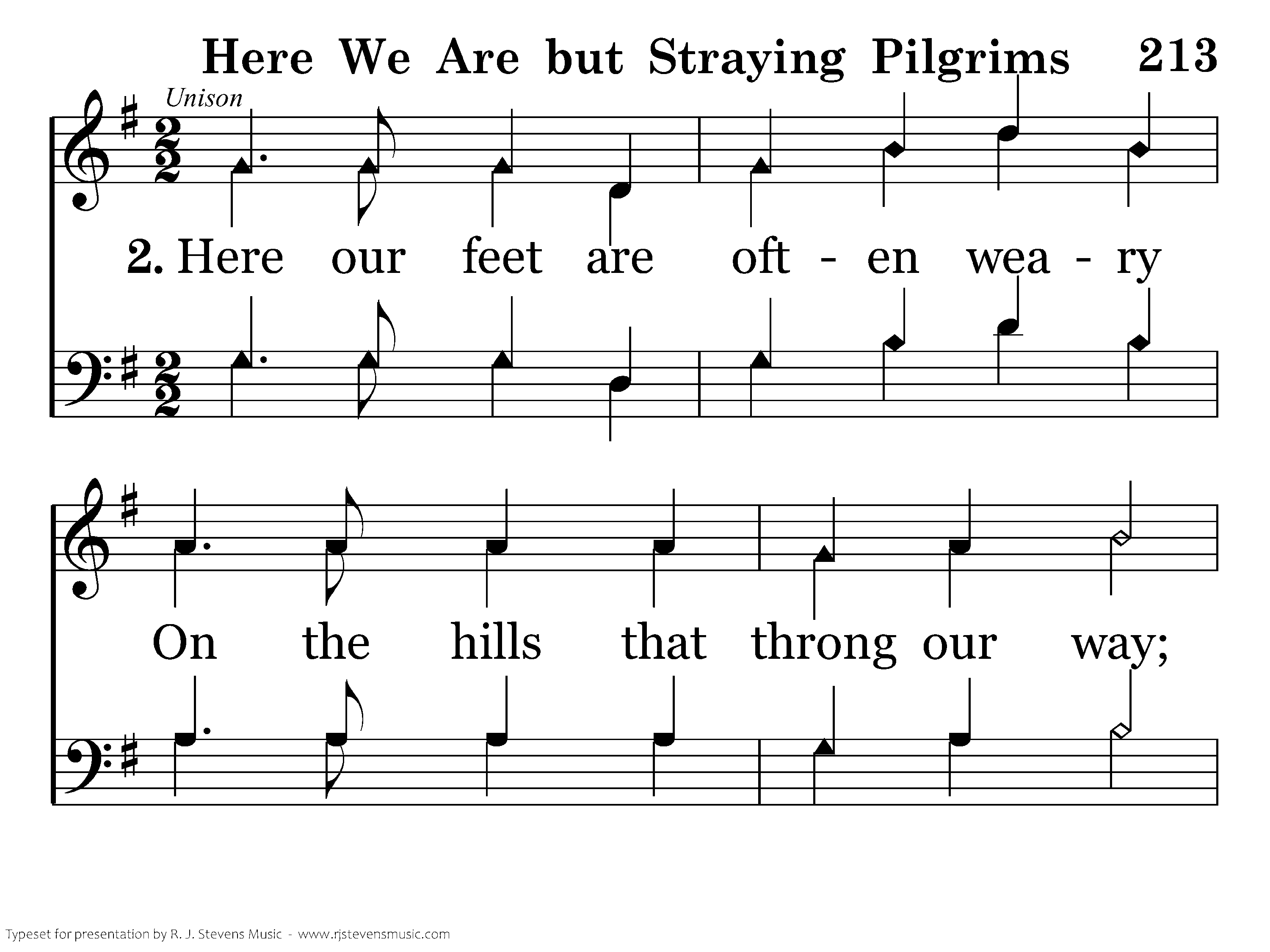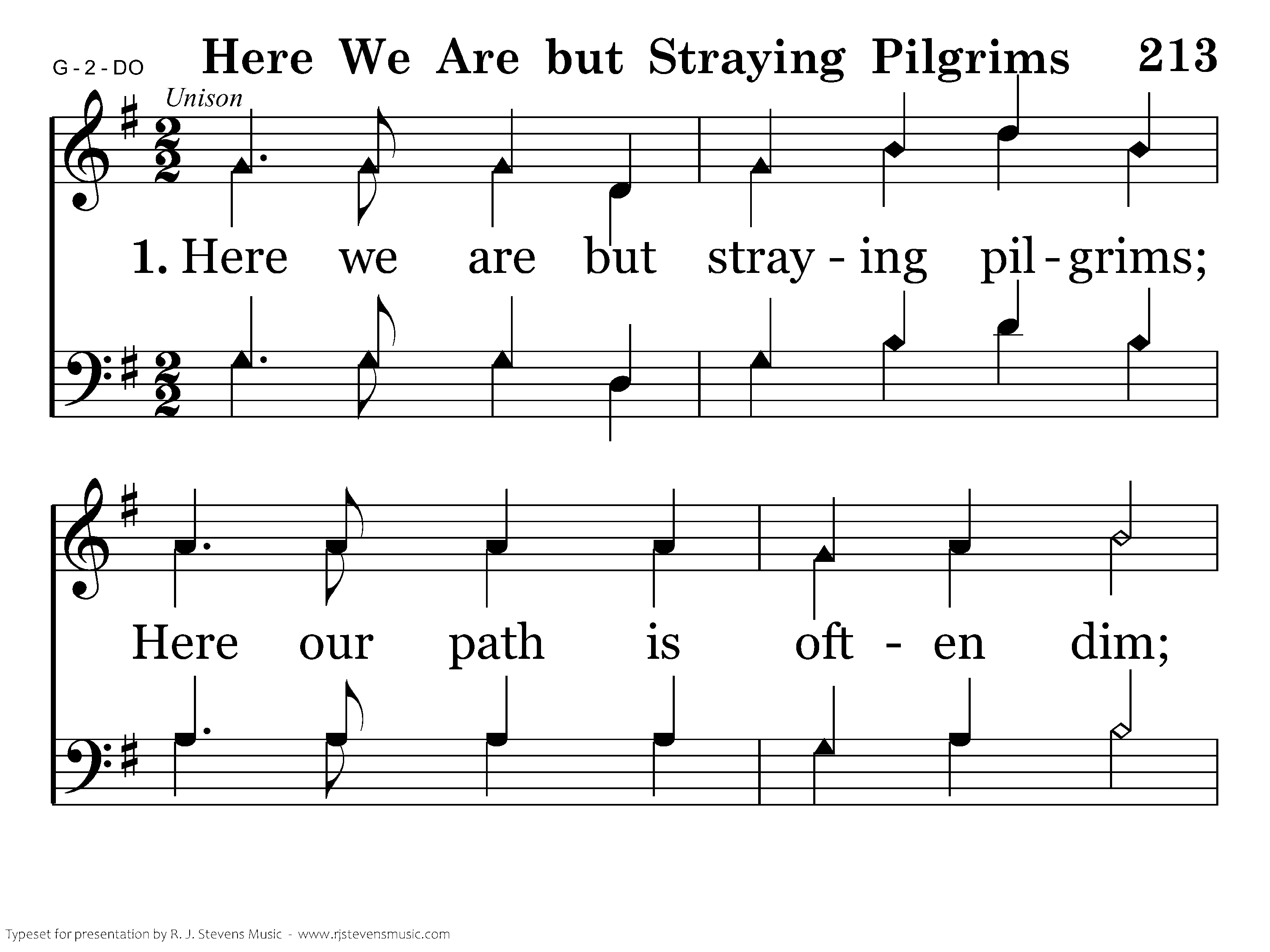 Here we are but straying pilgrims, here our path is often dim, but to cheer us on our journey, still we sing this wayside hymn: