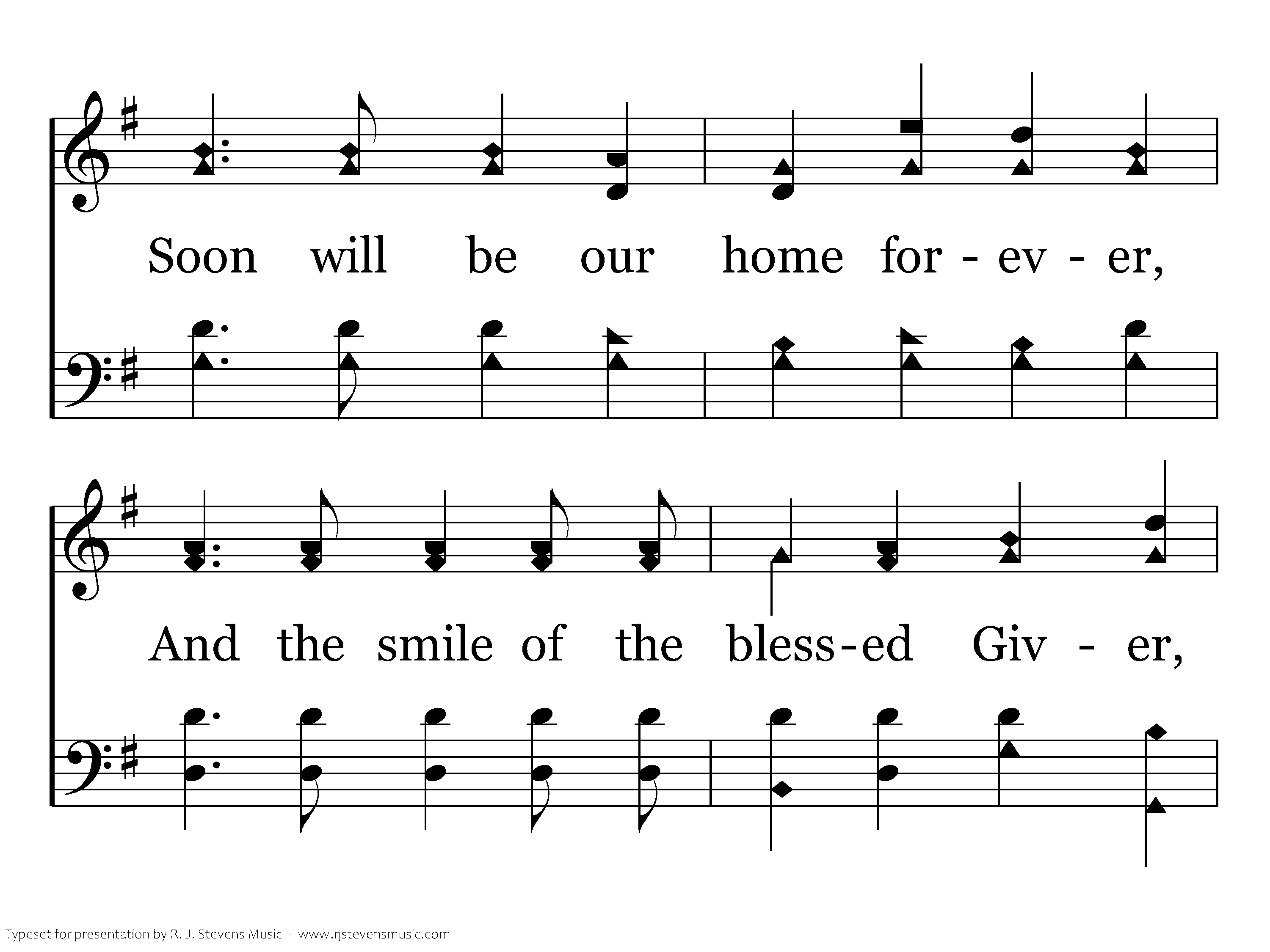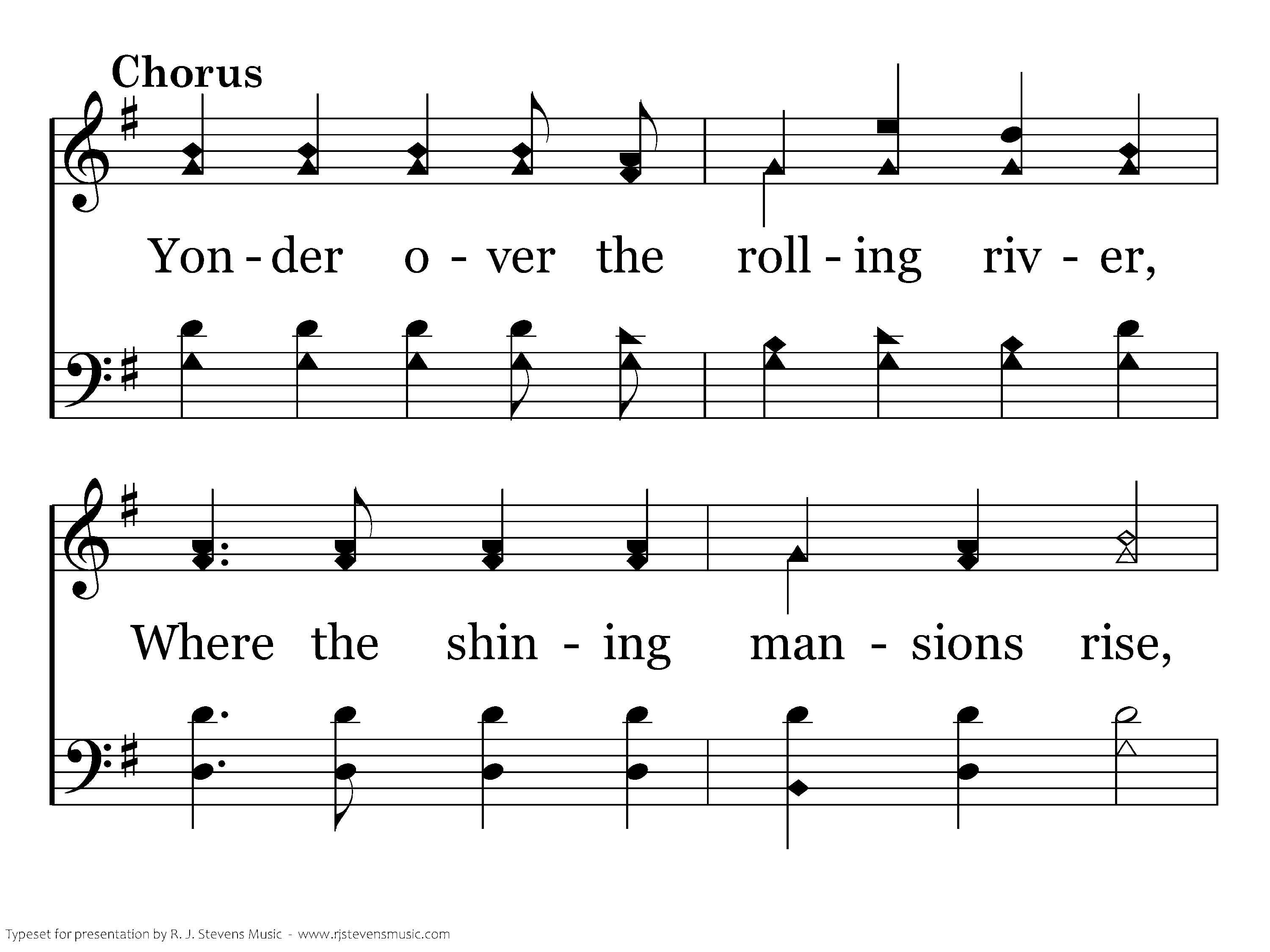 Yonder over the rolling river, where the shining mansions rise, soon will be our home forever, and the smile of the blessed giver, gladdens all our longing eyes.