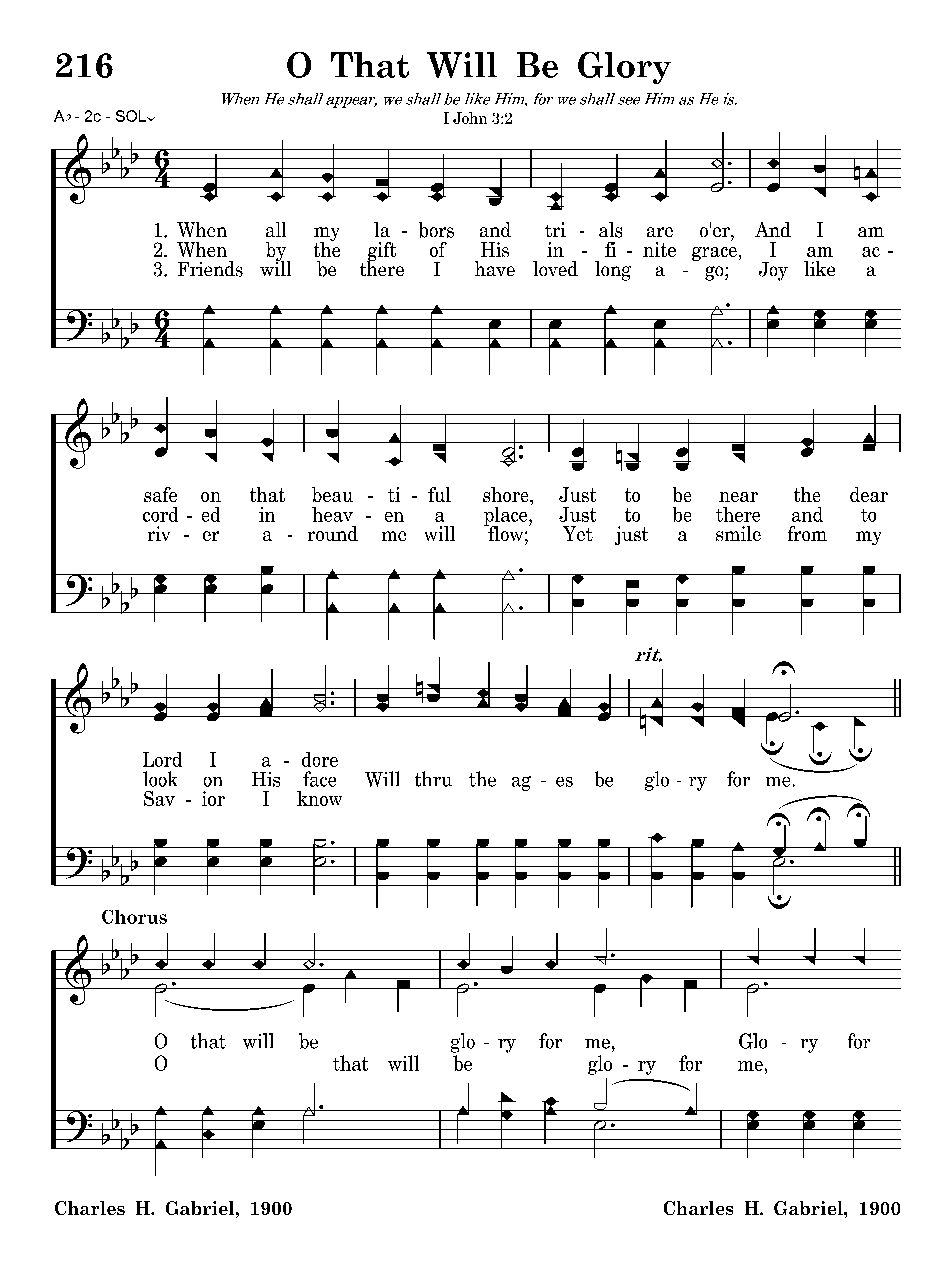 When all my labors and trials are o'er, And I am safe on that beautiful shore, Just to be near the dear Lord, I adore, Will thru the ages be glory for me.