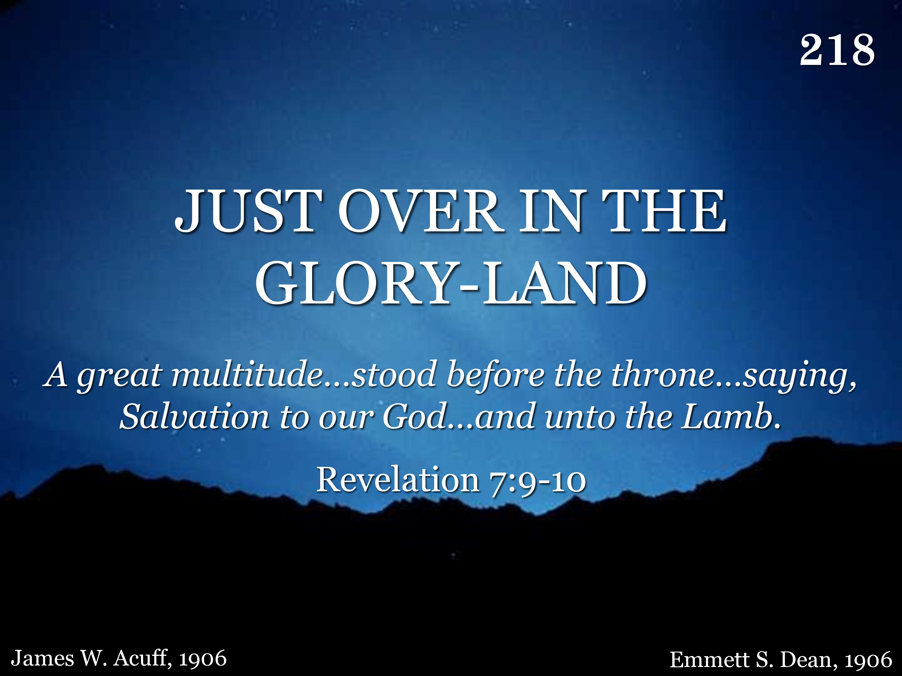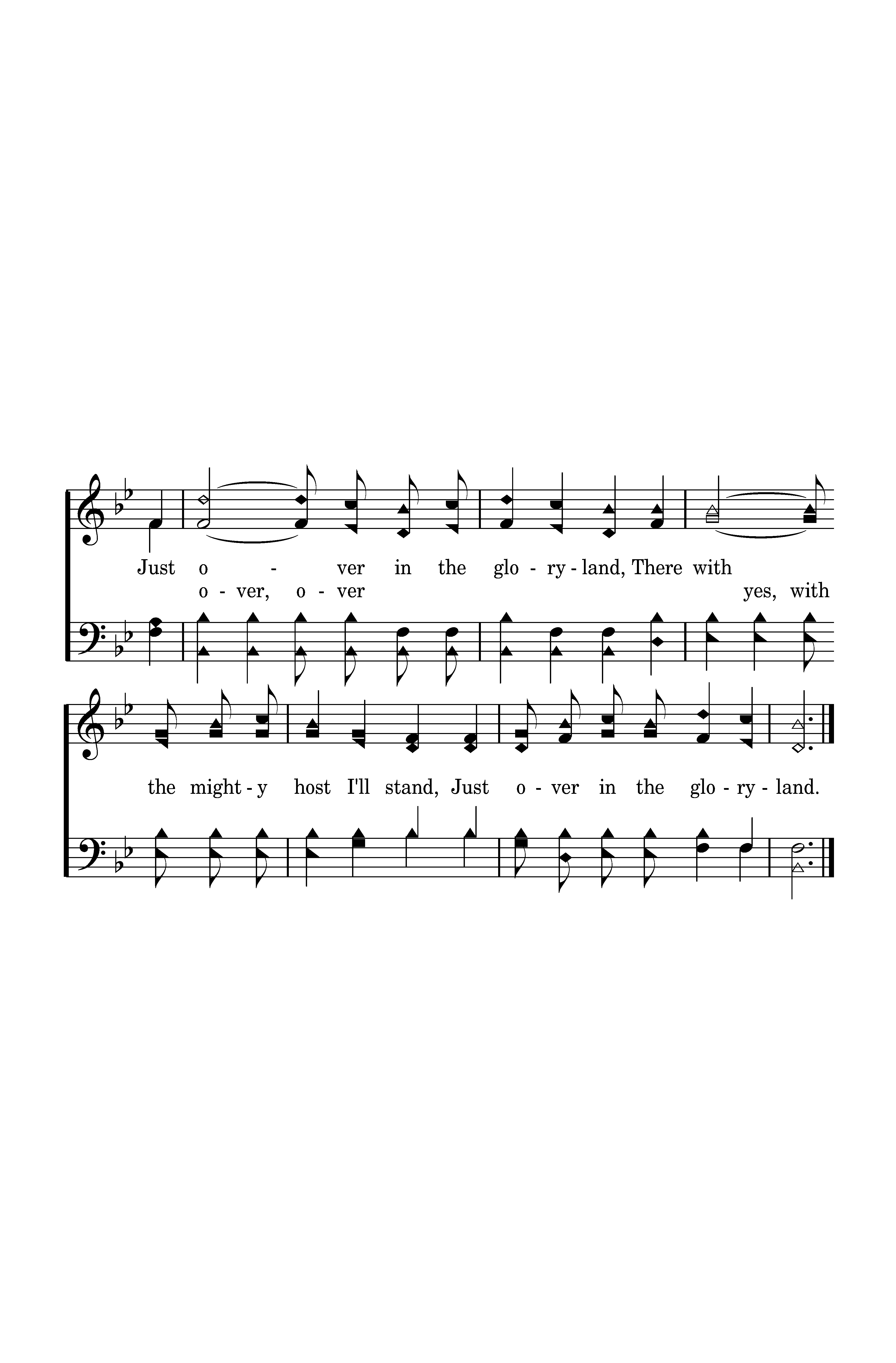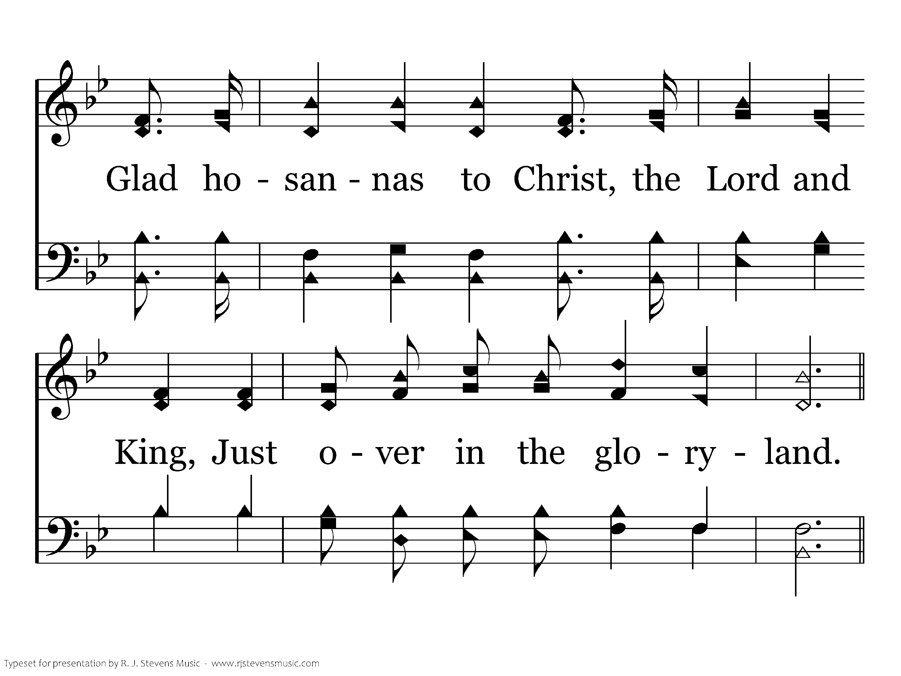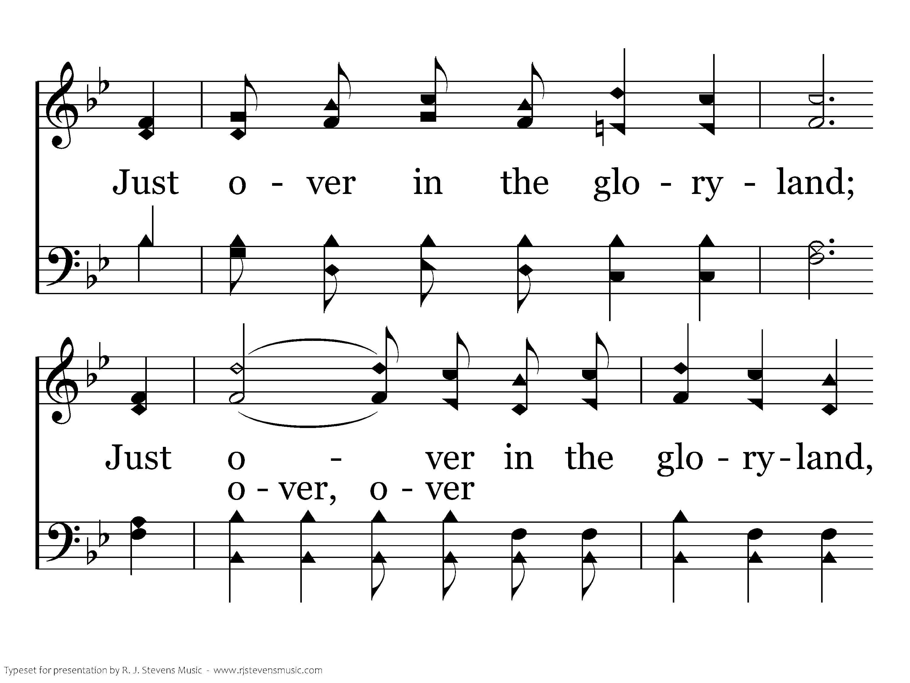 With the bloodwashed throng I will shout and sing, Just over in the gloryland; Glad hosannas to Christ the Lord and King, Just over in the gloryland.