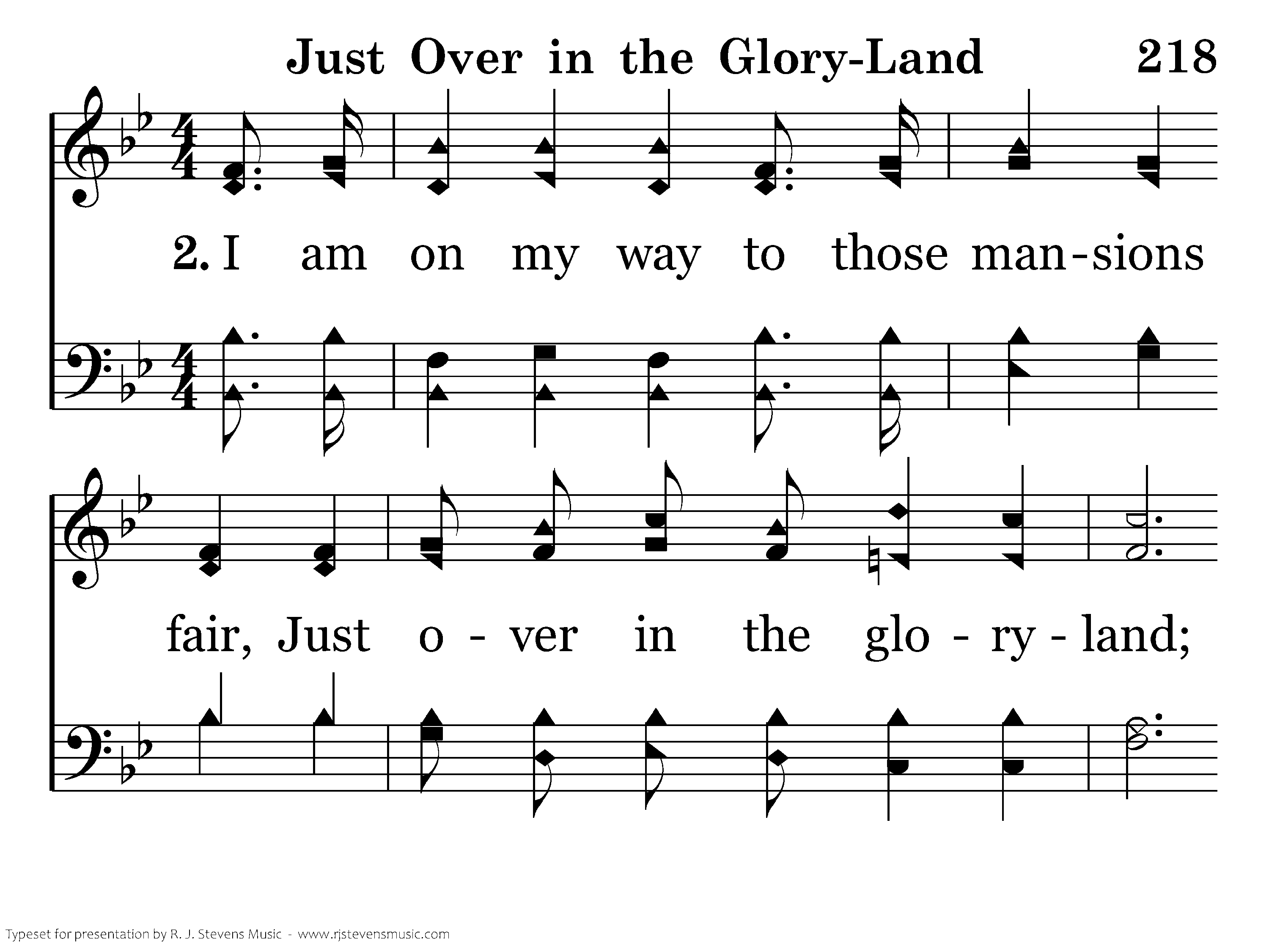 I am on my way to those mansions fair, Just over in the gloryland; There to sing God's praise and His glory share, Just over in the gloryland.