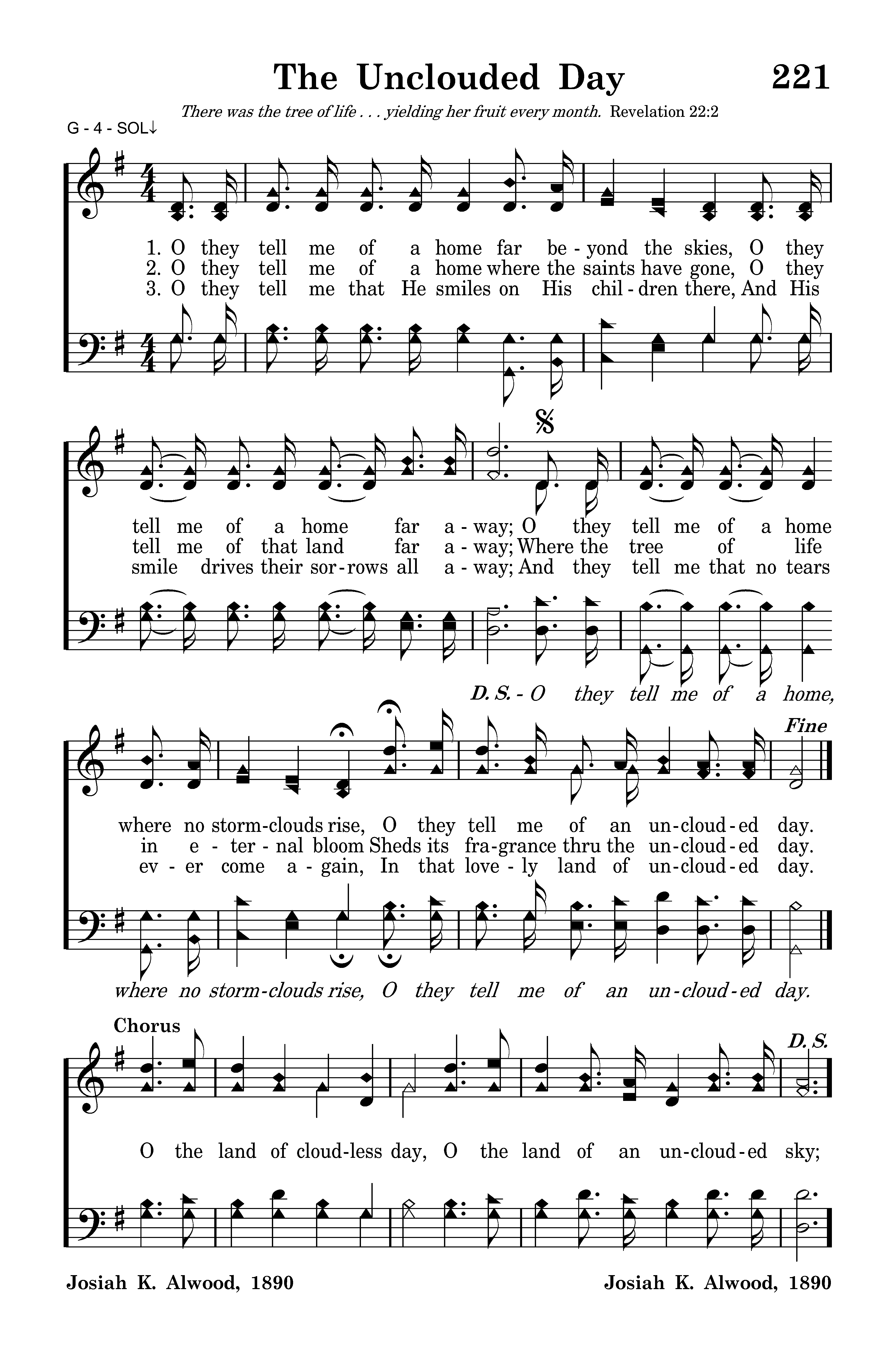 O the land of cloudless day, O the land of unclouded sky; O they tell me of a home where no stormclouds lie, O they tell me of an unclouded day.