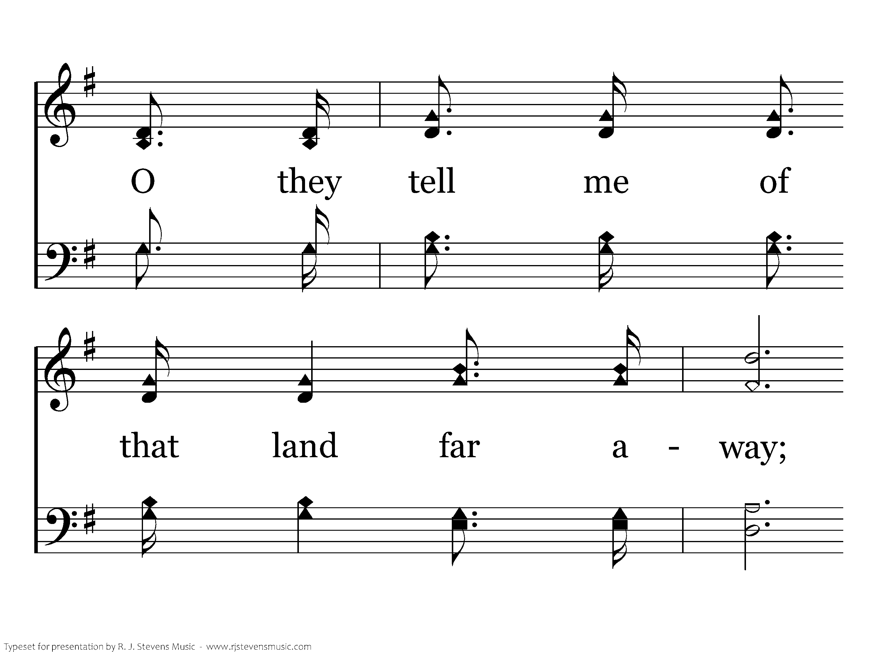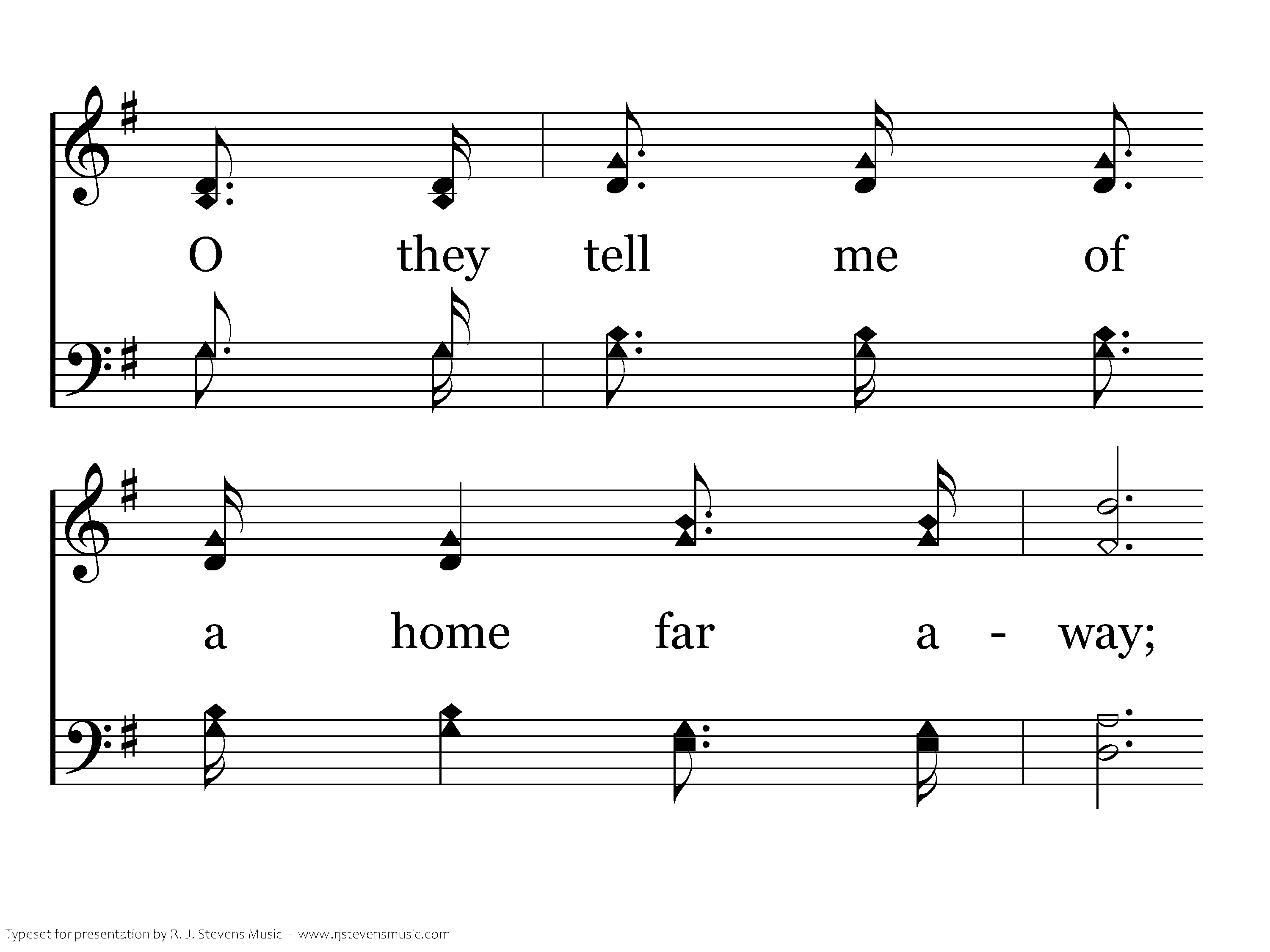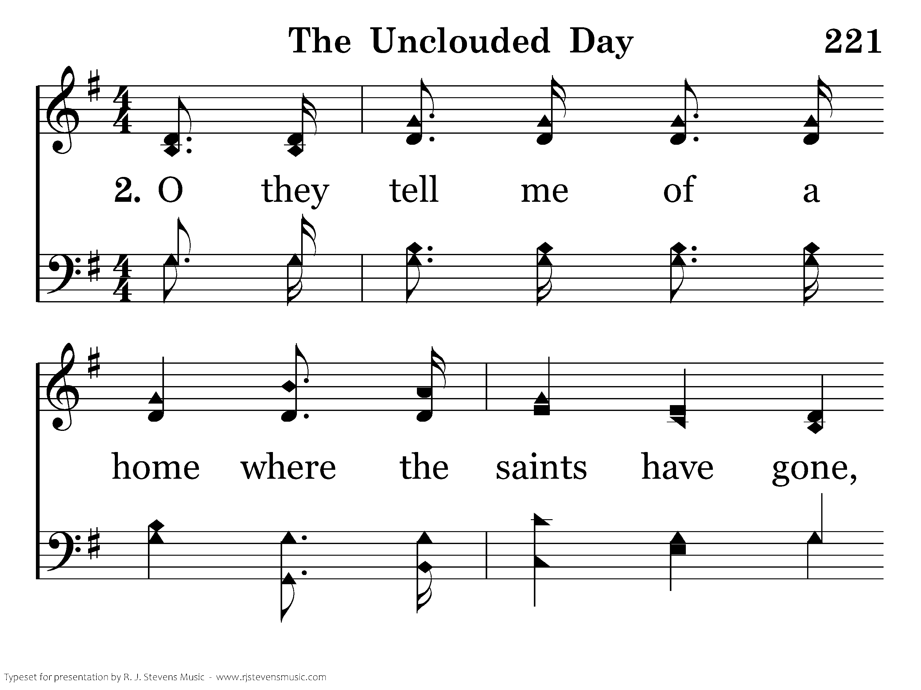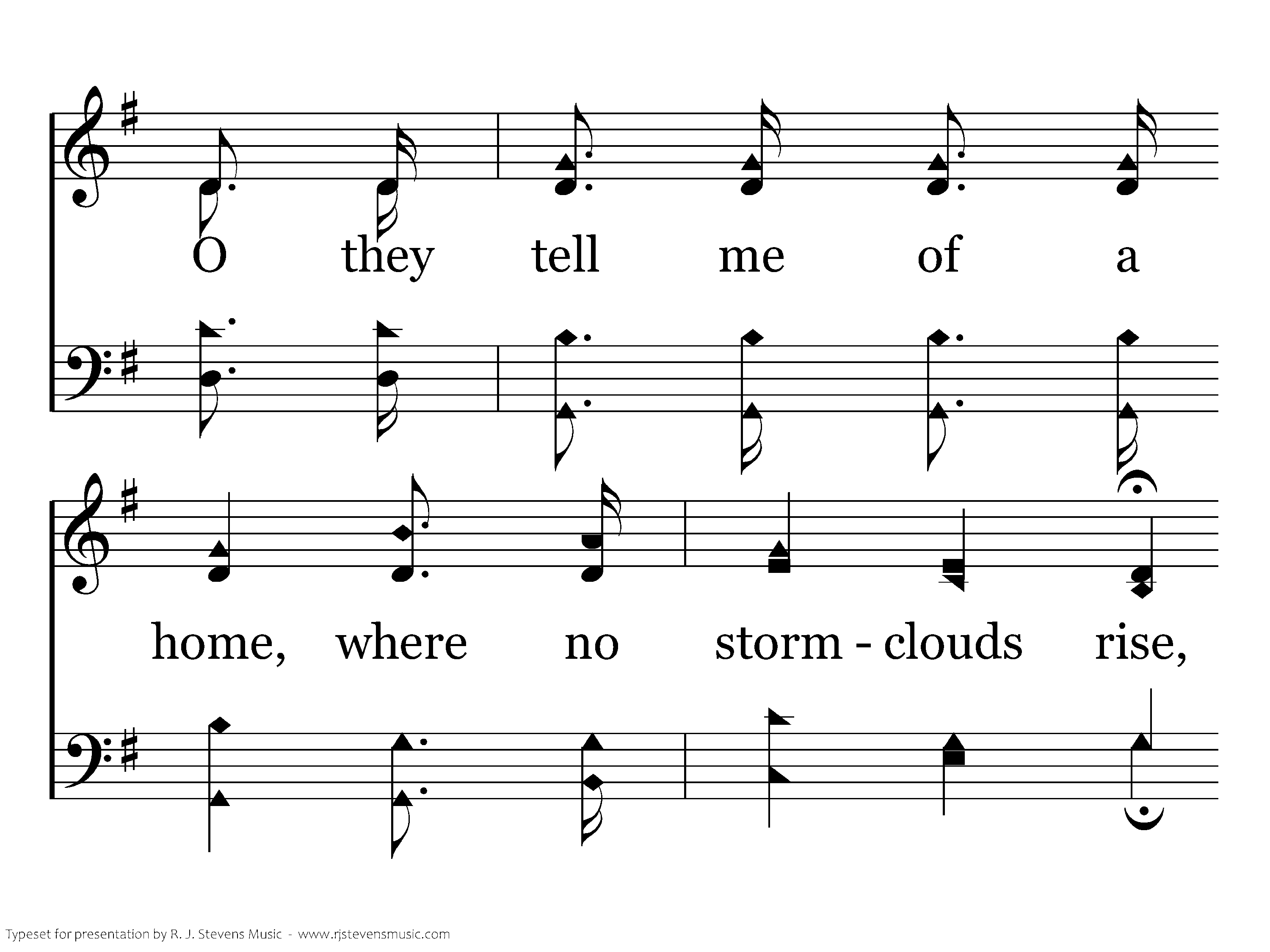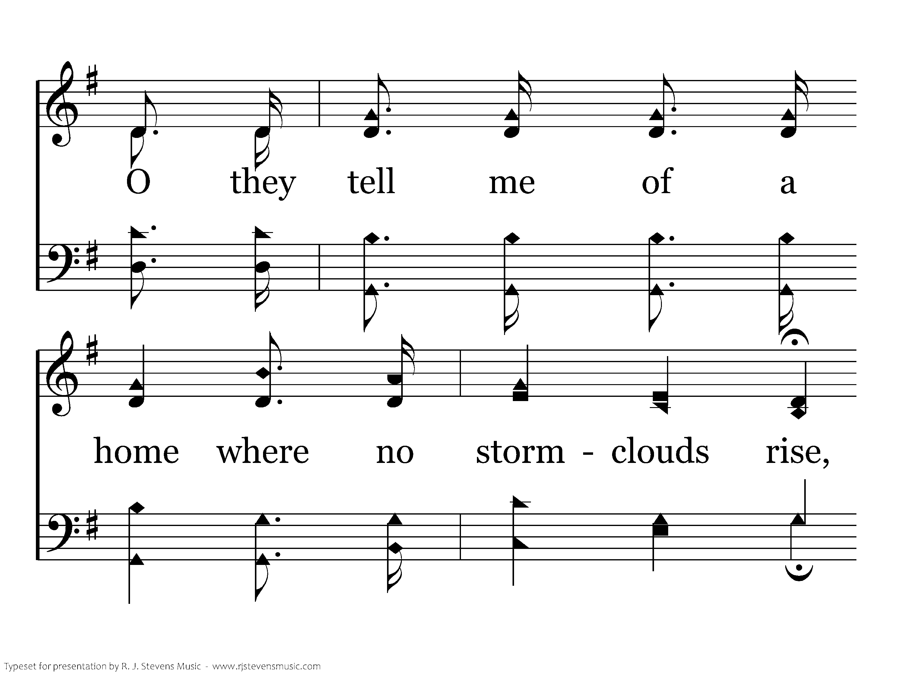 O they tell me of a home far beyond the skies, O they tell me of a home far away; O they tell me of a home where no stormclouds rise, O they tell me of an unclouded day.
