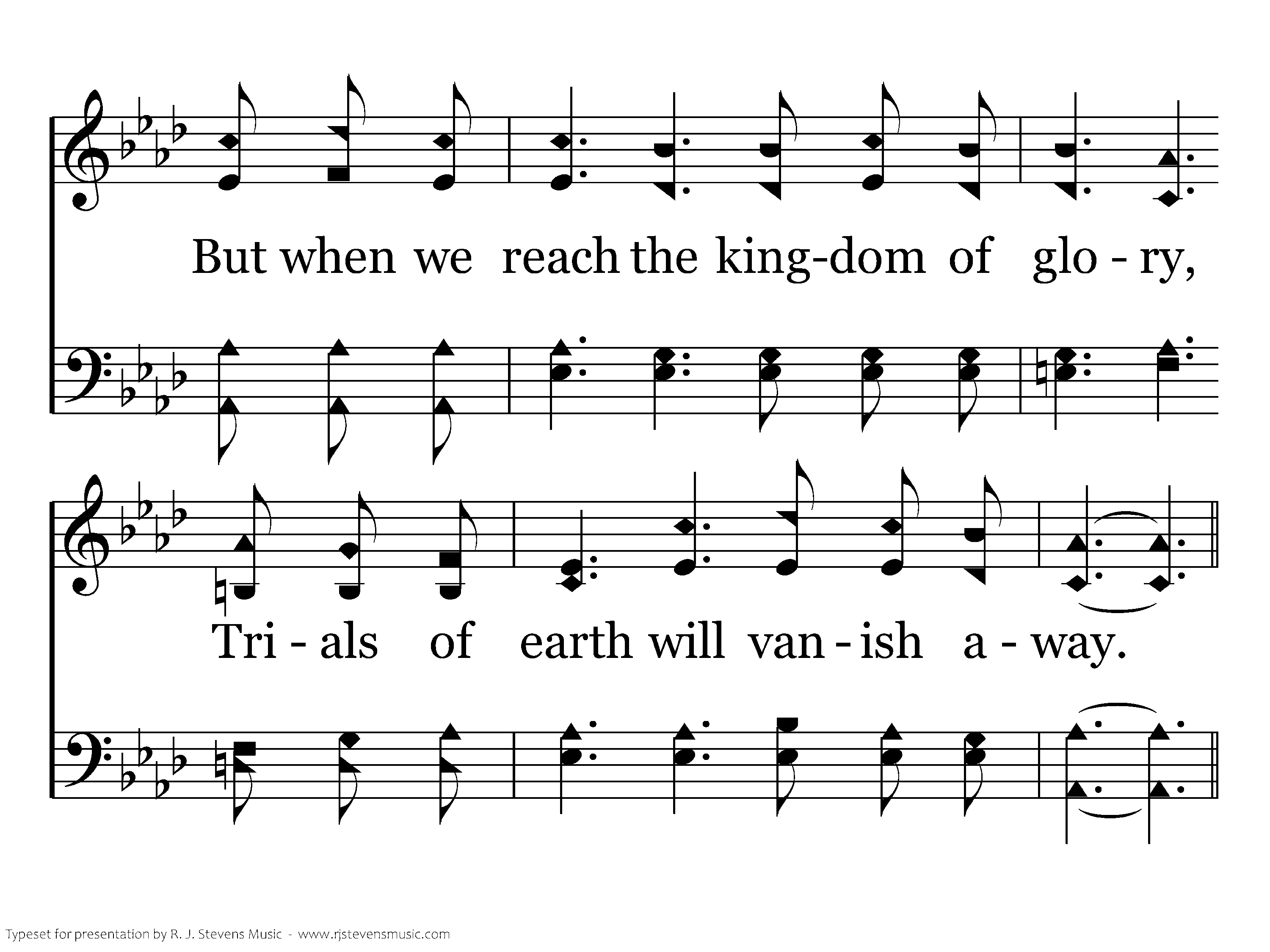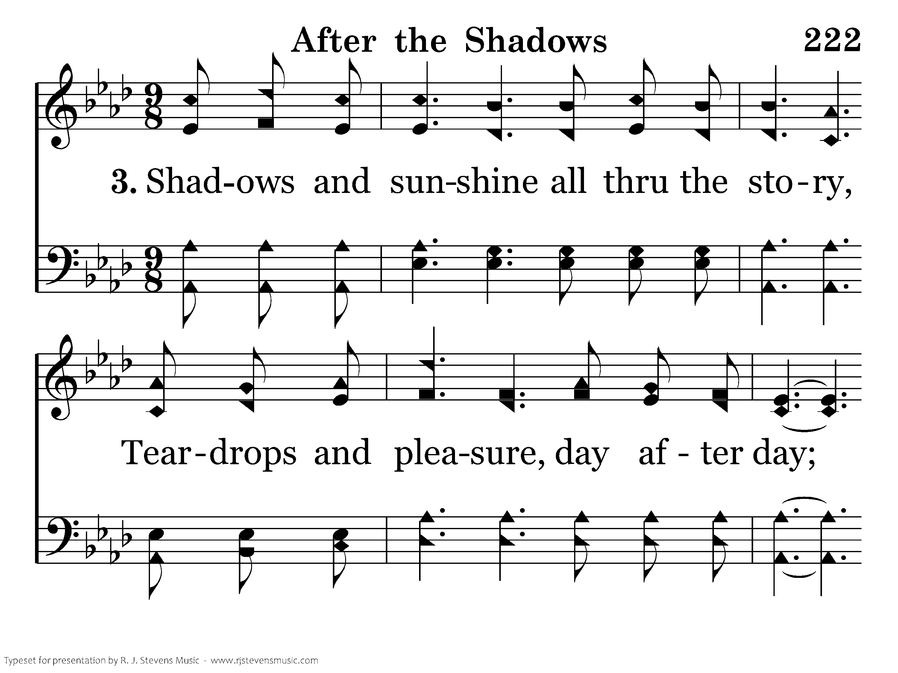 Shadows and sunshine all thru the story, Teardrops and pleasure, day after day; But when we reach the kingdom of glory, Trials of earth will vanish away.