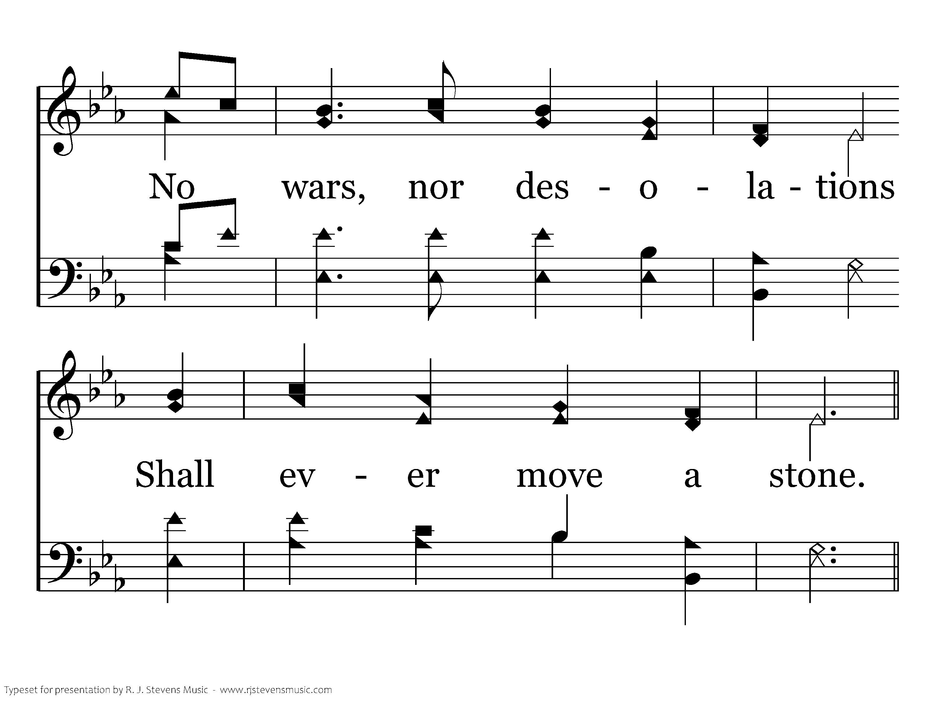 A city with foundations Firm as th'eternal throne, No wars, no desolations, Shall ever move a stone.