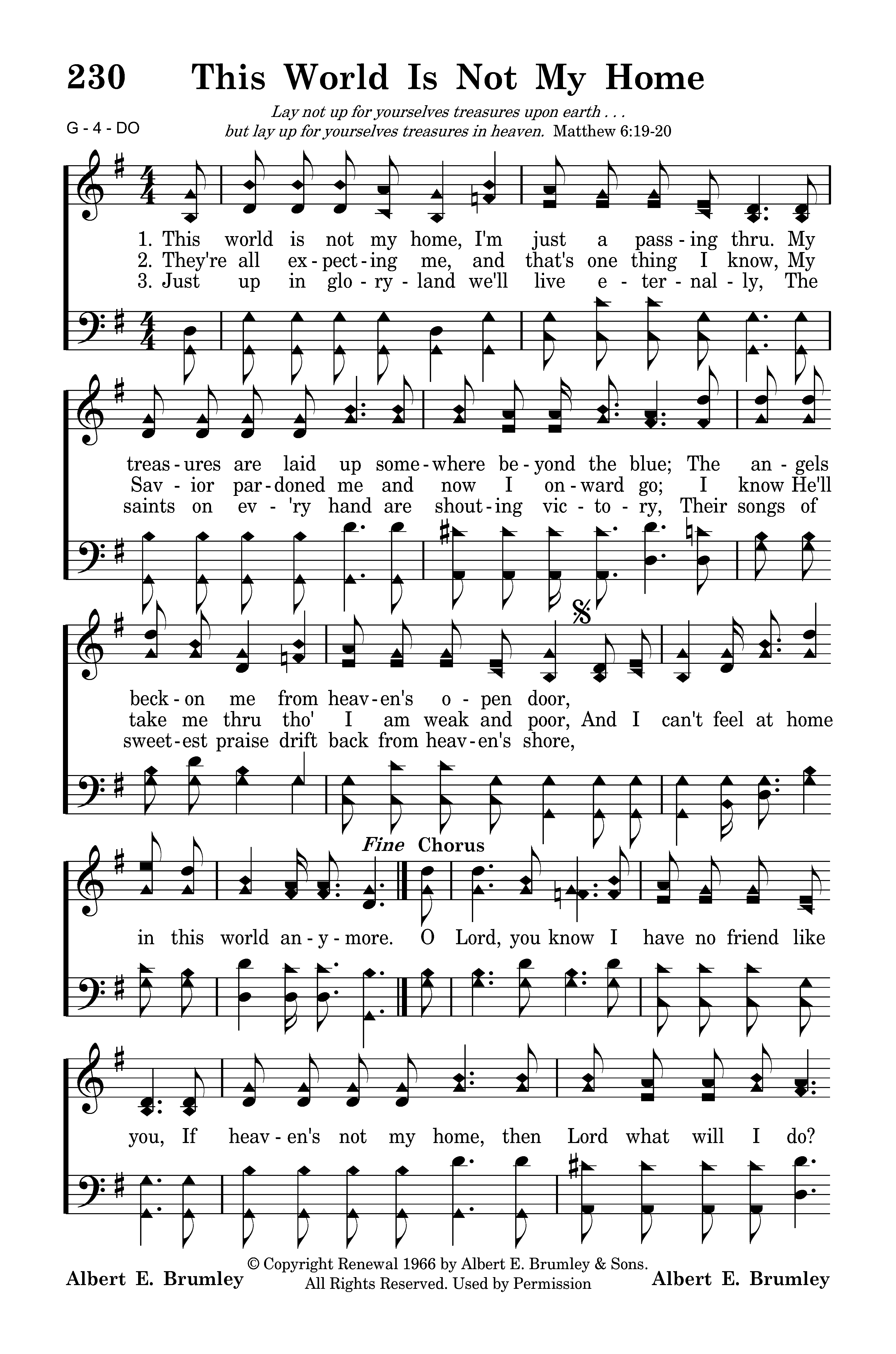 This world is not my home I'm just a passing thru, My treasures are laid up somewhere beyond the blue; The angels beckon me from heaven's open door, And I can't feel at home in this world anymore.