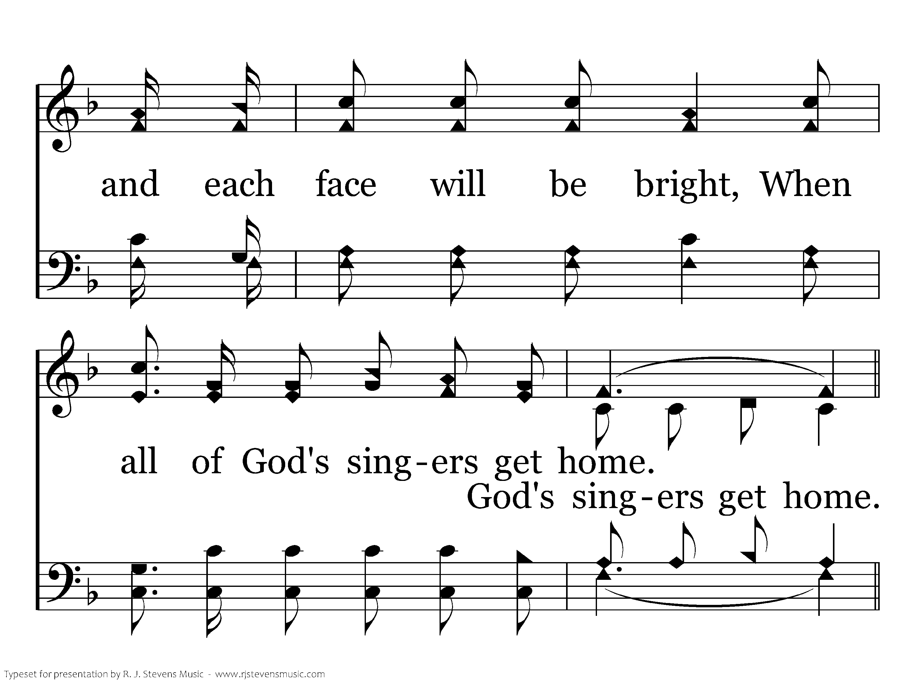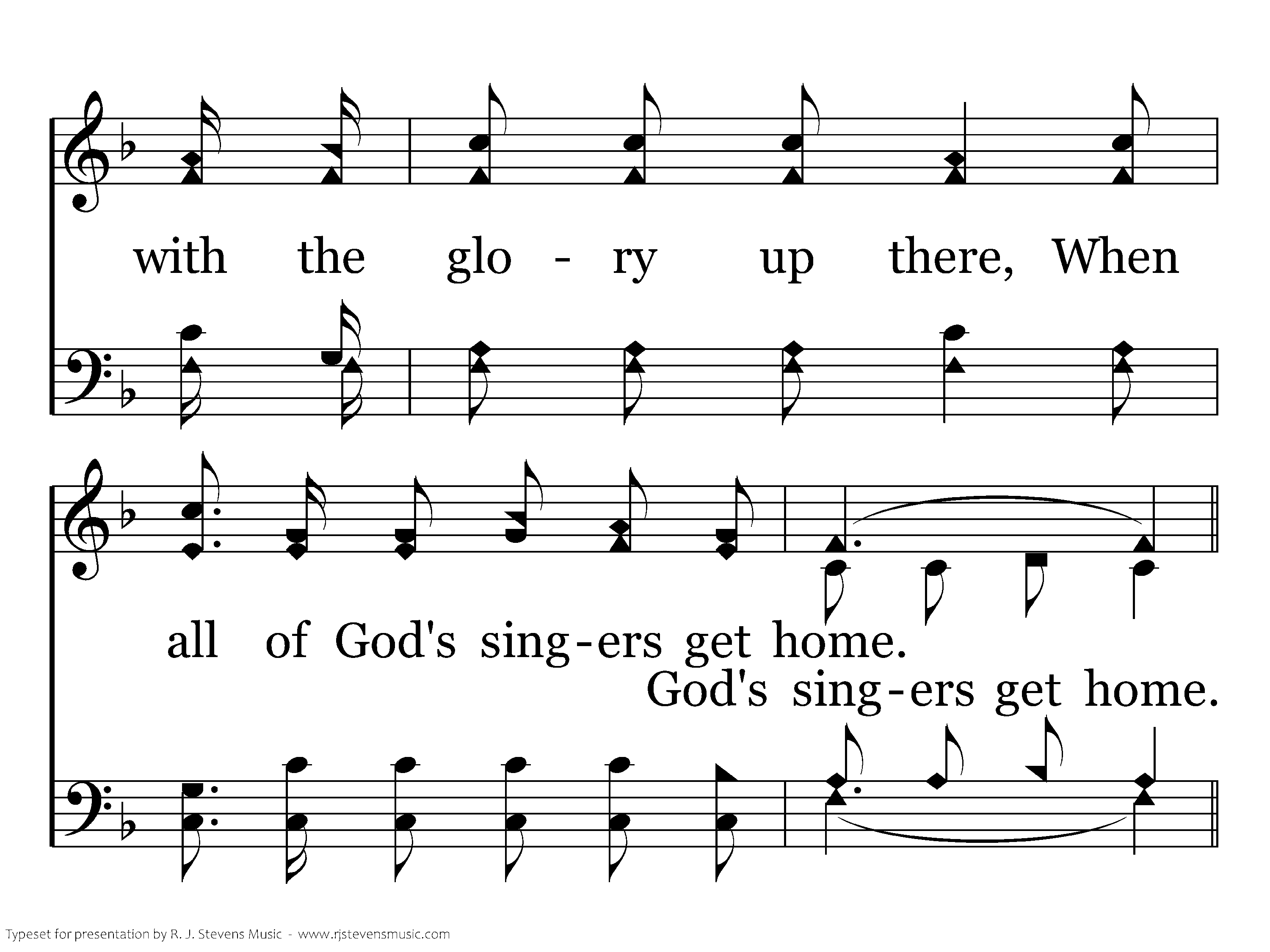 When all of God's singers get home, Where never a sorrow will come; There'll be no place like home, When all of God's singers get home.